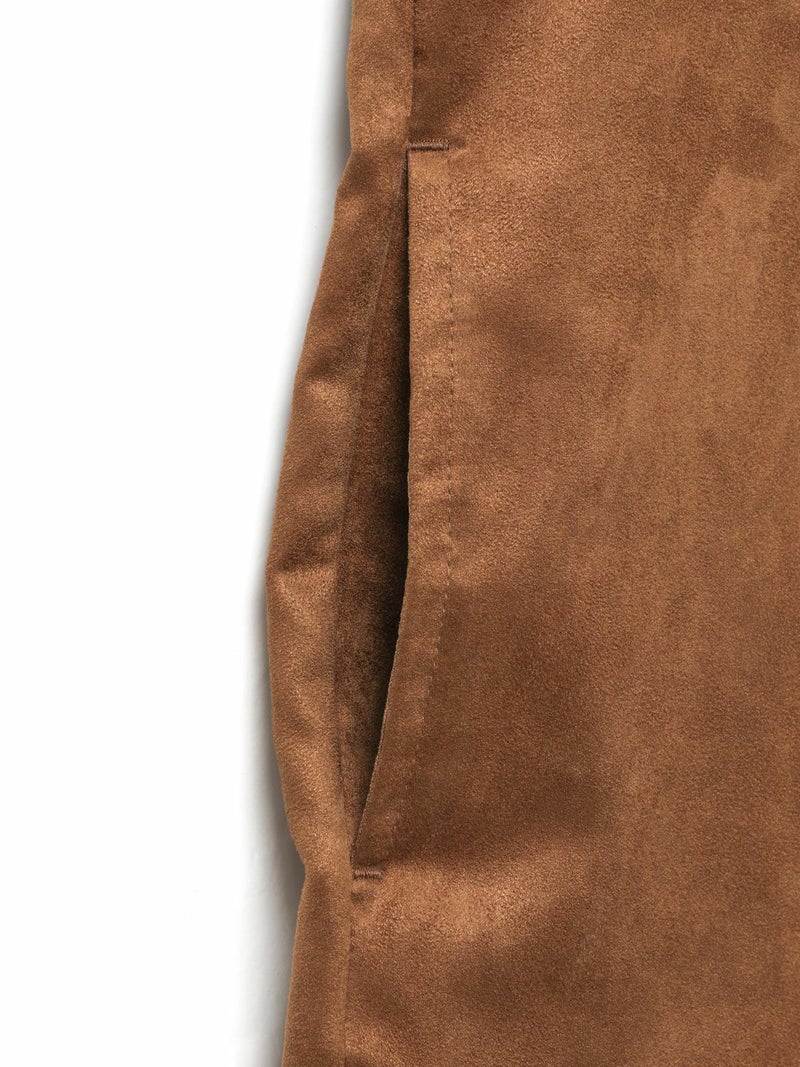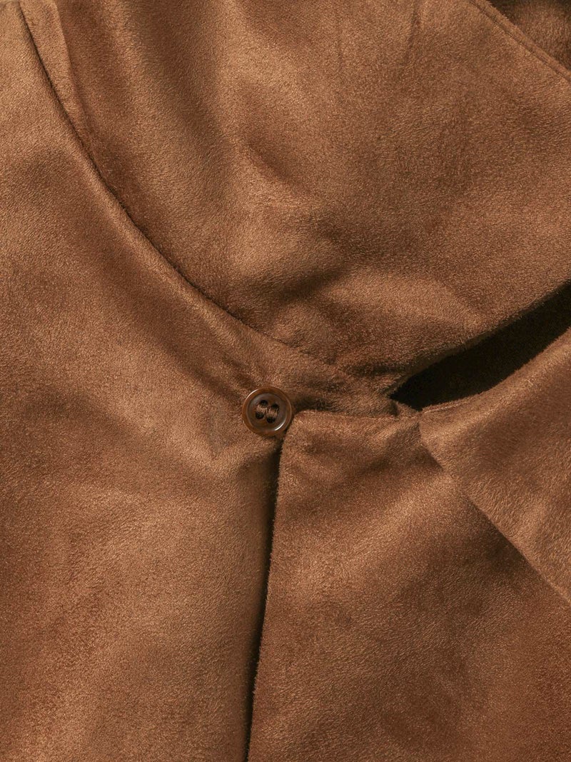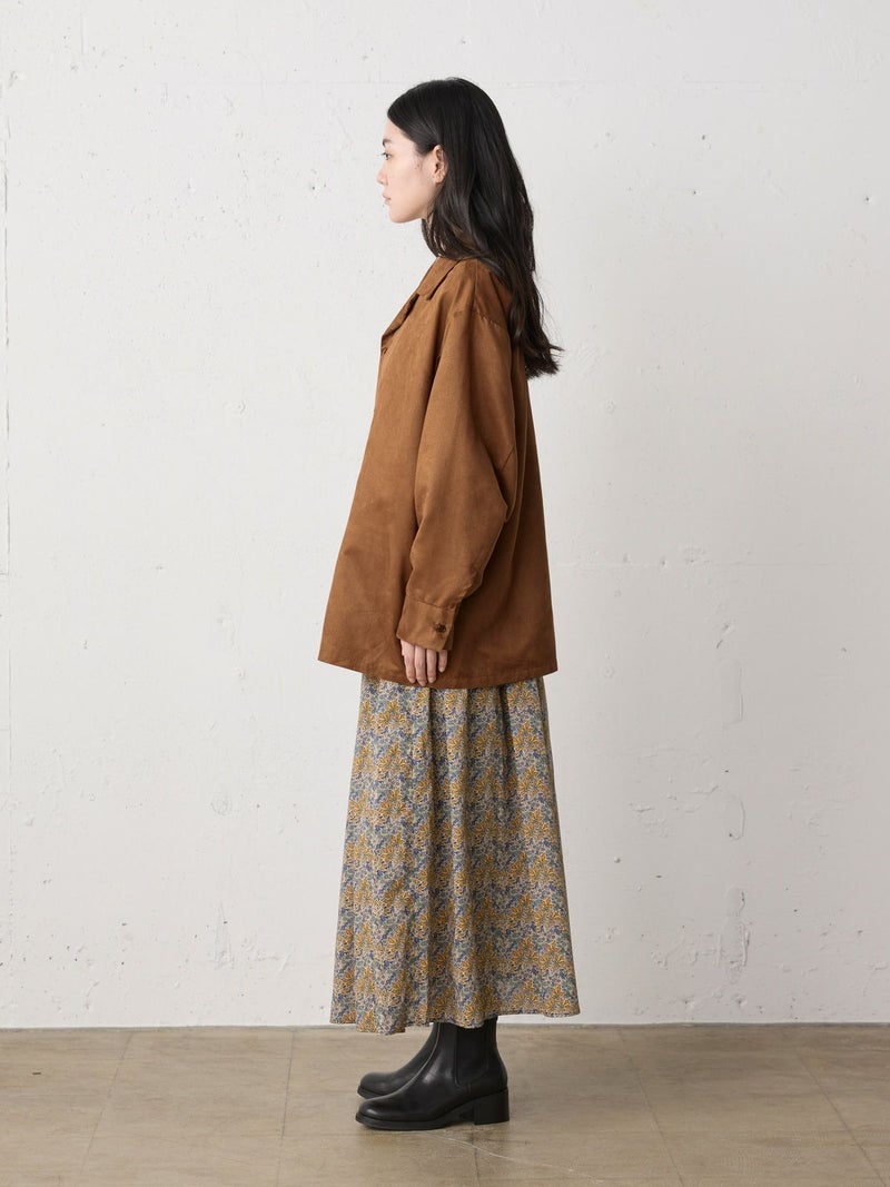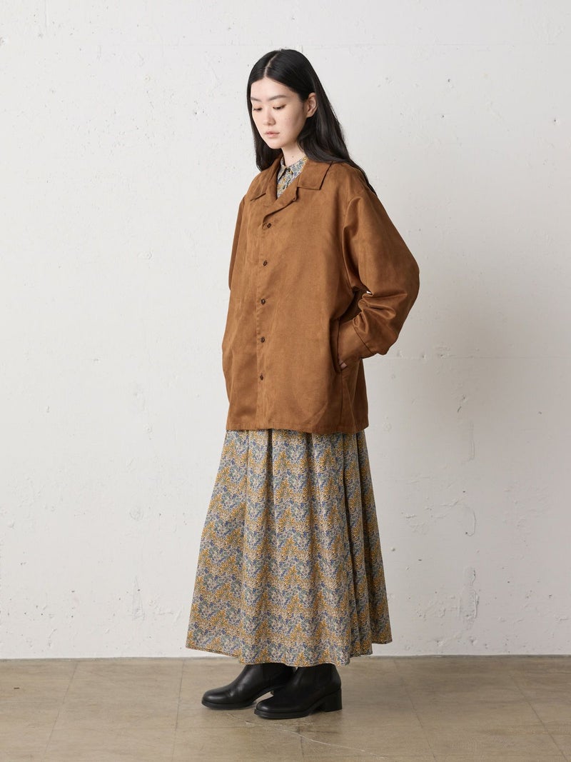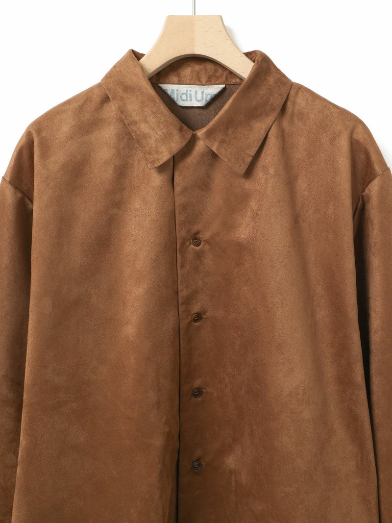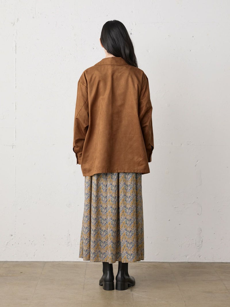しなやかな風合いときれいな表面感のあるフェイクスエードを使用したフェイクスエードシャツです。今年トレンド感のある風合いのシャツでデザインしました。ジャケット風のオープンカラーシャツでゆったりとしたワイルドな雰囲気が印象的。シャツインしたり羽織にしたり、コーディネートを楽しむのがオススメです。同シリーズ4-730010/フェイクスエードジャケットも展開。