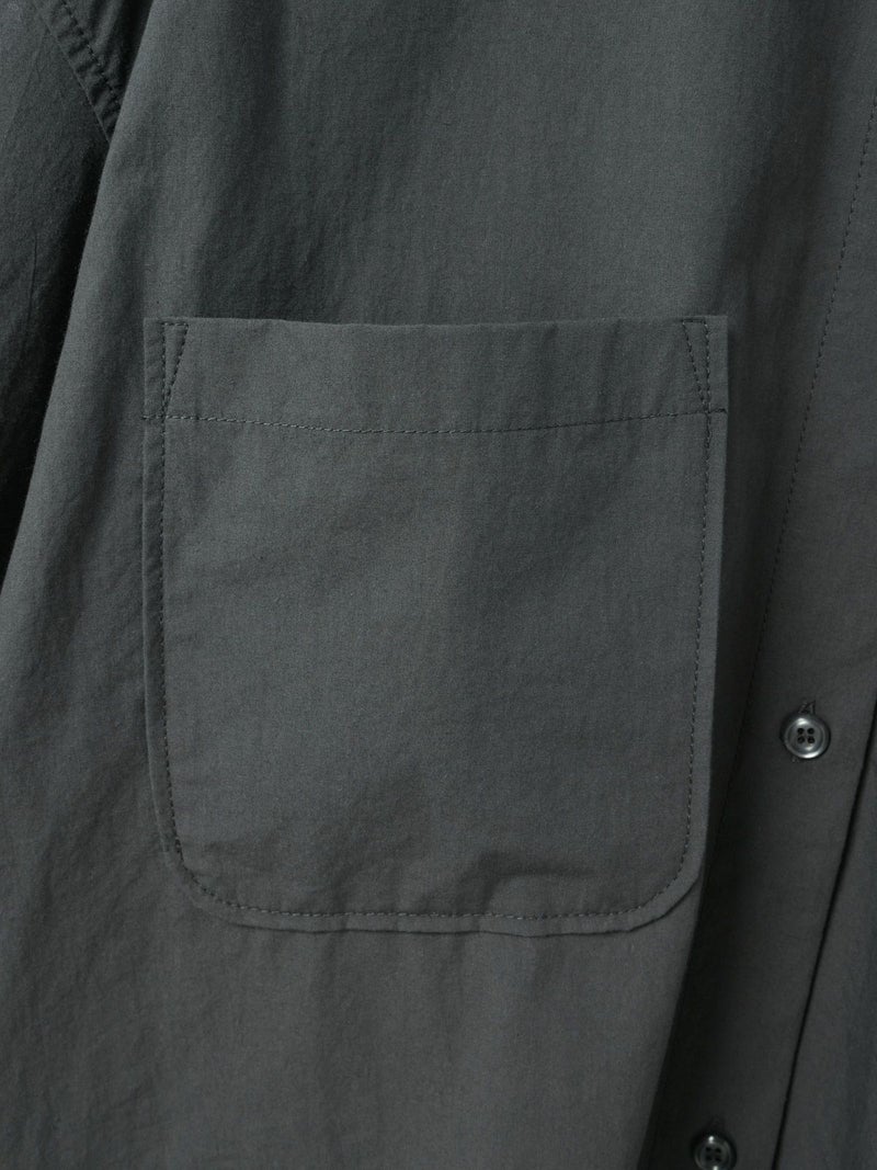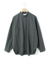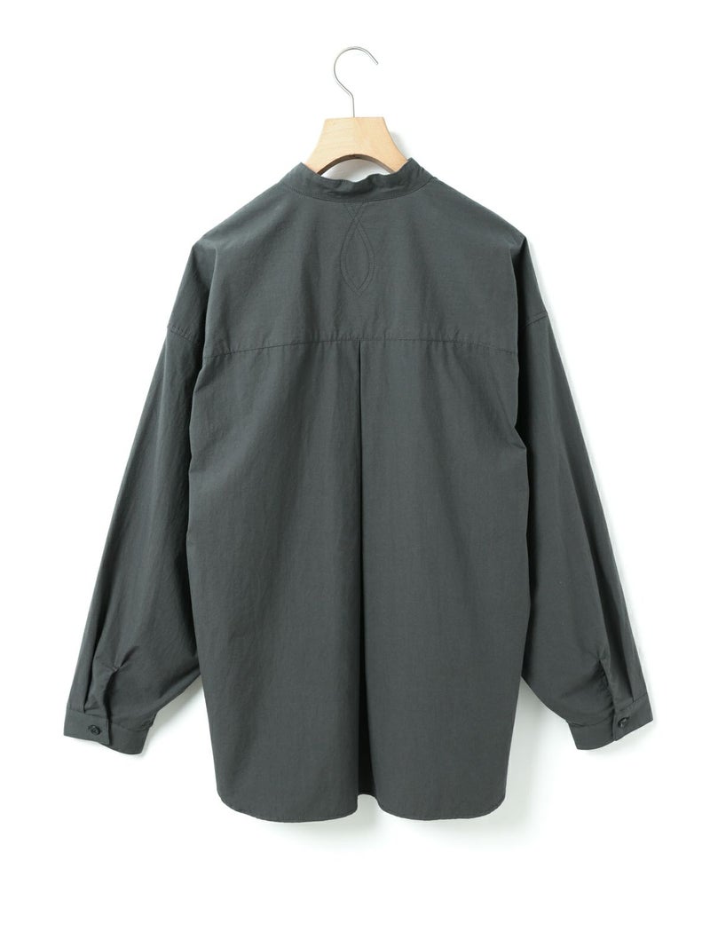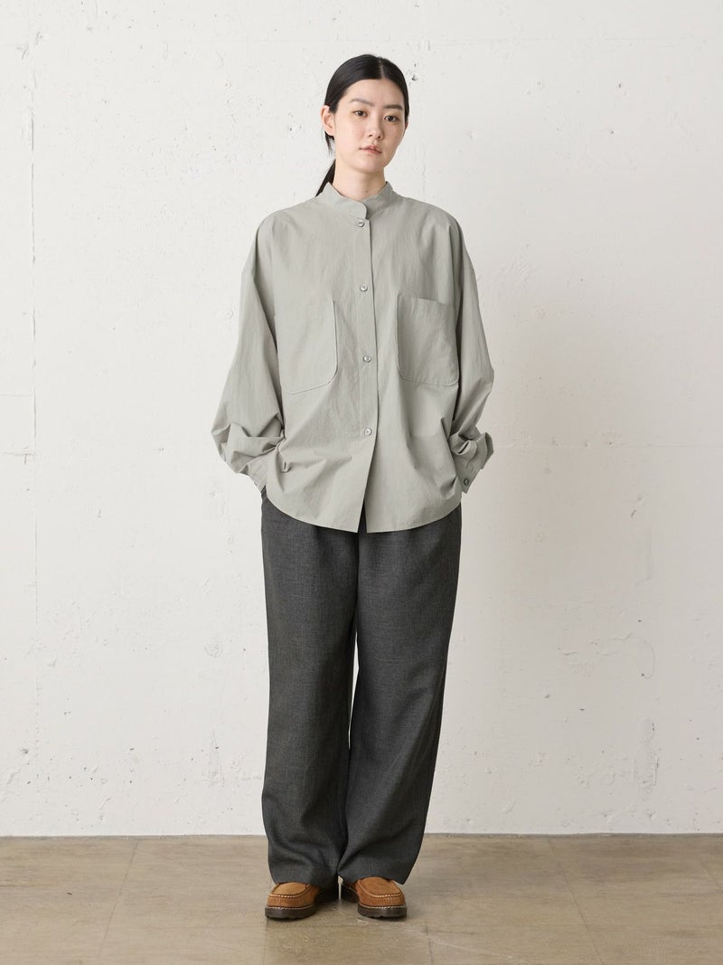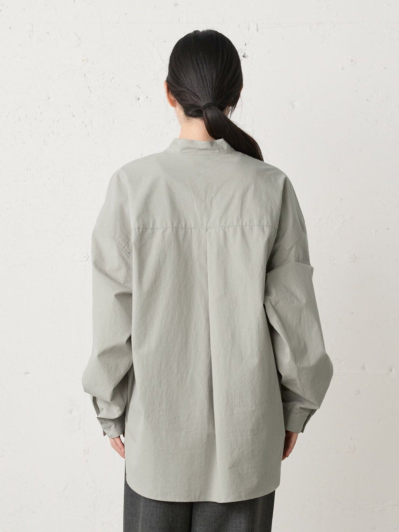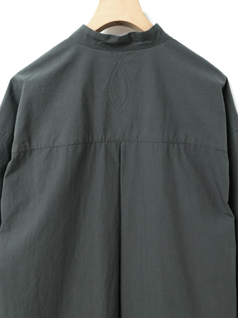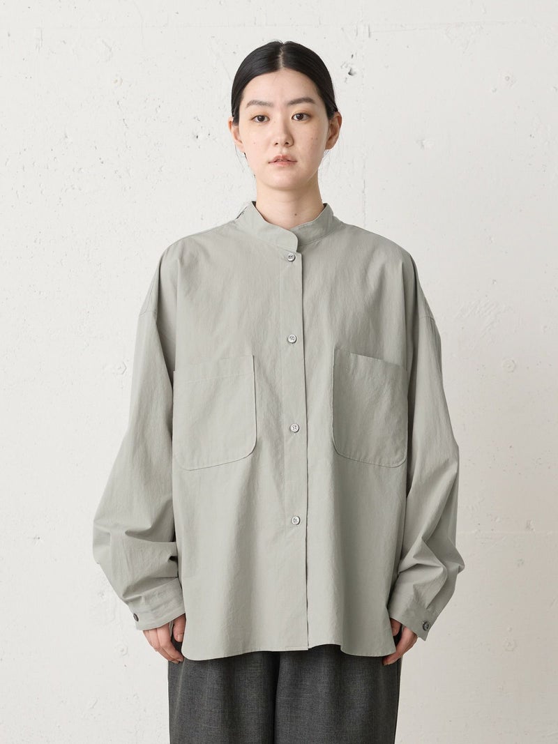 近江産地の染色技法を用いたタイプライターを使用したスタンドカラーワイドシャツです。染色前に生地を繰り返し揉みこむことで、洗いざらしのシワ感と膨らみが生まれます。ナチュラルな雰囲気ながら、しっとりと柔らかく仕上がった生地は近江産地の丁寧な仕事を感じられる1枚。スタンドカラーはボタン位置を下に設け、マオカラーのような雰囲気に仕上げたワイドシャツ。胸元の大きなポケットが印象的なワーク調のデザインがポイントです。