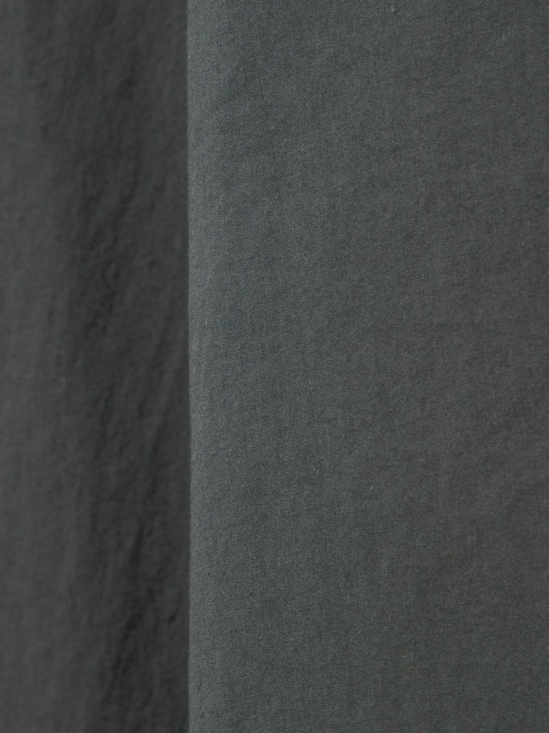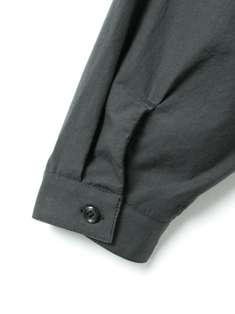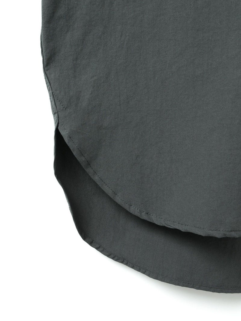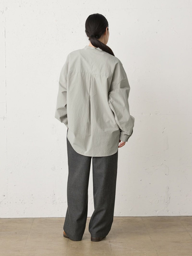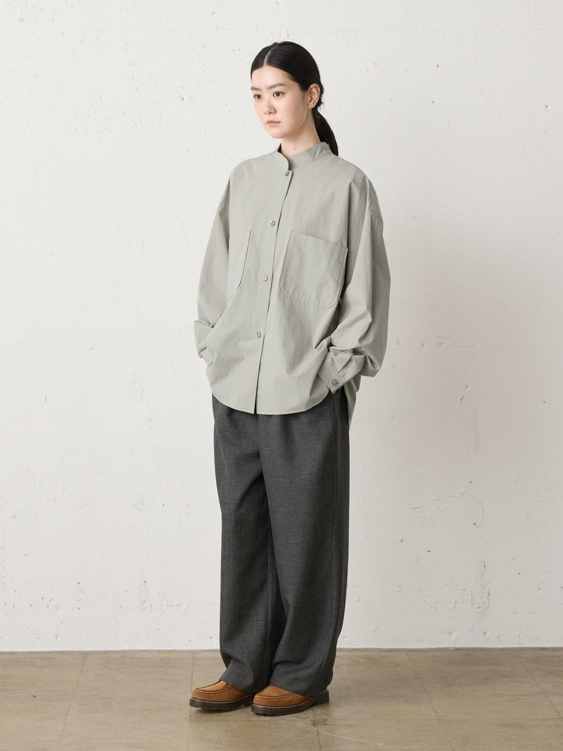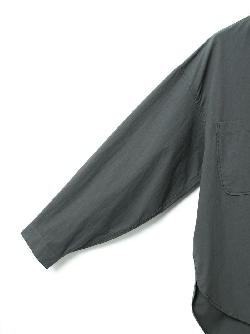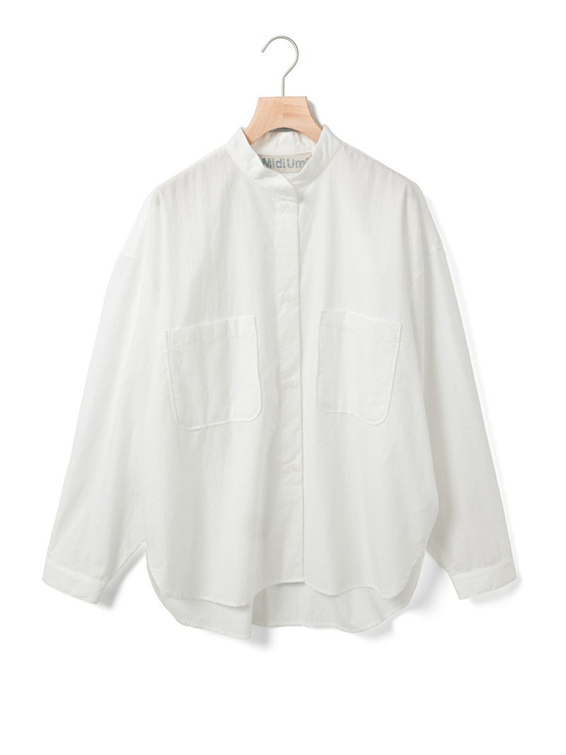 近江産地の染色技法を用いたタイプライターを使用したスタンドカラーワイドシャツです。染色前に生地を繰り返し揉みこむことで、洗いざらしのシワ感と膨らみが生まれます。ナチュラルな雰囲気ながら、しっとりと柔らかく仕上がった生地は近江産地の丁寧な仕事を感じられる1枚。スタンドカラーはボタン位置を下に設け、マオカラーのような雰囲気に仕上げたワイドシャツ。胸元の大きなポケットが印象的なワーク調のデザインがポイントです。