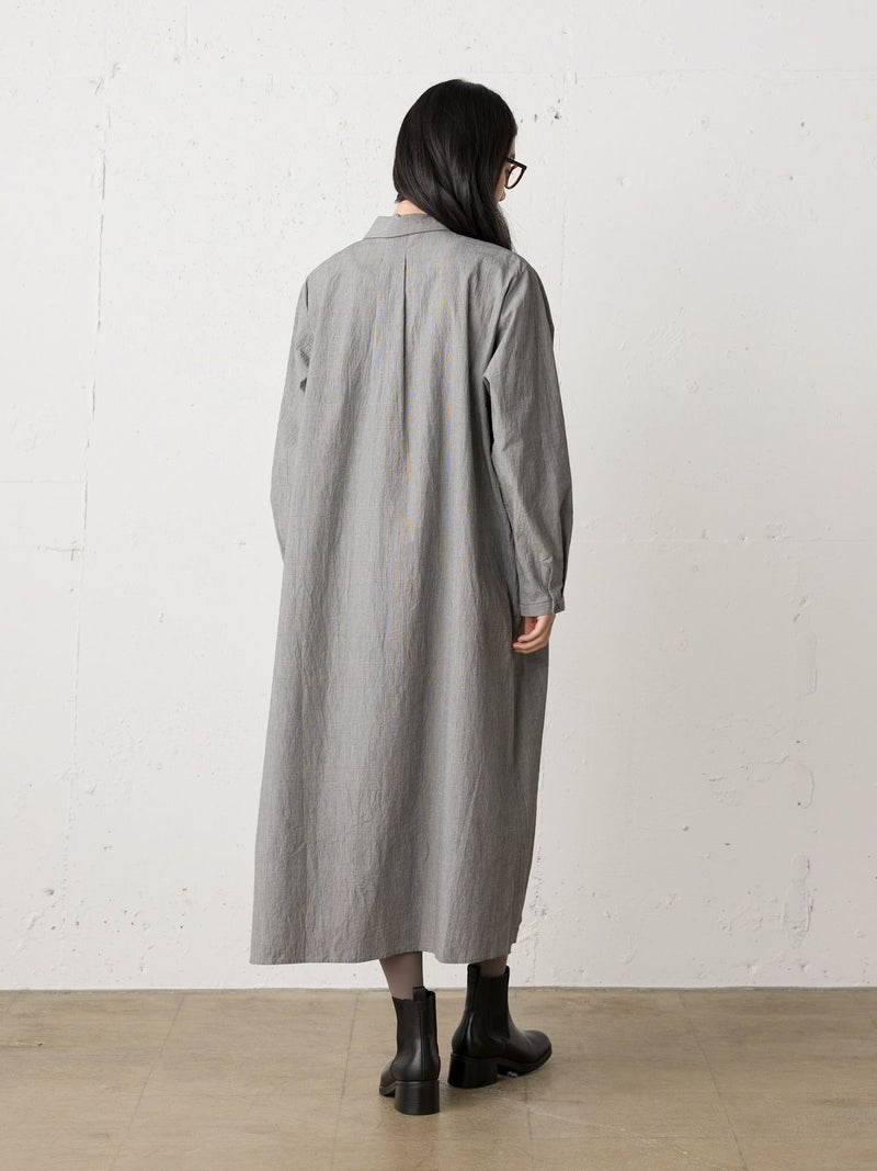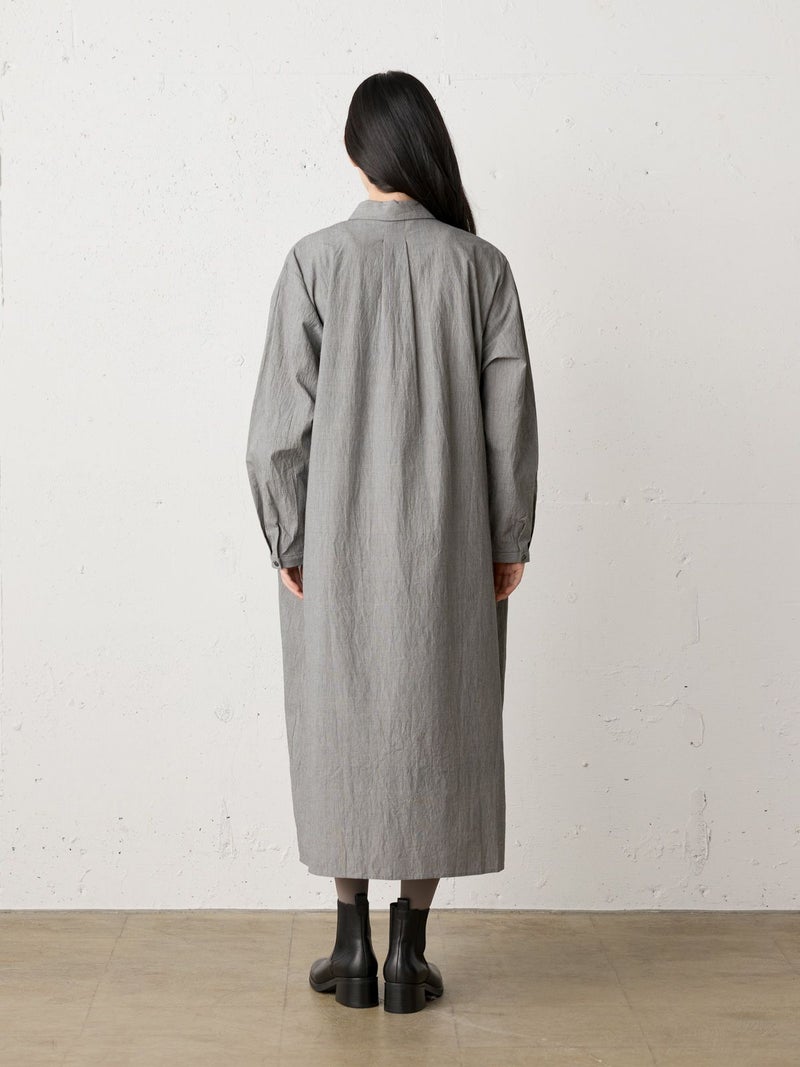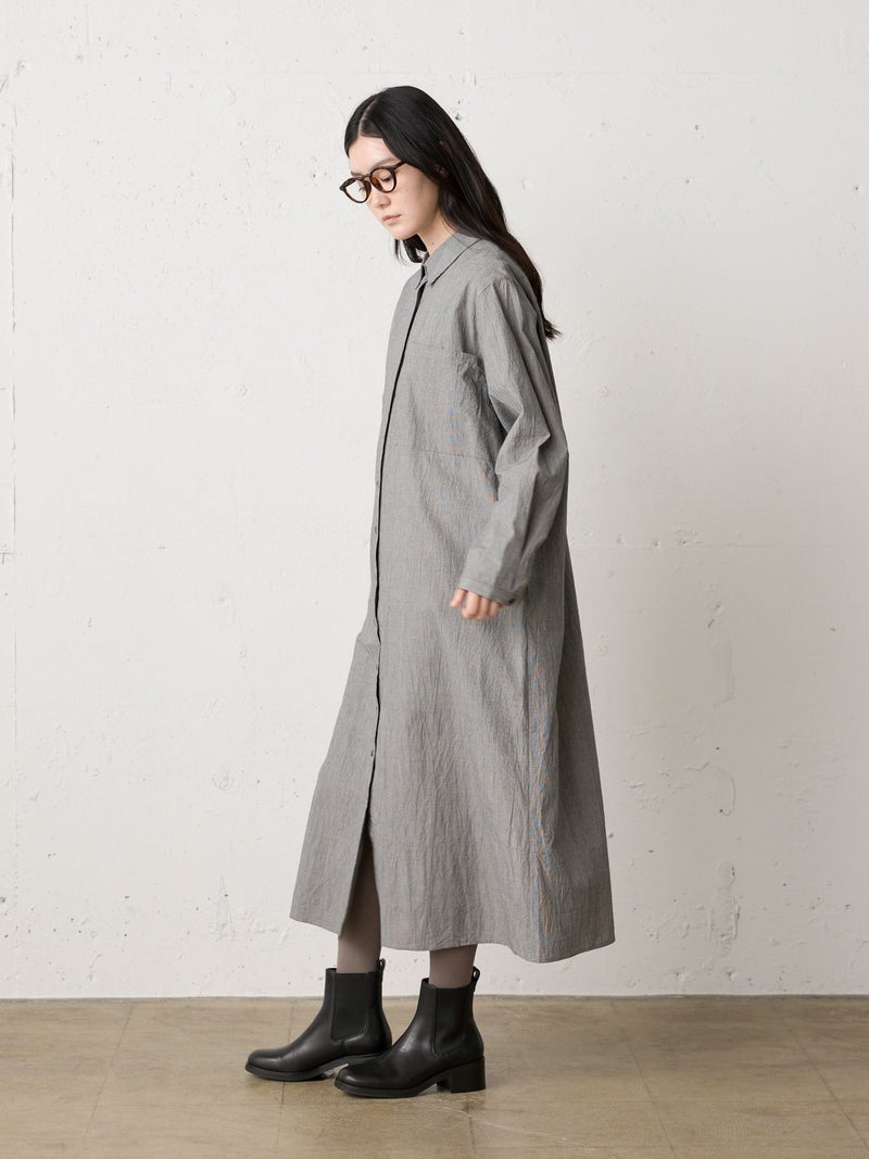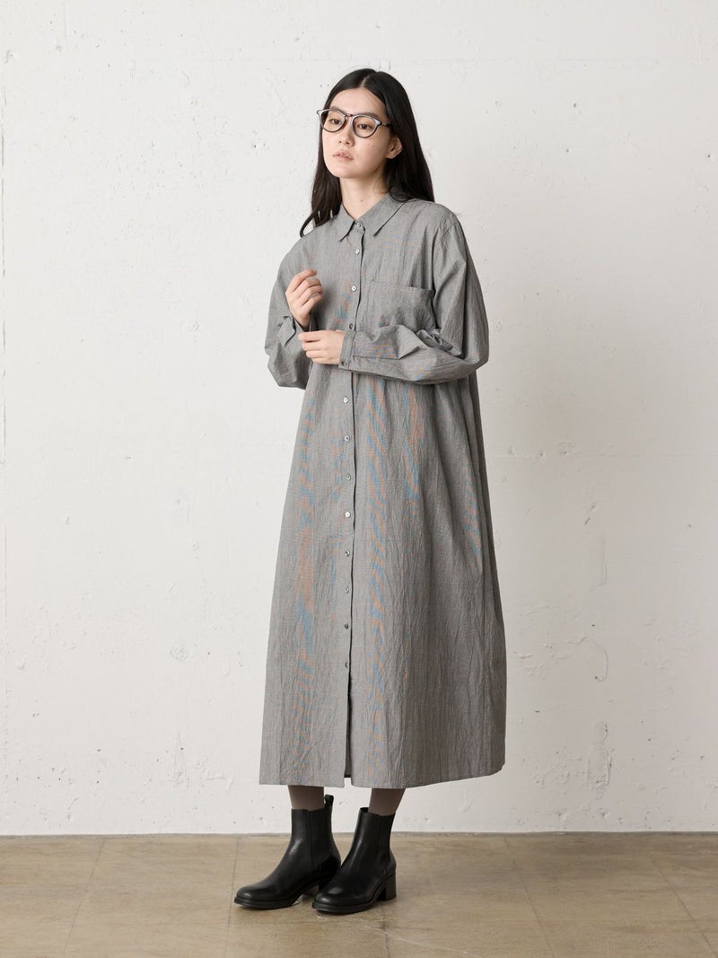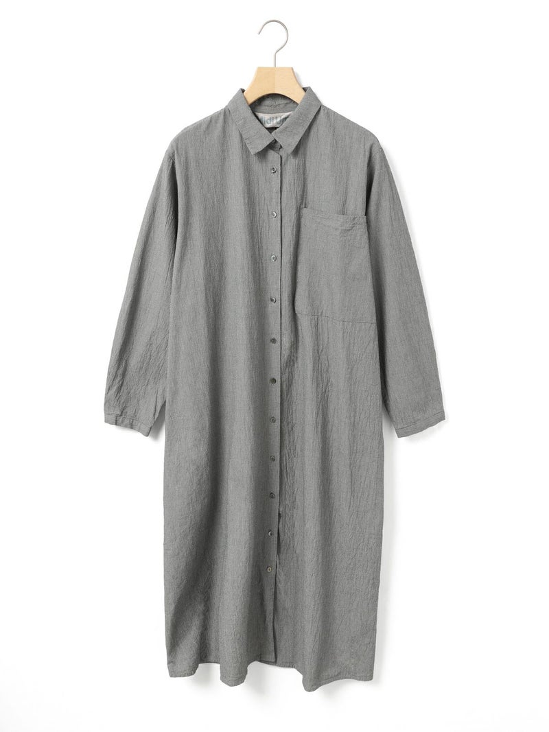 ハリのあるタイプライター素材のシャツシリーズ、ビッグポケットシャツワンピースです。パッと目に入る大きなポケットがポイント。羽織物としても素敵な1枚で、微Aラインのシルエットとあえて小さくしたカフスが女性らしい雰囲気に。ワッシャー加工を施しておりシャツに風合いがある魅力的な1枚です。優しい色合いの色展開で、印象の異なるシャツに仕上がっています。シンプルで着回しがきき重ね着アイテムとして重宝します。同シリーズ4-730034/ビッグポケットシャツも展開。
