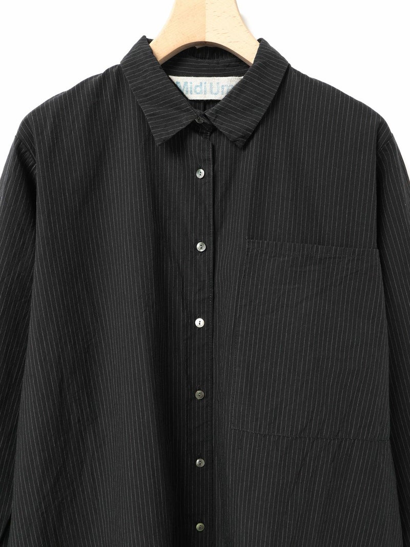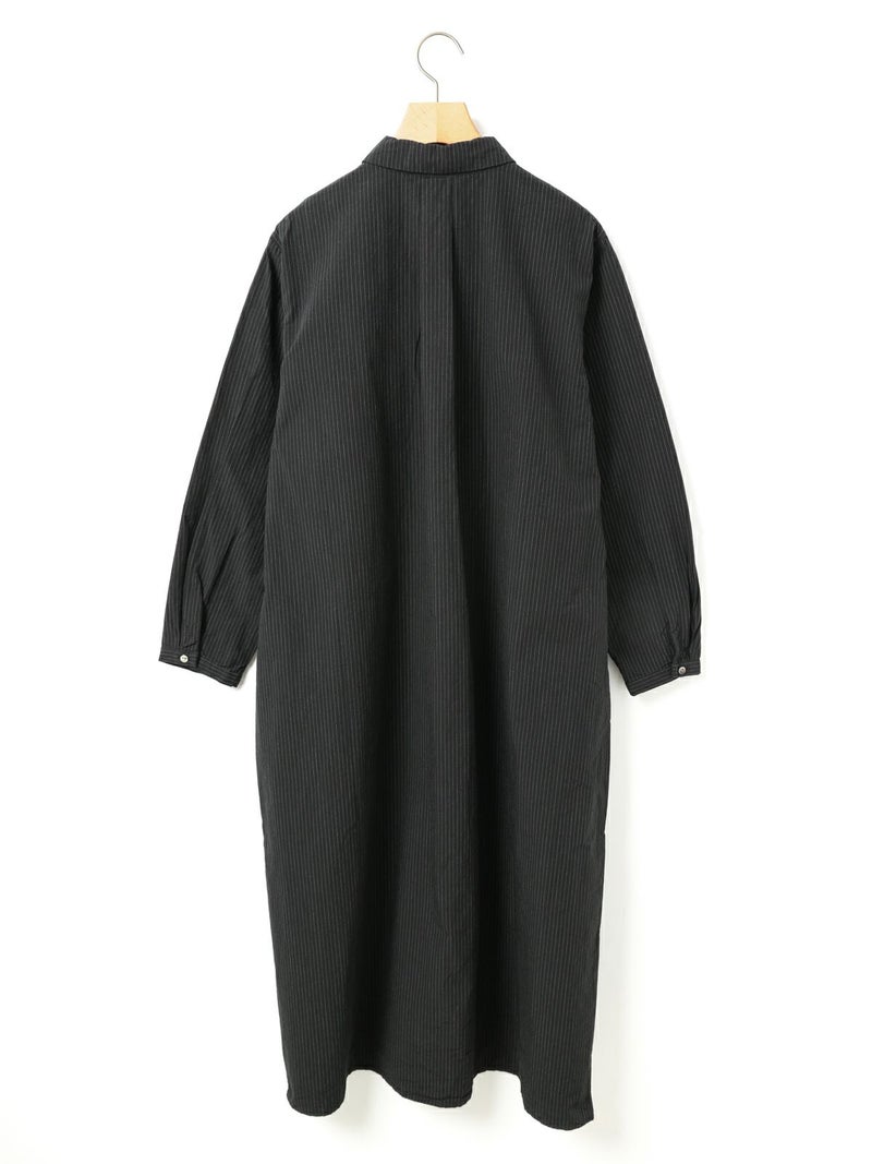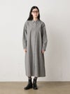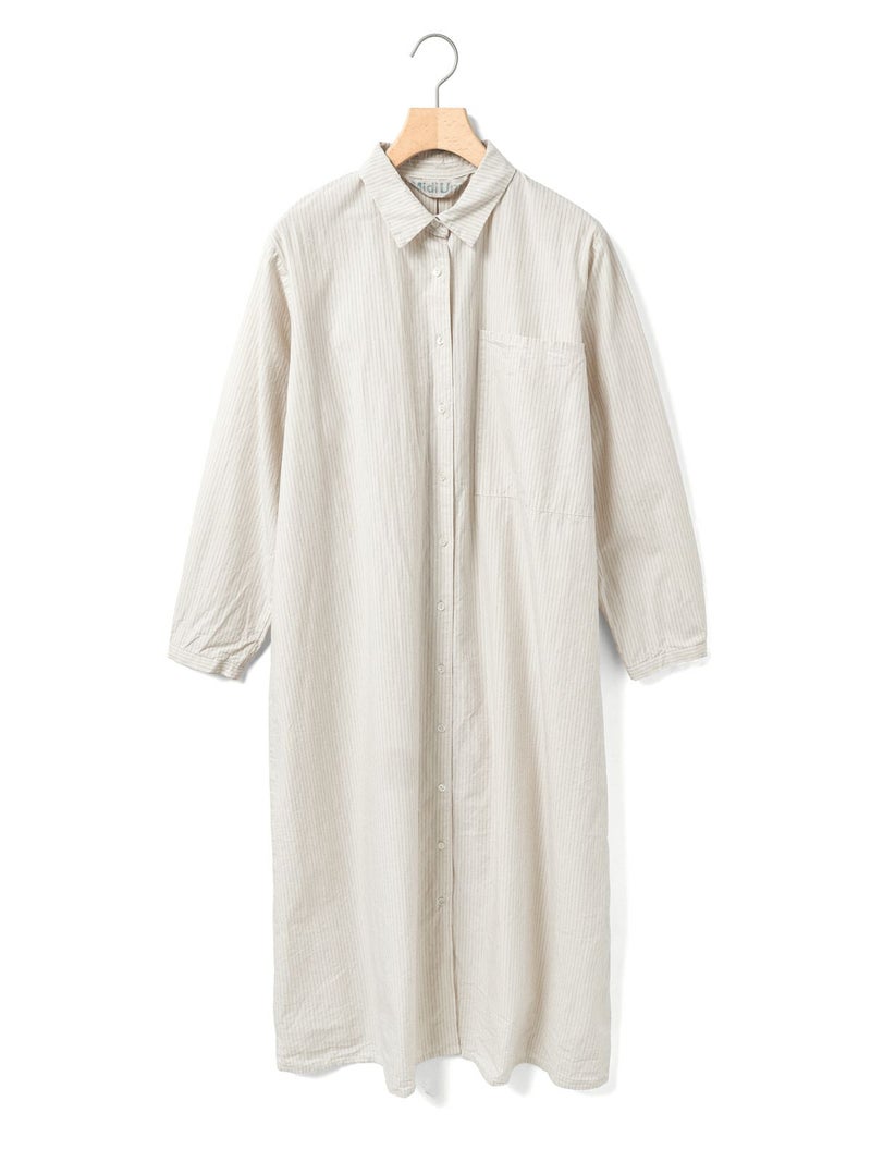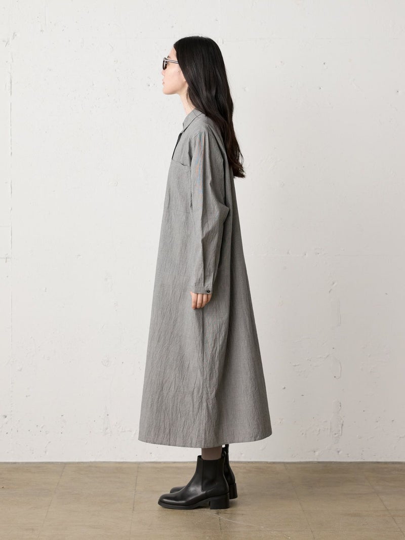 ハリのあるタイプライター素材のシャツシリーズ、ビッグポケットシャツワンピースです。パッと目に入る大きなポケットがポイント。羽織物としても素敵な1枚で、微Aラインのシルエットとあえて小さくしたカフスが女性らしい雰囲気に。ワッシャー加工を施しておりシャツに風合いがある魅力的な1枚です。優しい色合いの色展開で、印象の異なるシャツに仕上がっています。シンプルで着回しがきき重ね着アイテムとして重宝します。同シリーズ4-730034/ビッグポケットシャツも展開。