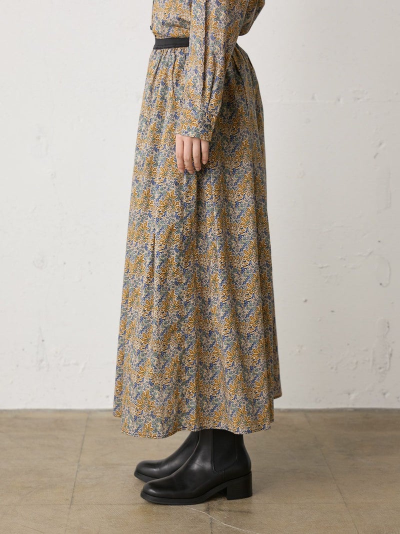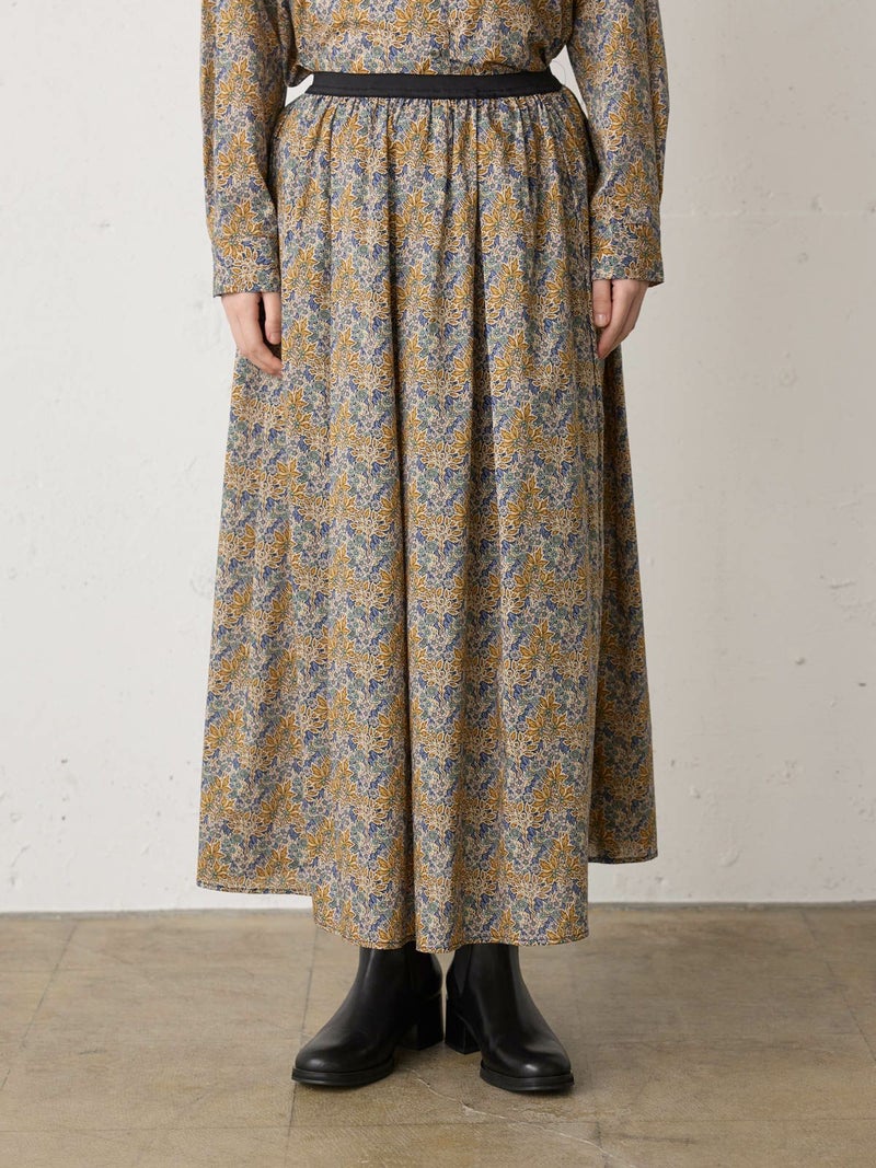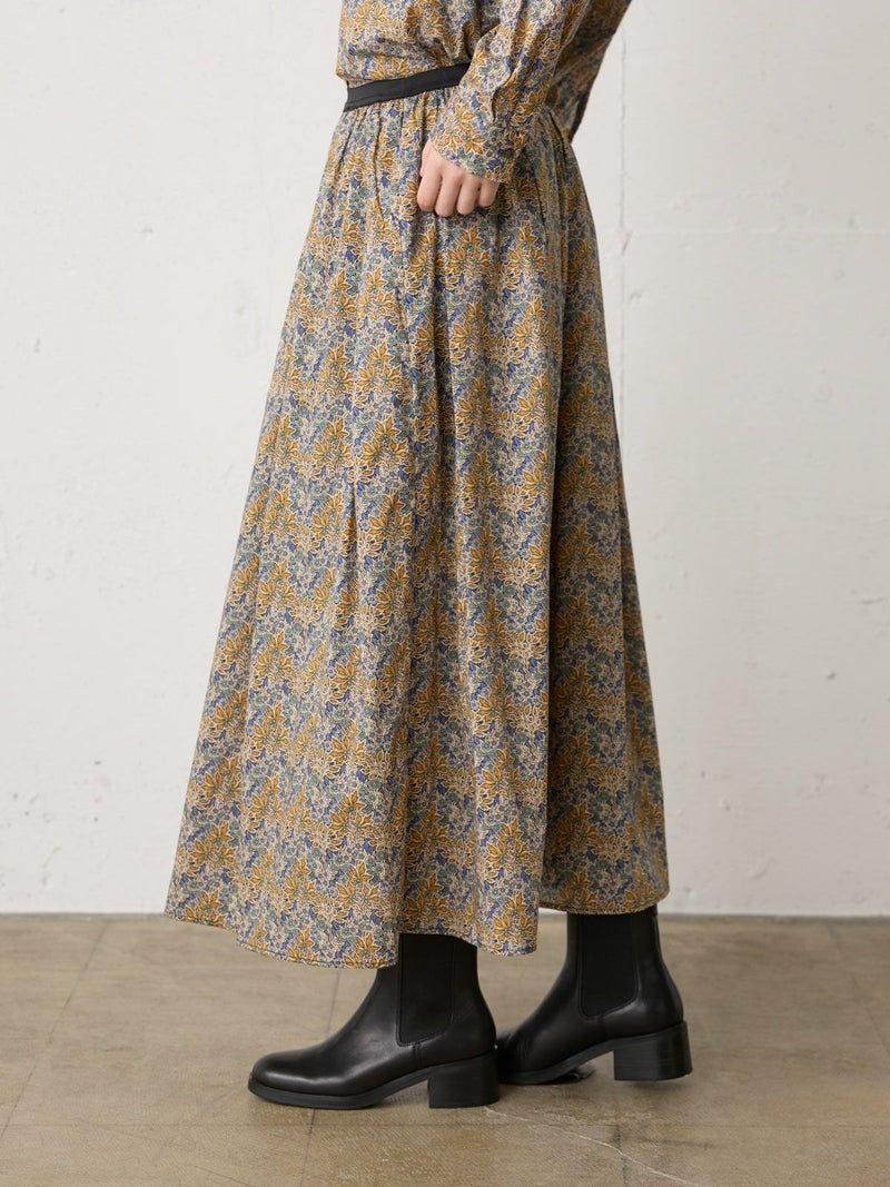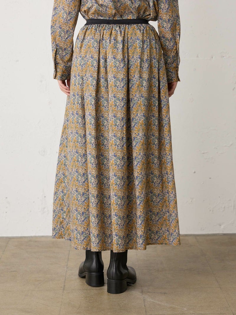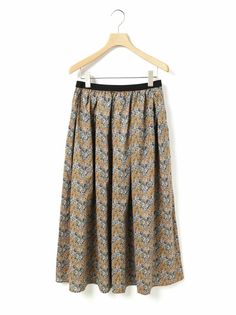 1904年に制作されたリバティのデザインを描き直したアールヌーボースタイルのボタニカルデザインをスカートに表現した、リバティプリントスカートです。様式化された花と葉が重なり合いスカラップ状に繰り返しレイアウトされています。ウエストが締まって見えるようにブラックサテンの平ゴムを表に出しています。ペチコートが付いているので透け感を気にせず着用可能。ニットやベストなど、温かみのあるアイテムとのコーディネートにもお勧めです。同シリーズ4-730036/リバティプリントシャツとセットアップもOK。落ち着いたカラー展開なので清楚で女性らしい着こなしを演出します。