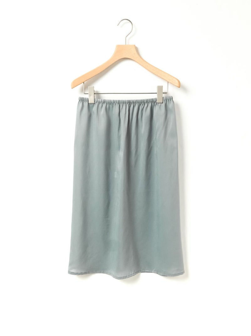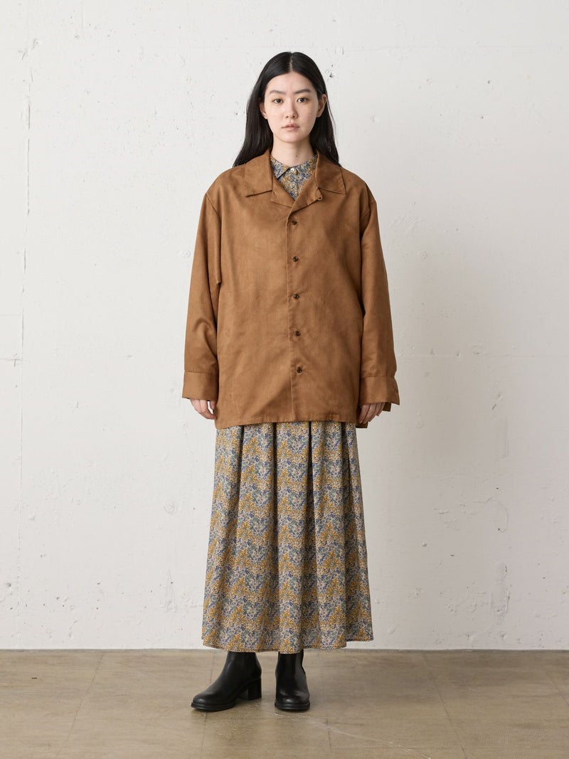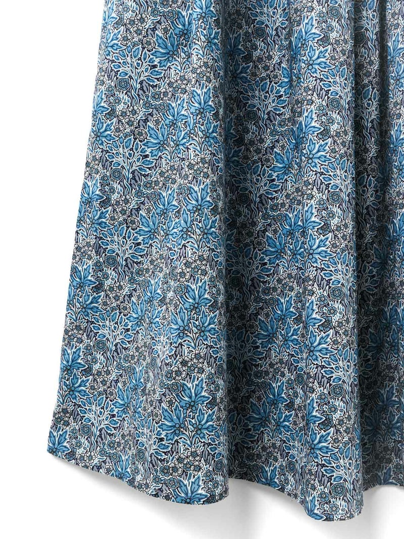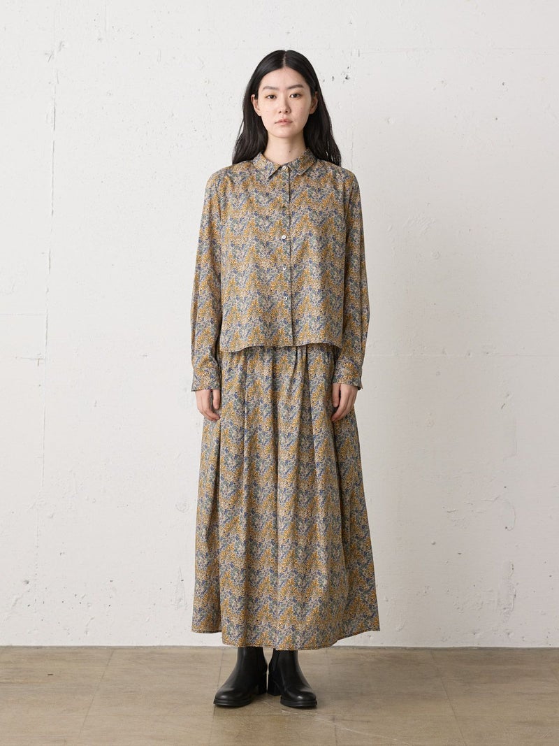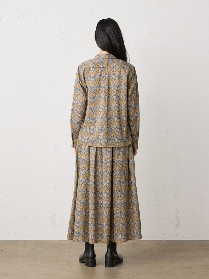 1904年に制作されたリバティのデザインを描き直したアールヌーボースタイルのボタニカルデザインをスカートに表現した、リバティプリントスカートです。様式化された花と葉が重なり合いスカラップ状に繰り返しレイアウトされています。ウエストが締まって見えるようにブラックサテンの平ゴムを表に出しています。ペチコートが付いているので透け感を気にせず着用可能。ニットやベストなど、温かみのあるアイテムとのコーディネートにもお勧めです。同シリーズ4-730036/リバティプリントシャツとセットアップもOK。落ち着いたカラー展開なので清楚で女性らしい着こなしを演出します。