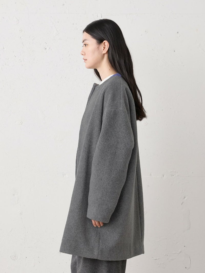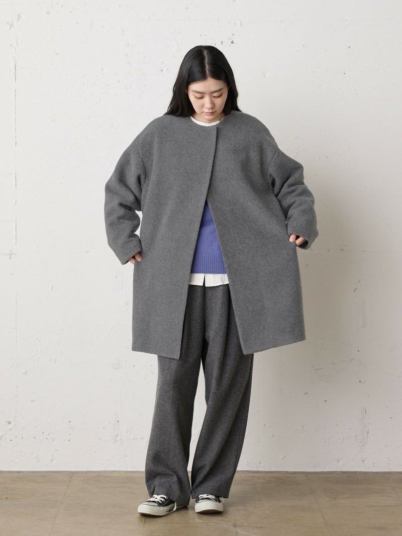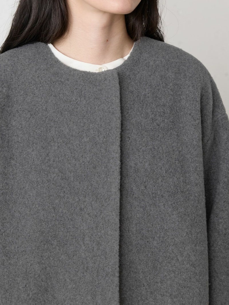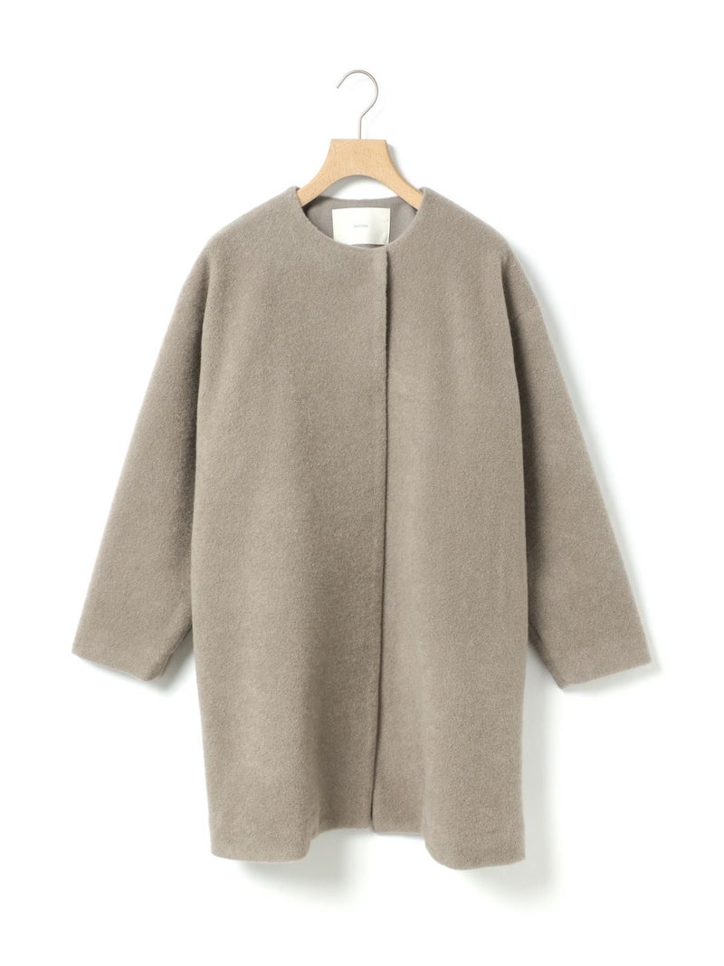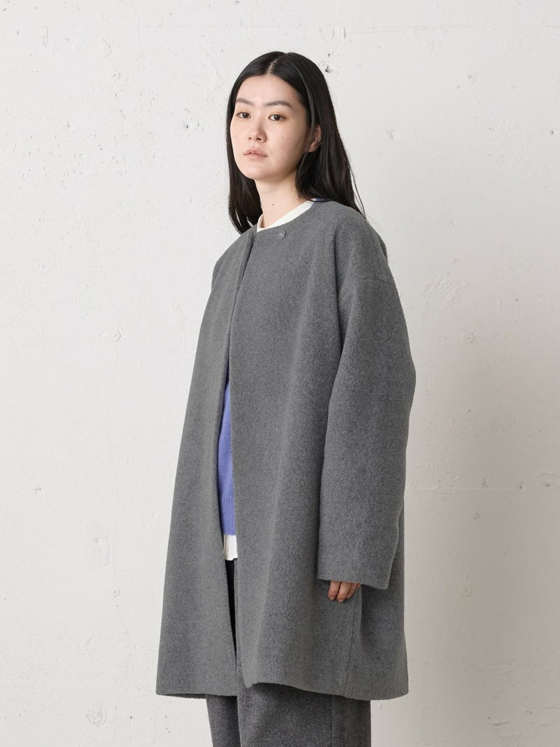 圧縮ウールのような見ためで暖かさと軽さのある素材を使用したブークレノーカラーコート。柔らかくふんわりとした質感が特徴で手触りの良い表面感の膨らみが魅力的。フロントのデザインは内側にスナップボタンが付いた仕様です。膝丈の大きすぎないサイズ感がポイント。優しい色合いの女性らしい雰囲気を印象つけるコートです。同シリーズ4-770022/ブークレロングベストも展開。