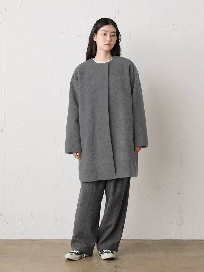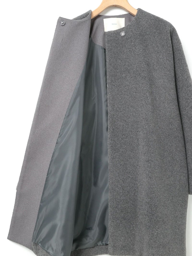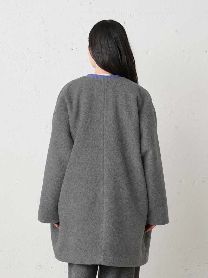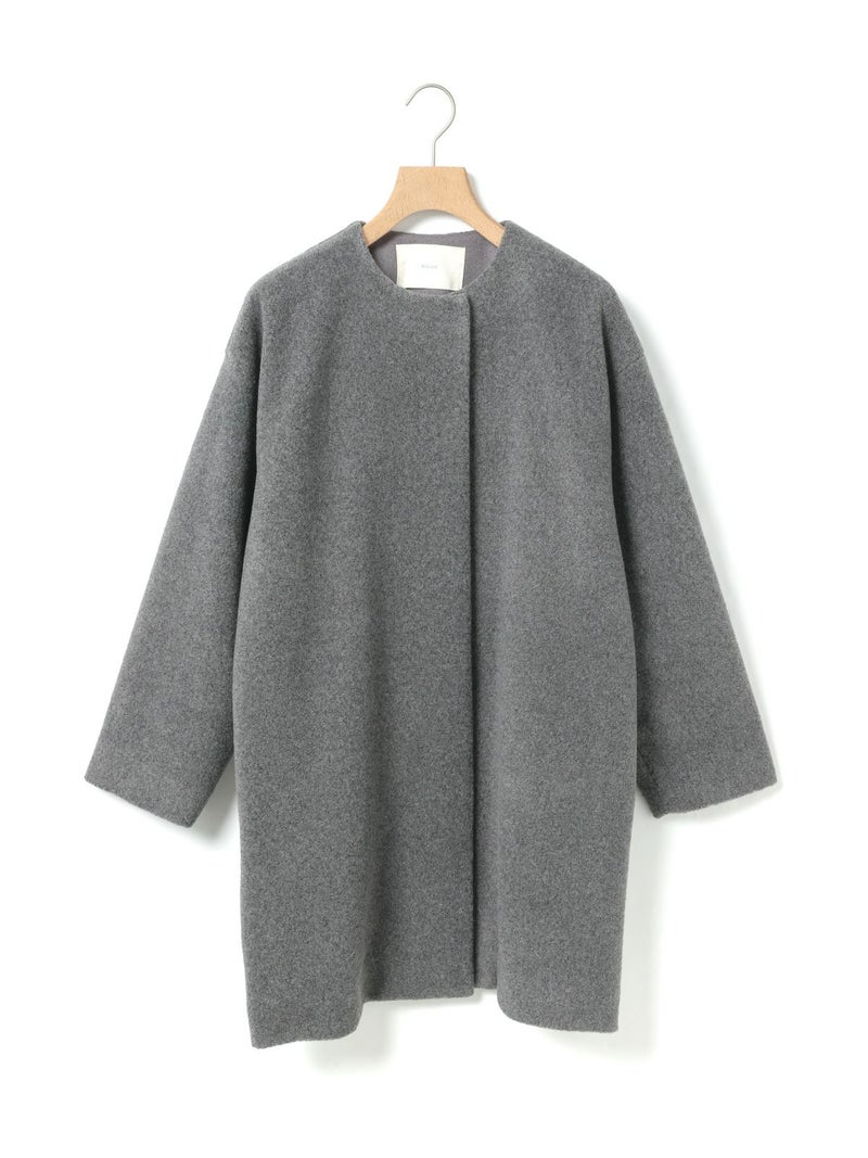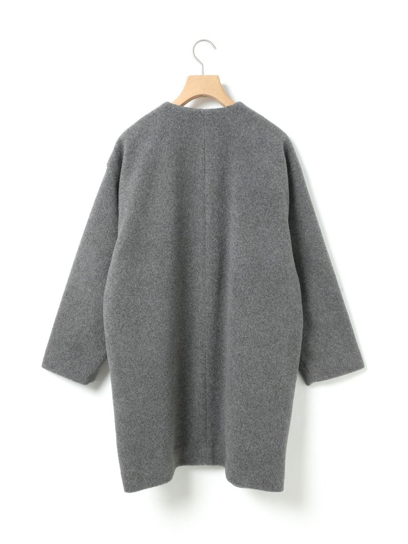 圧縮ウールのような見ためで暖かさと軽さのある素材を使用したブークレノーカラーコート。柔らかくふんわりとした質感が特徴で手触りの良い表面感の膨らみが魅力的。フロントのデザインは内側にスナップボタンが付いた仕様です。膝丈の大きすぎないサイズ感がポイント。優しい色合いの女性らしい雰囲気を印象つけるコートです。同シリーズ4-770022/ブークレロングベストも展開。