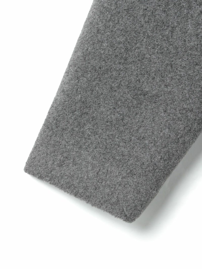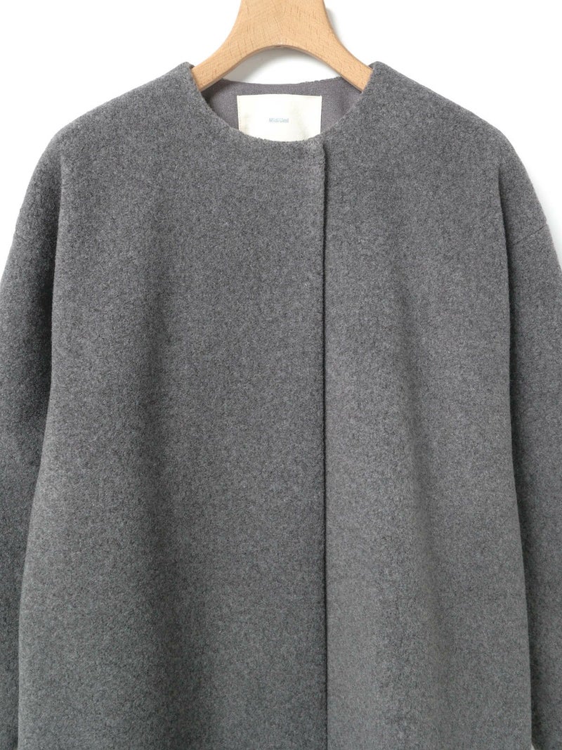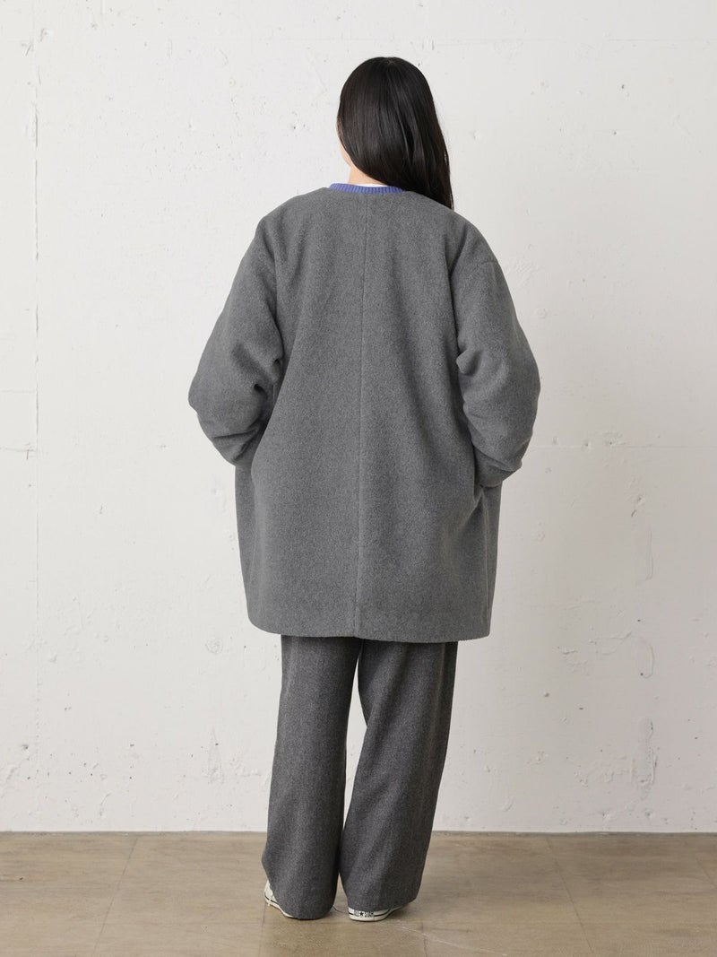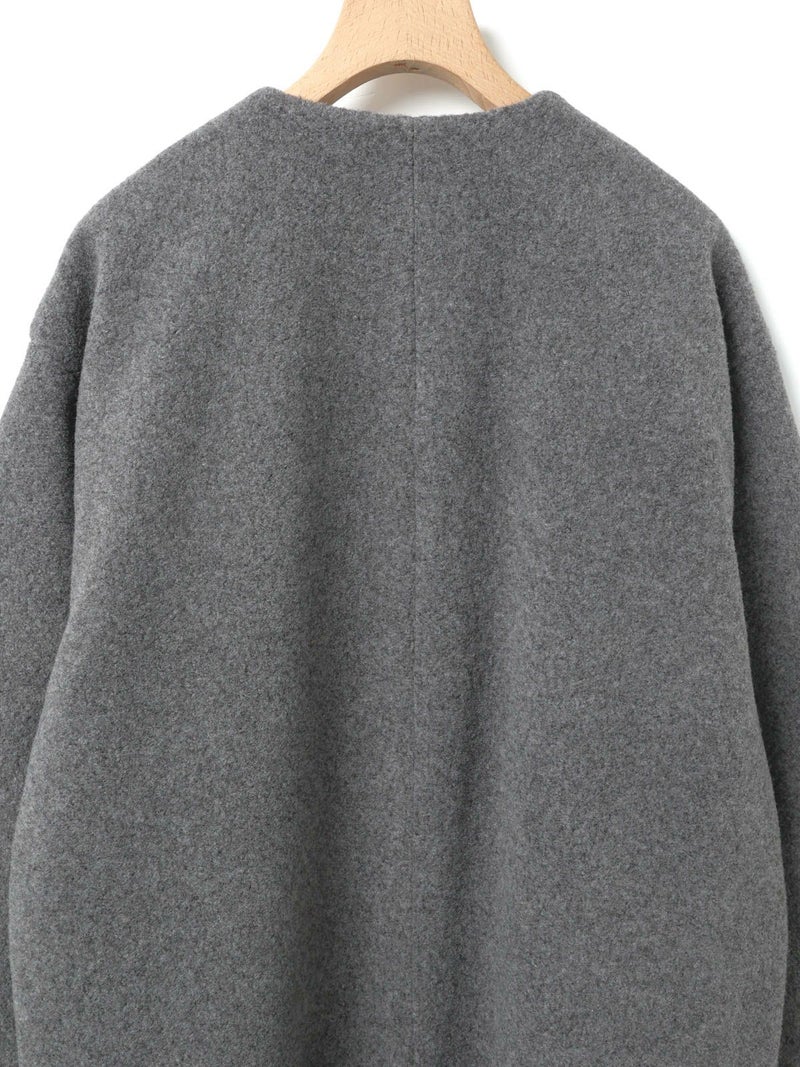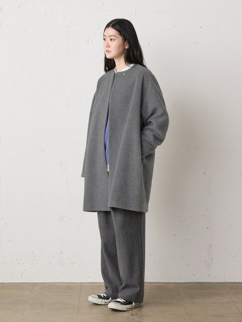 圧縮ウールのような見ためで暖かさと軽さのある素材を使用したブークレノーカラーコート。柔らかくふんわりとした質感が特徴で手触りの良い表面感の膨らみが魅力的。フロントのデザインは内側にスナップボタンが付いた仕様です。膝丈の大きすぎないサイズ感がポイント。優しい色合いの女性らしい雰囲気を印象つけるコートです。同シリーズ4-770022/ブークレロングベストも展開。