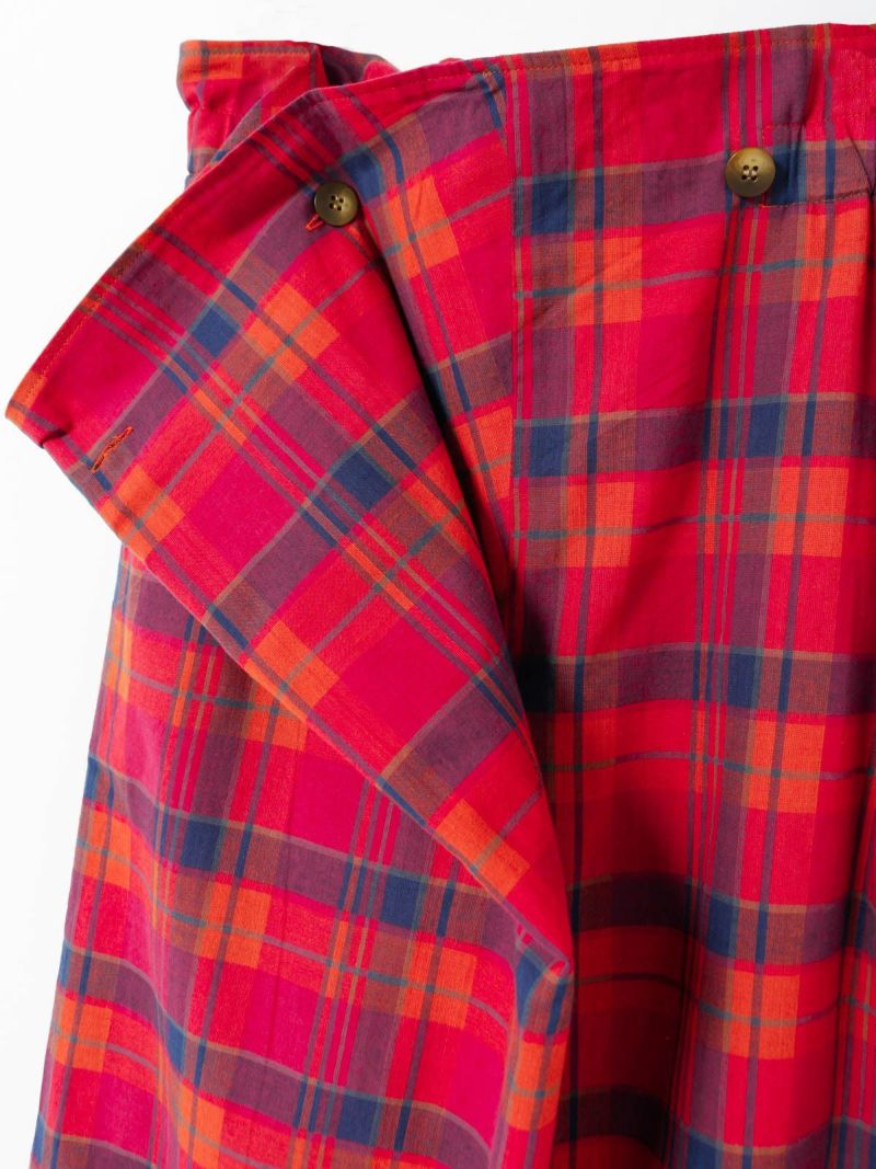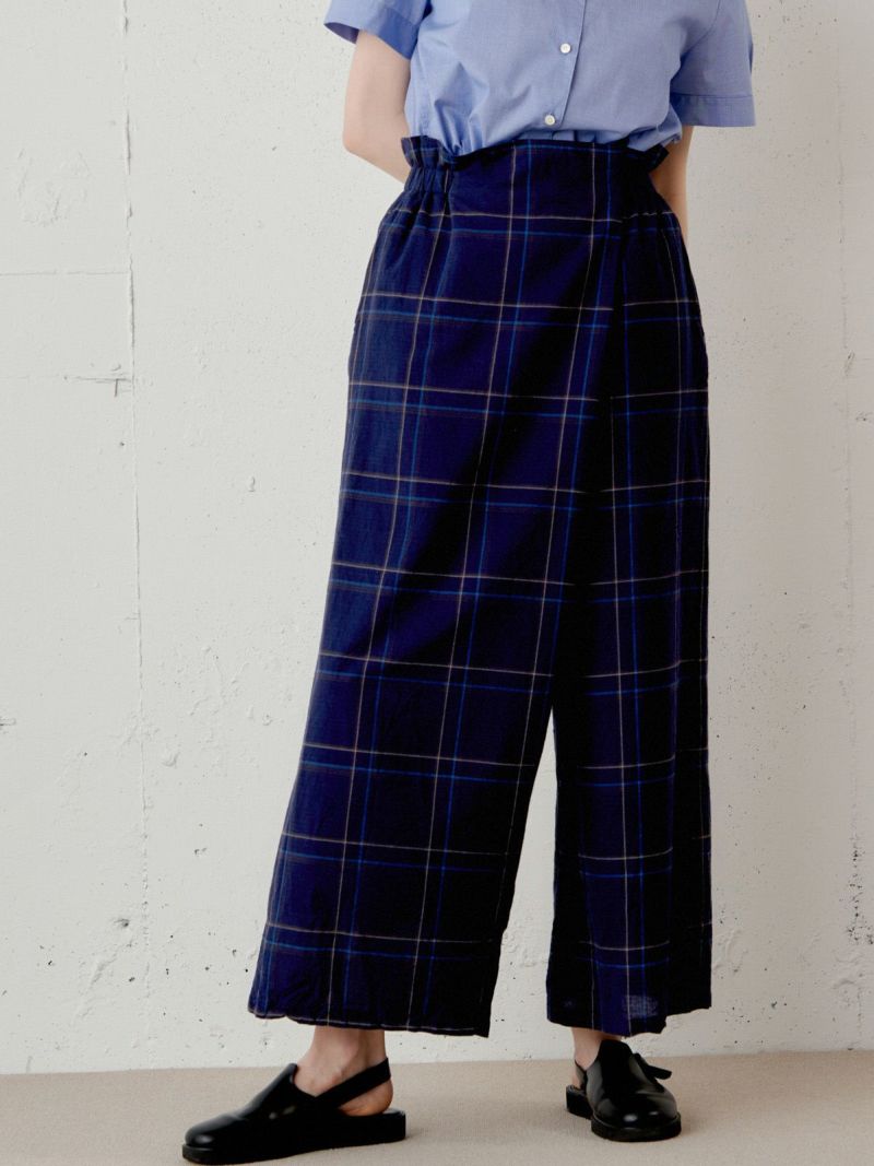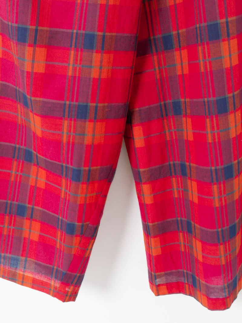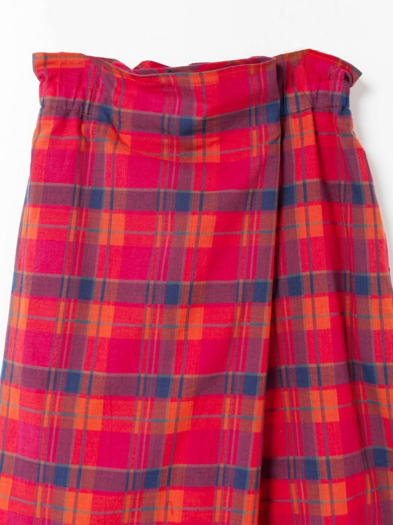 オーガニックコットンのマドラスチェックシリーズでもあるラップライクパンツです。落ち着いた配色のチェック柄でナチュラルなリゾート感を演出。スカート見えする巻きパンツとなっています。ウエスト2か所にボタン、後ろはゴムのラクに穿いていただけるデザインに仕上がっています。カジュアルにTシャツで合わせても素敵です。印象の異なるレッドとネイビーの2色展開。