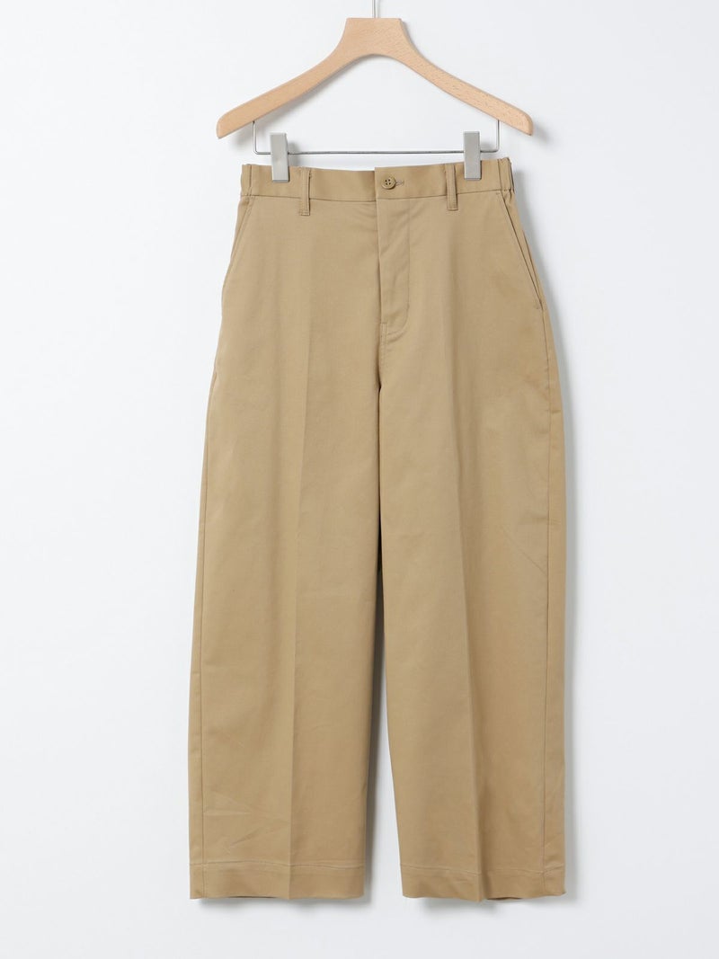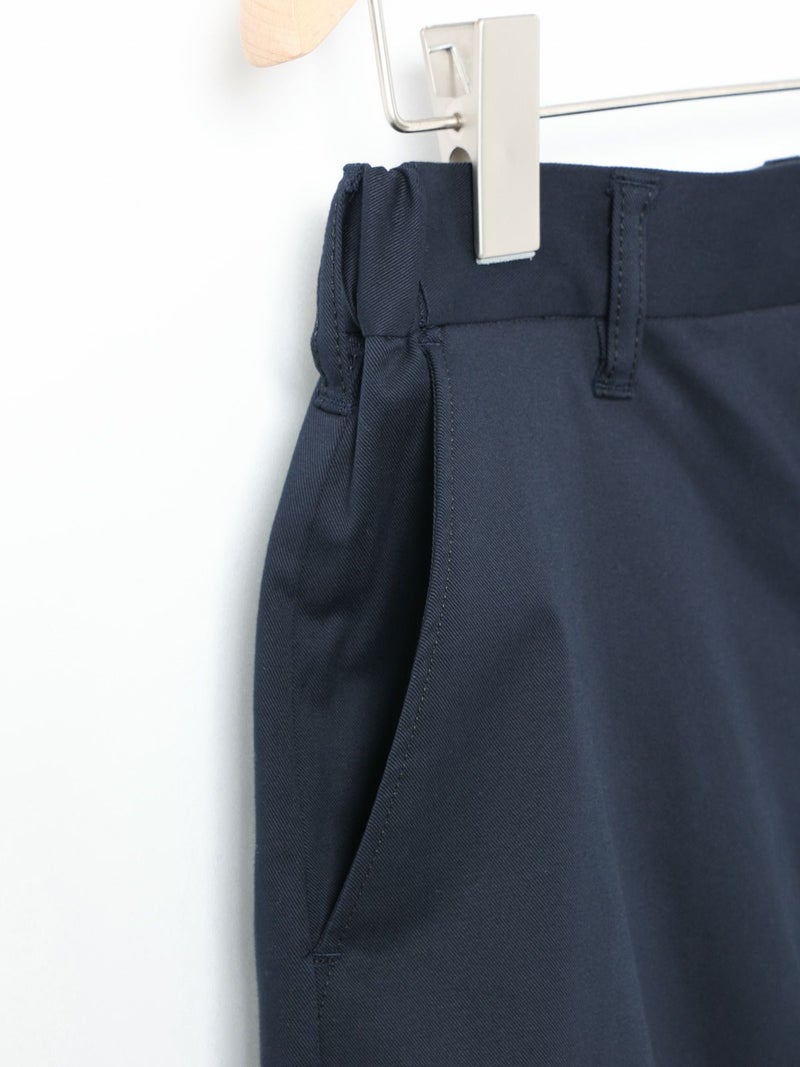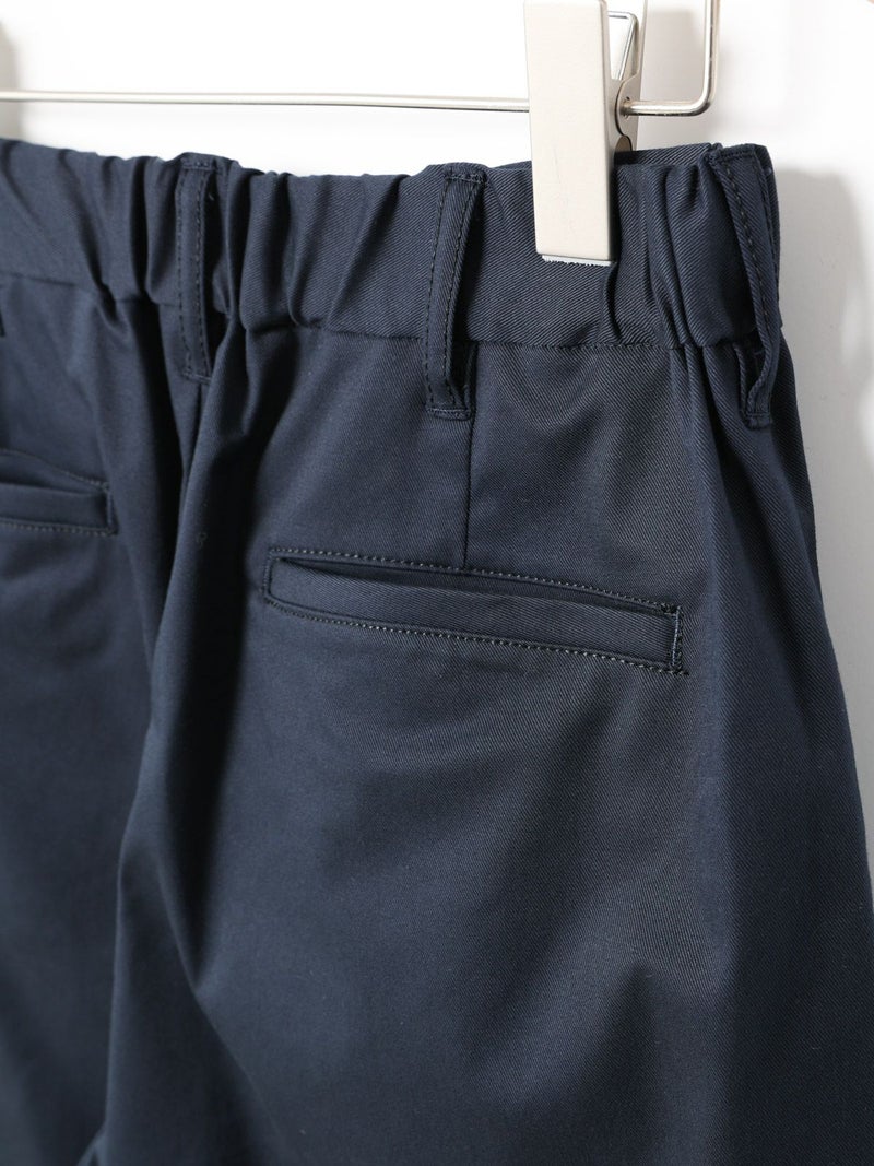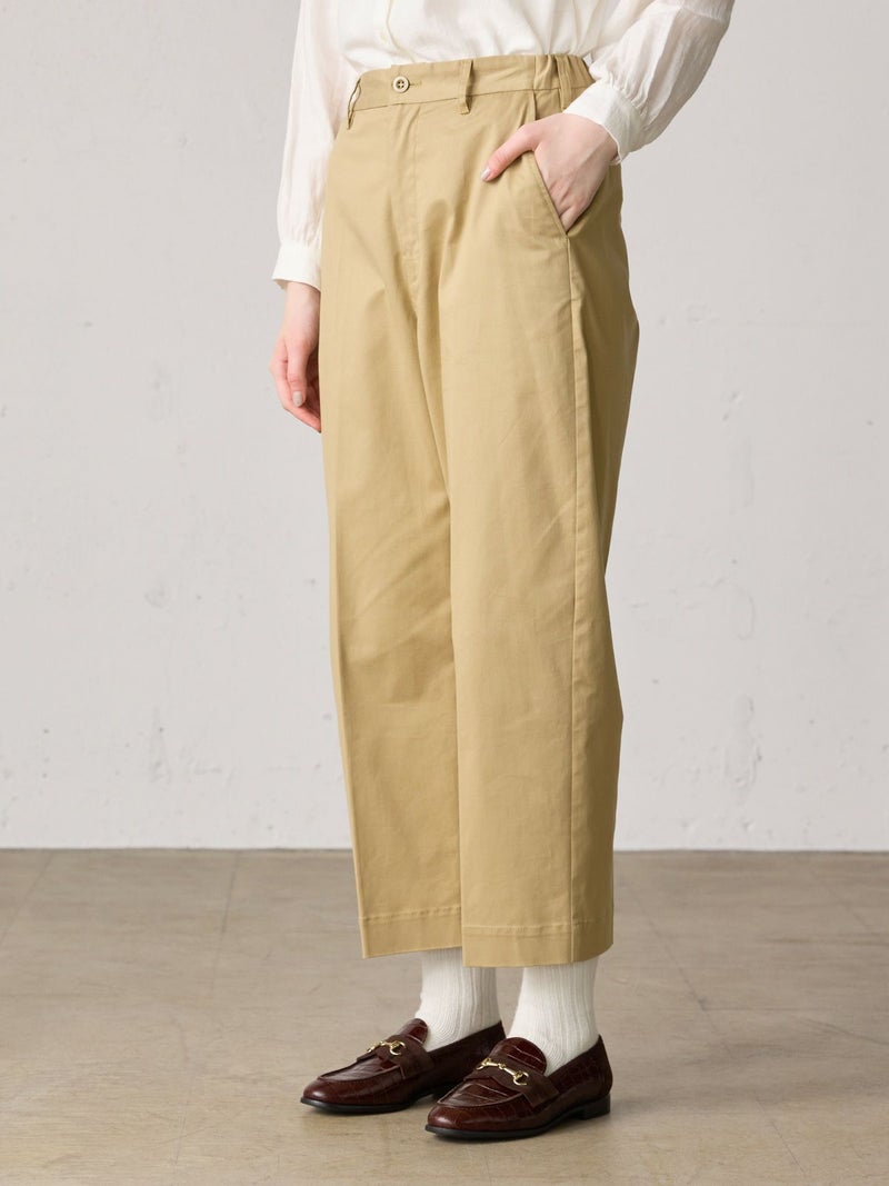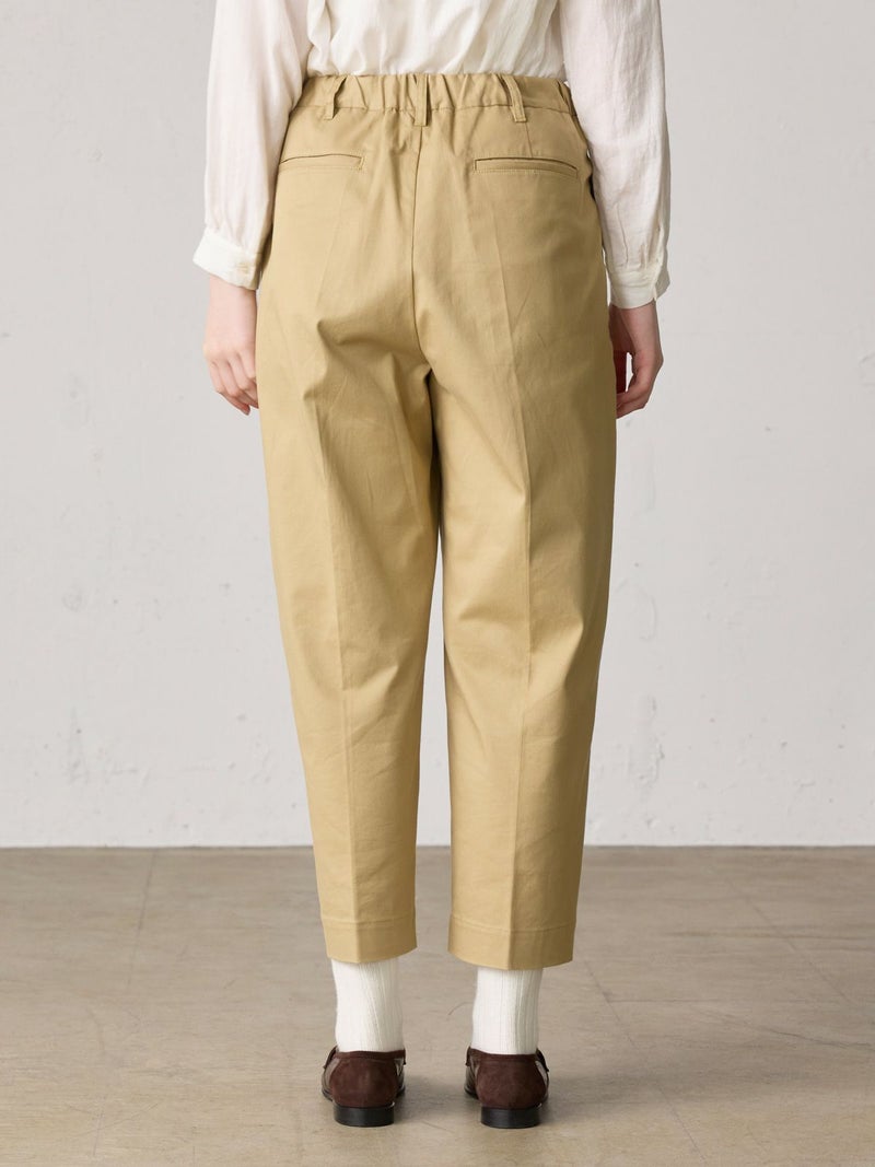MidiUmiの定番パンツ、大人のカジュアルアイテムにお勧めのMidiUmiチノパンツです。毛羽が少ないコンパクトヤーンを使用した中肉厚のストレッチツイル。微起毛加工を施し、繊細でしっとりとしたタッチが魅力的。センタープレス入りのキレイ目カジュアルなチノパンを表現。スッキリとしたジャスト丈。ウエストは後ろゴム、前はボタンとジップフライ仕様。股上を深めにしたことでヒップと腰回りに少し丸みが出るよう仕上げています。ベルト使い・シャツイン可能。ベーシックなデザインとカラー展開で長く愛用できる1枚です。