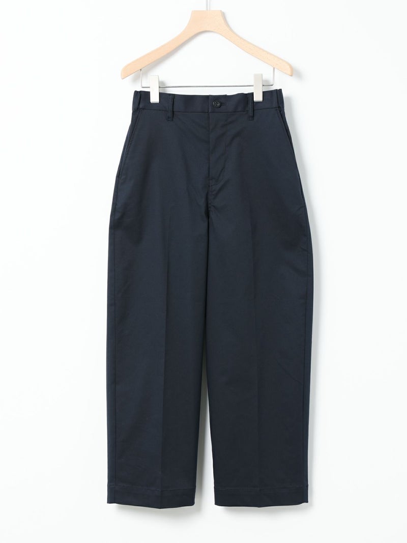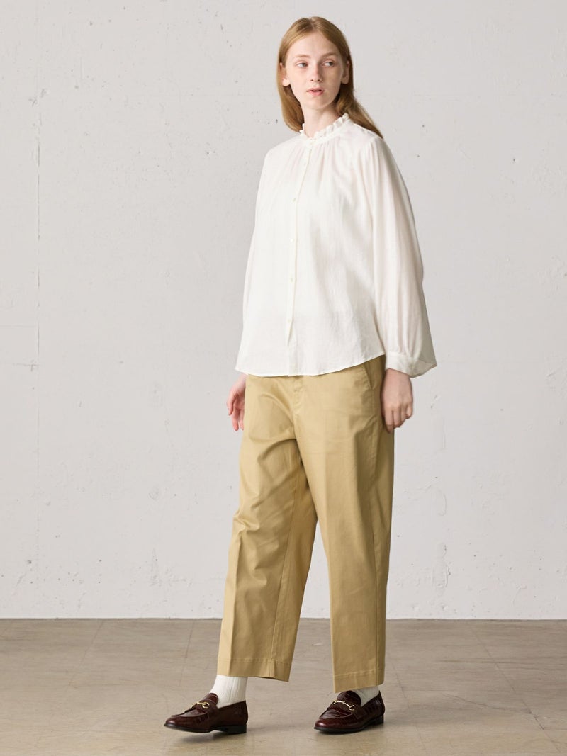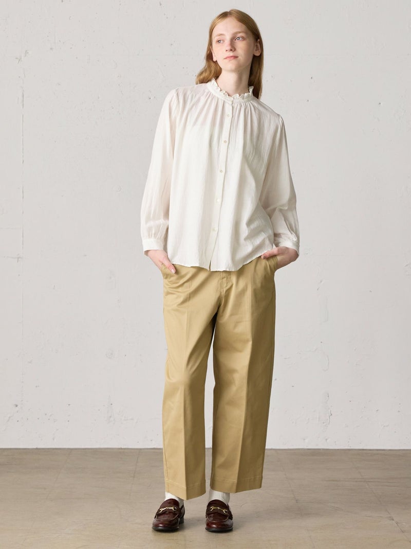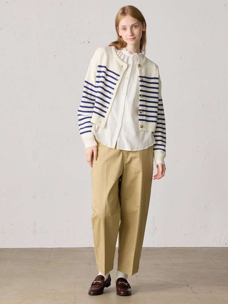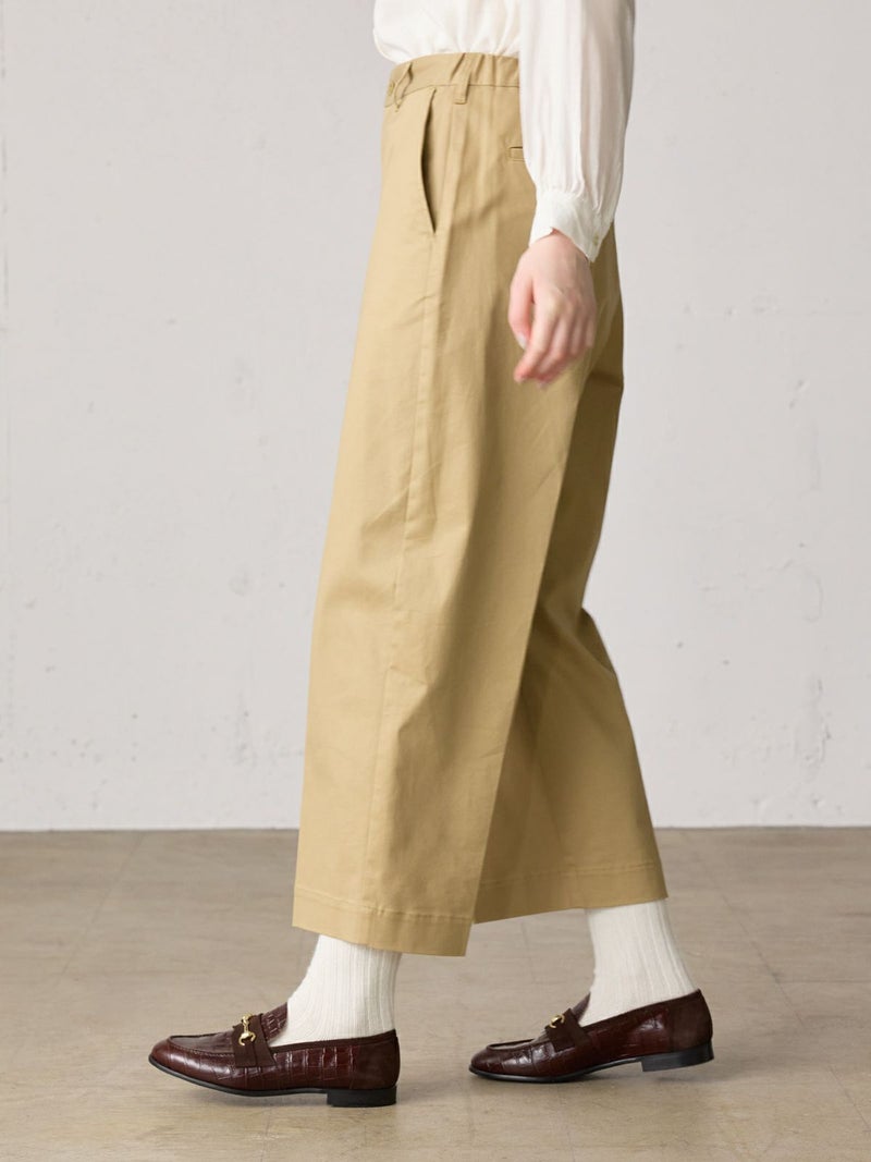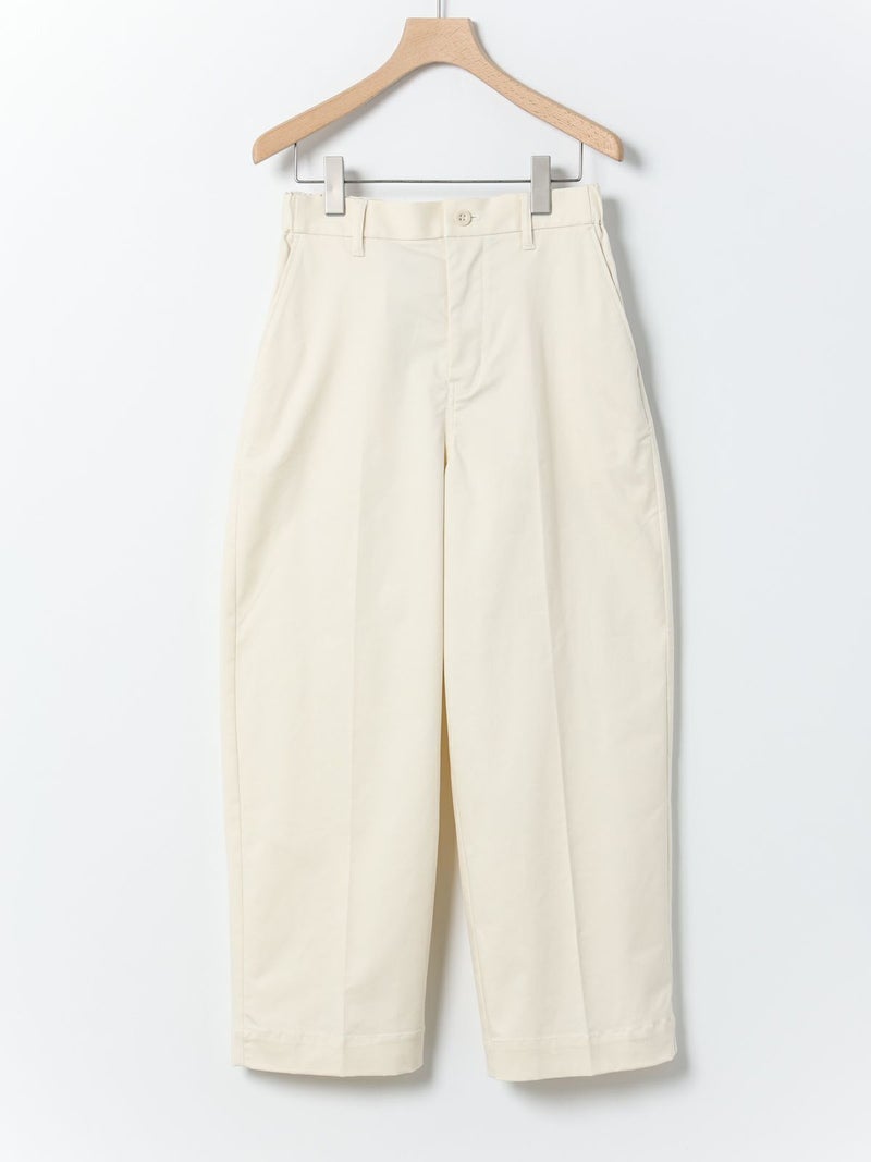 MidiUmiの定番パンツ、大人のカジュアルアイテムにお勧めのMidiUmiチノパンツです。毛羽が少ないコンパクトヤーンを使用した中肉厚のストレッチツイル。微起毛加工を施し、繊細でしっとりとしたタッチが魅力的。センタープレス入りのキレイ目カジュアルなチノパンを表現。スッキリとしたジャスト丈。ウエストは後ろゴム、前はボタンとジップフライ仕様。股上を深めにしたことでヒップと腰回りに少し丸みが出るよう仕上げています。ベルト使い・シャツイン可能。ベーシックなデザインとカラー展開で長く愛用できる1枚です。