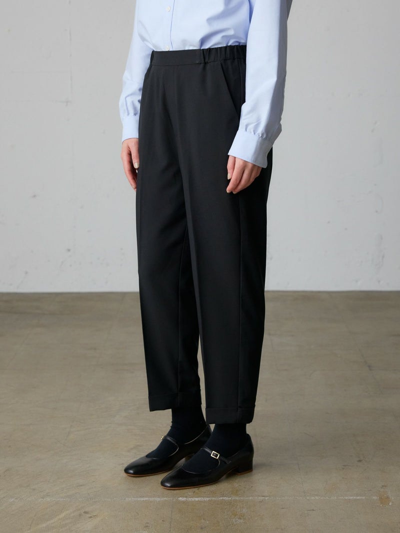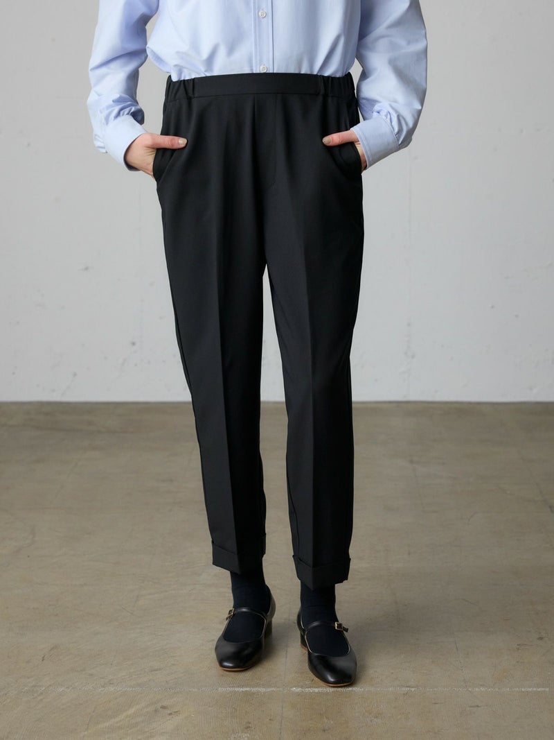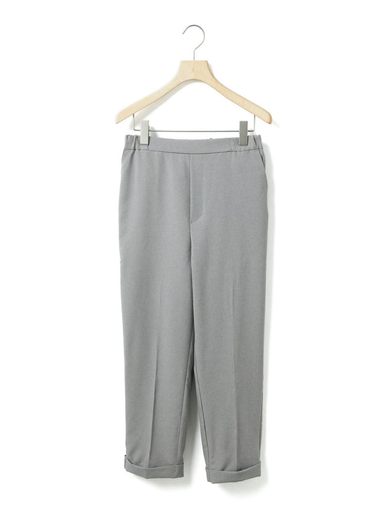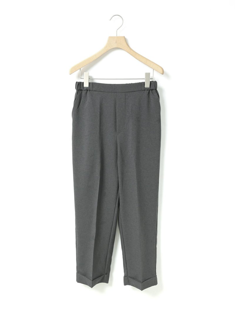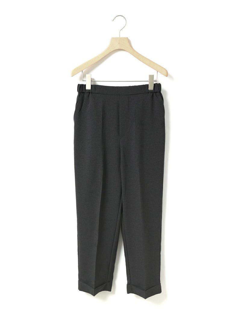 リサイクルポリエステルを100%使用したセンタープレスストレートパンツです。梳毛ライクで落ち感のある生地が特徴。洗ってもシワになりにくいのがポイント(※手洗い可能)。センタープレスの入ったストレートパンツでスッキリときれい目カジュアルなコーディネートを演出します。ウエストはバックゴム仕様になっており、裾がダブルになったデザイン仕上げ。ベーシックな3色展開に絞っており、着回しもしやすくどなたにも穿きやすいストレートパンツを提案した1枚です。 同シリーズ3-769984/ワイドスラックスパンツも展開。