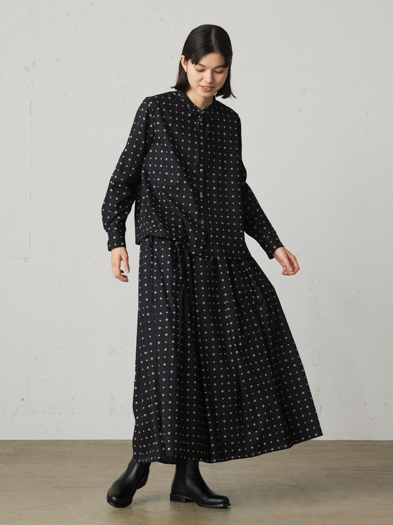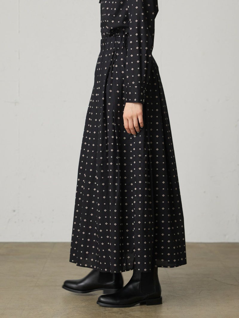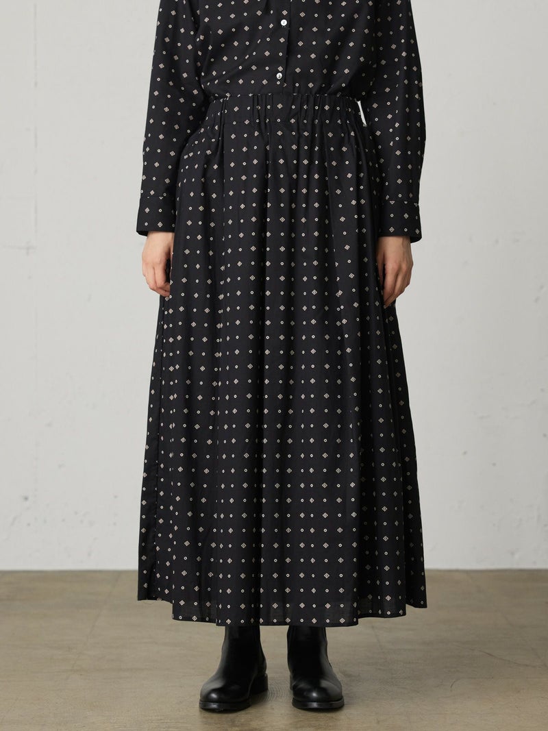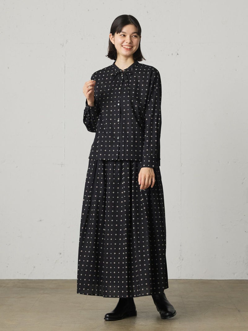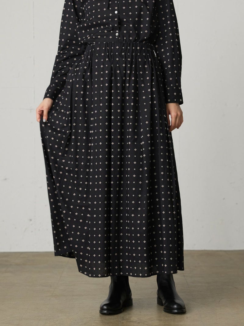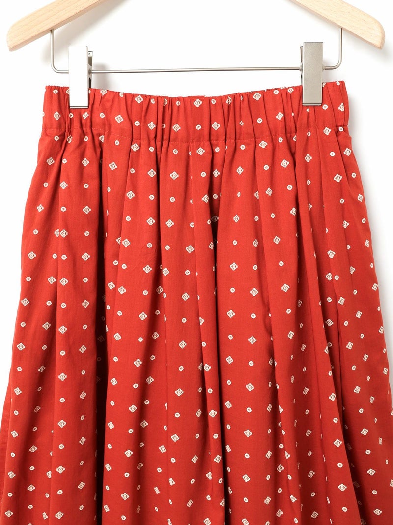 ブロード素材のオリジナルプリントでデザインした小紋柄ギャザースカートです。ドット風に見える小紋柄はアンティークな雰囲気を表現した1枚。ウエストギャザーが入っており軽くふんわりとしたシルエットが特徴。裏地付きなので透け感を気にすることなく着用していただけます。ワンピースとコーディネートしても素敵です。柔らかな肌触りなので着心地の良さを体感していただけます。同シリーズ3-739669/小紋柄ボウタイシャツ、3-759676/小紋柄切替ワンピースも展開。レットとブラックの印象の異なるカラー展開も魅力です。