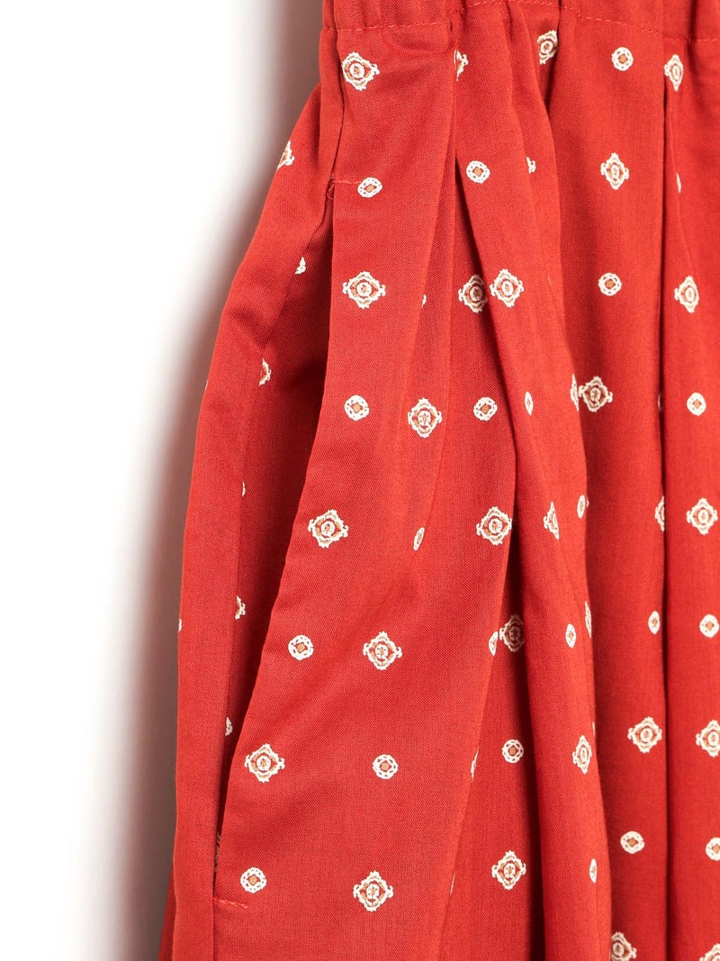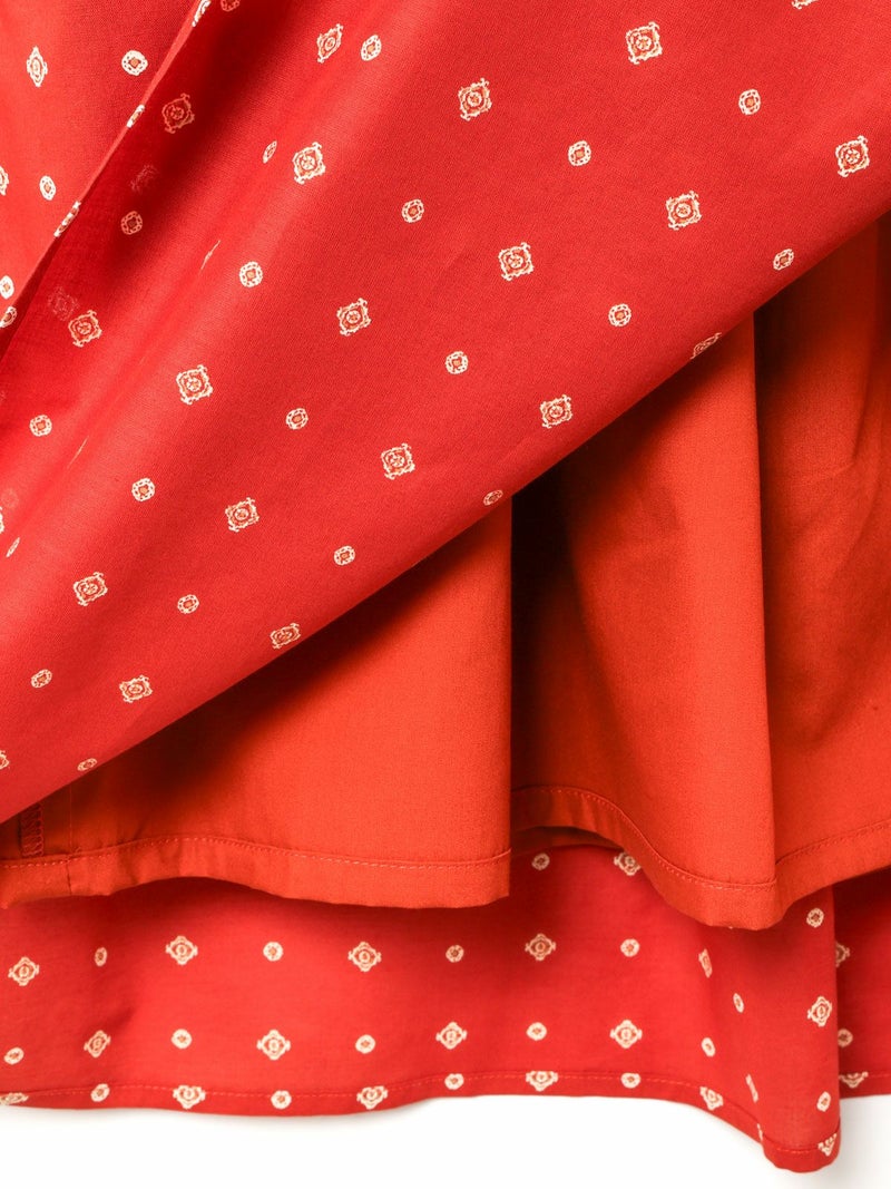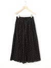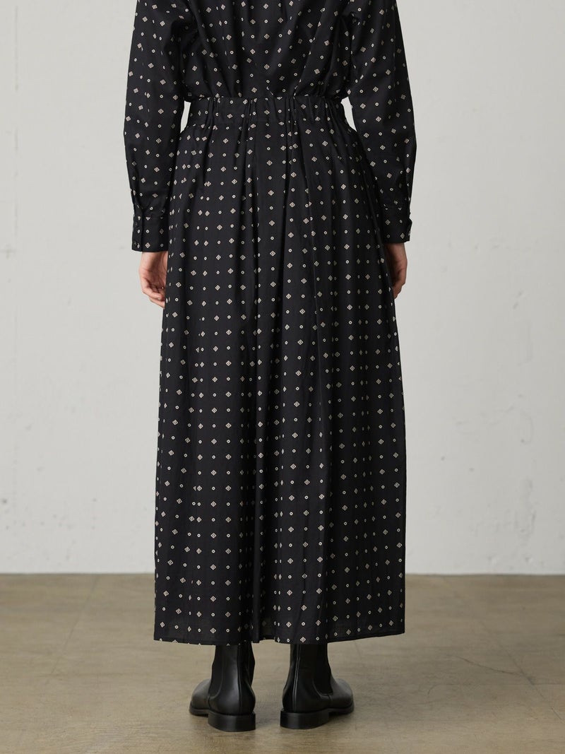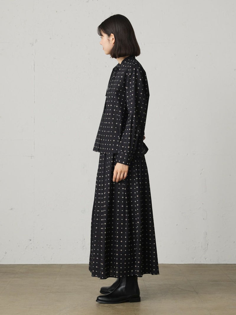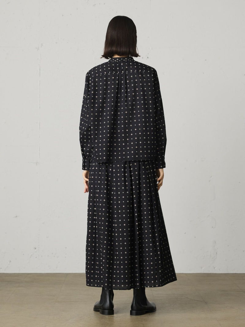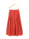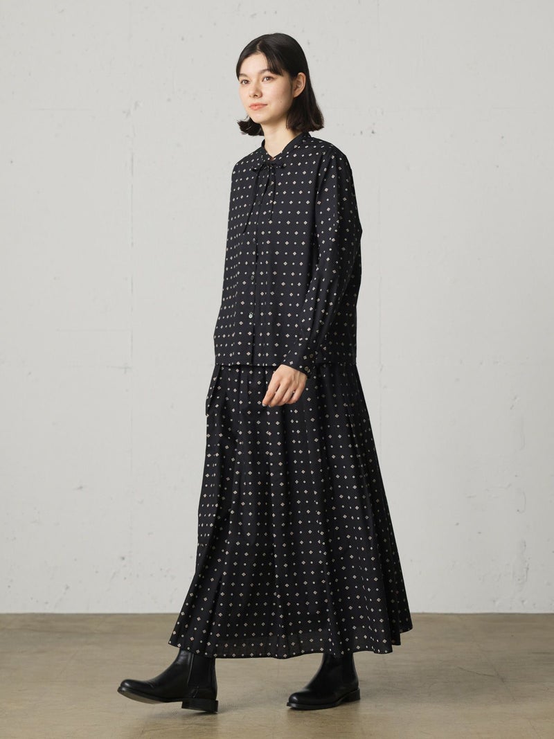 ブロード素材のオリジナルプリントでデザインした小紋柄ギャザースカートです。ドット風に見える小紋柄はアンティークな雰囲気を表現した1枚。ウエストギャザーが入っており軽くふんわりとしたシルエットが特徴。裏地付きなので透け感を気にすることなく着用していただけます。ワンピースとコーディネートしても素敵です。柔らかな肌触りなので着心地の良さを体感していただけます。同シリーズ3-739669/小紋柄ボウタイシャツ、3-759676/小紋柄切替ワンピースも展開。レットとブラックの印象の異なるカラー展開も魅力です。