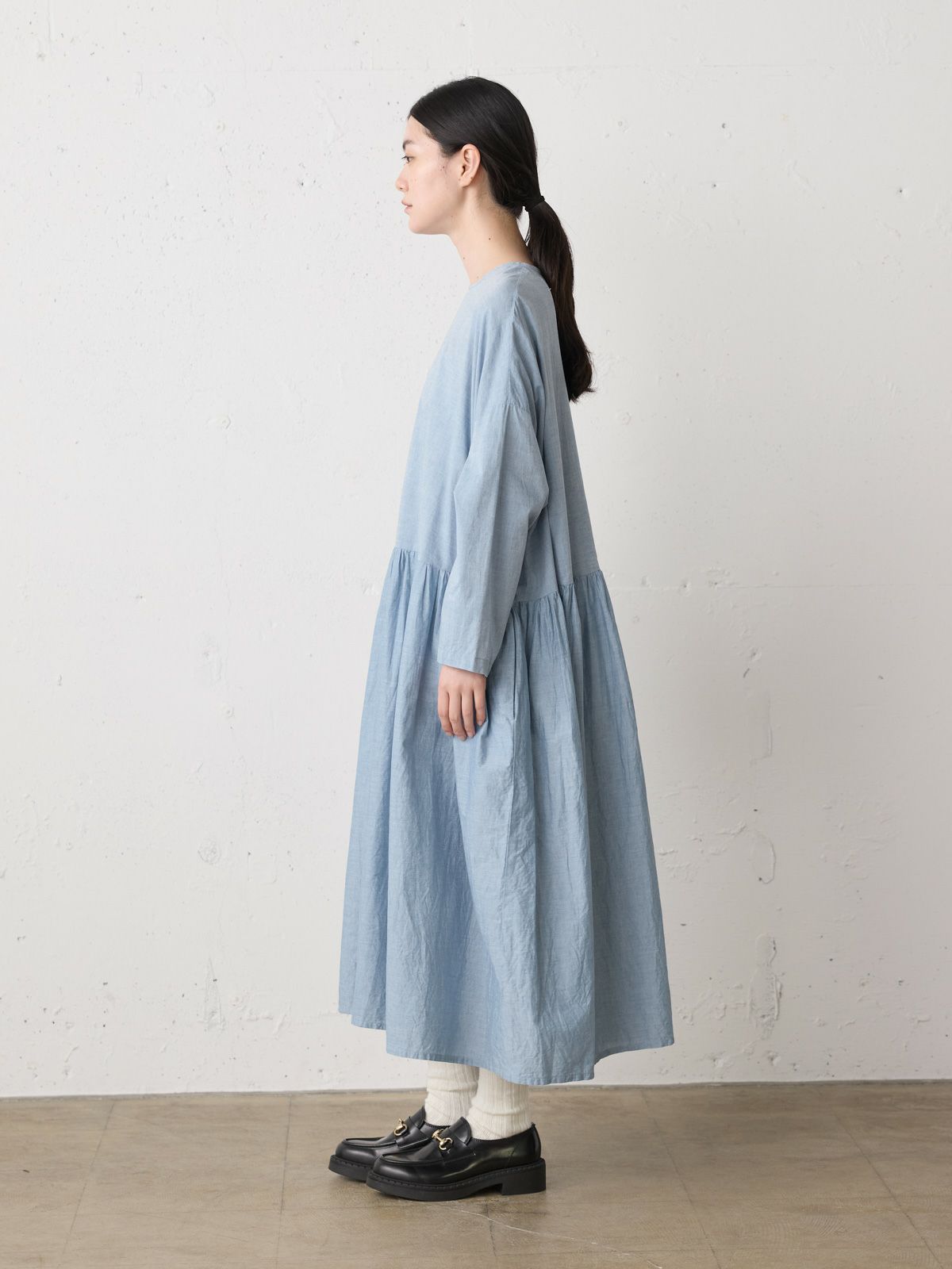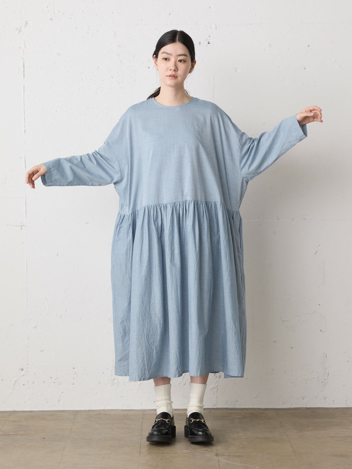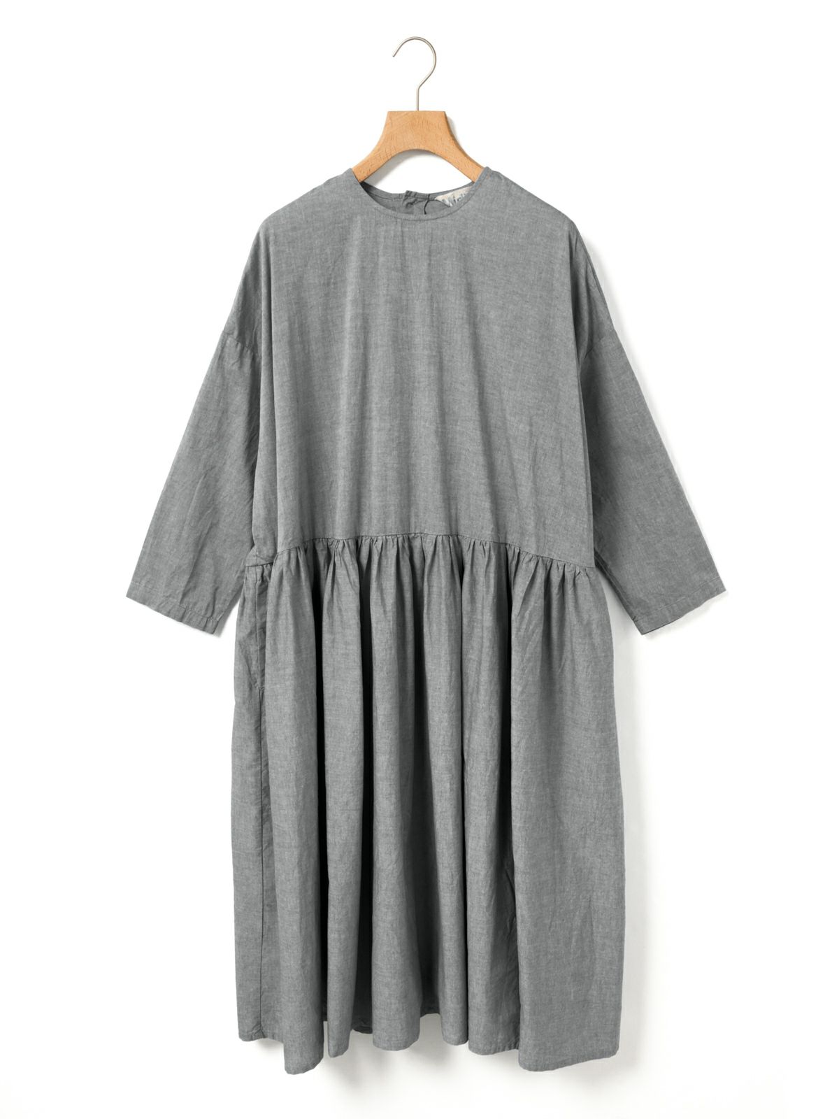 軽くてナチュラルな印象のシャンブレー素材を使用したシャンブレーギャザーワンピースです。生地をたっぷり使い、ボリューミーなワンピースに仕上げました。フンワリ感はあるものの、軽やかな雰囲気の女性らしい1枚です。バックネックにボタンが付いているので着脱のしやすいのもポイント。春のイメージですが、ニットと合わせウォーム感のあるアイテムと合わせた着こなしも素敵です。季節を長く愛用していただけるワンピースです。
