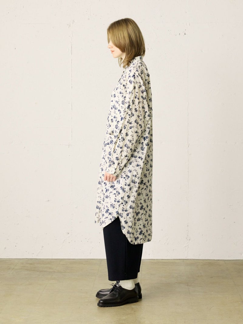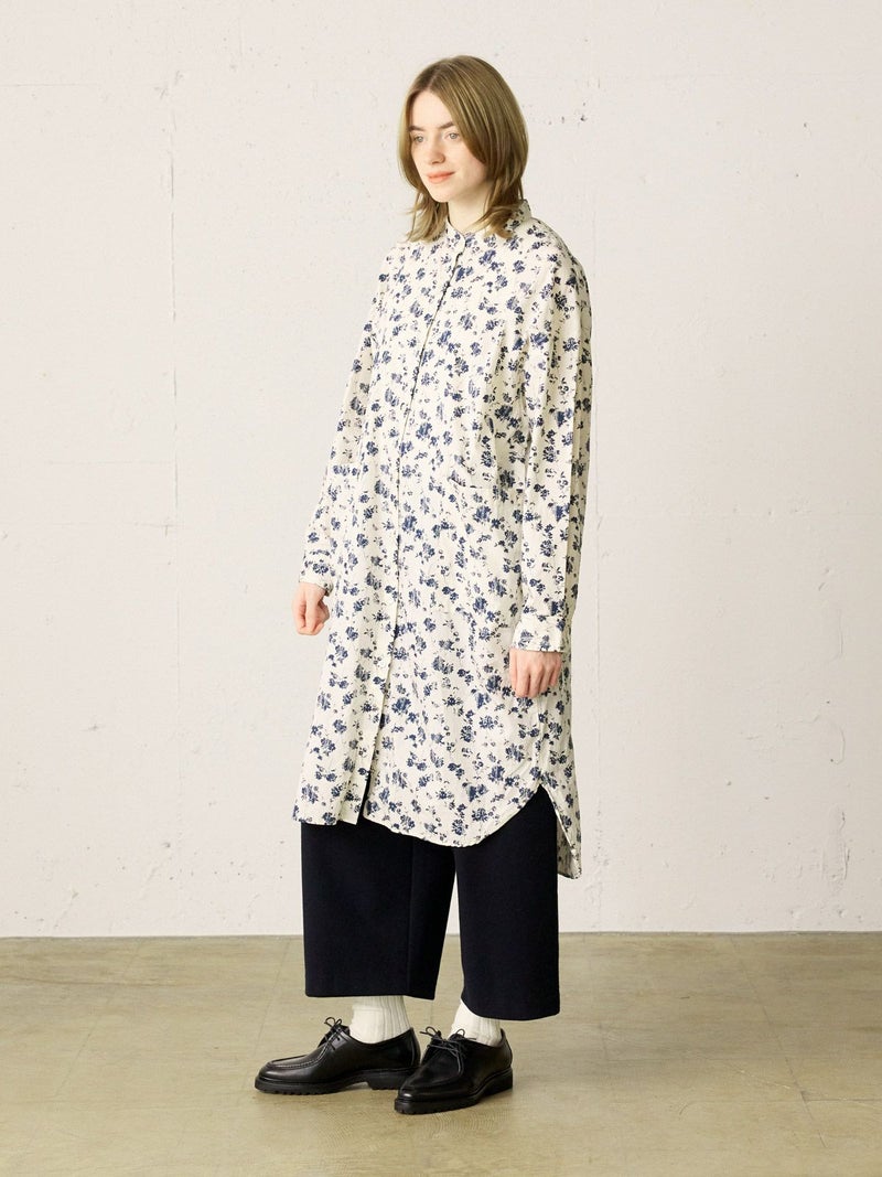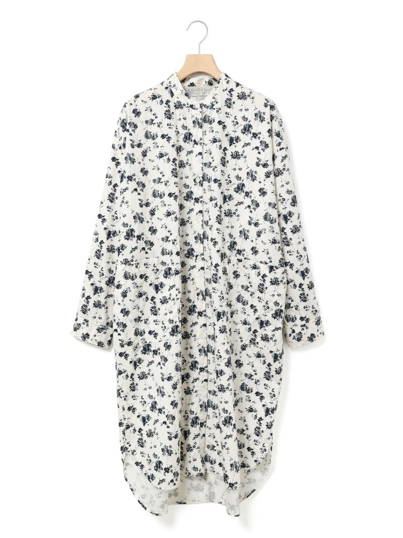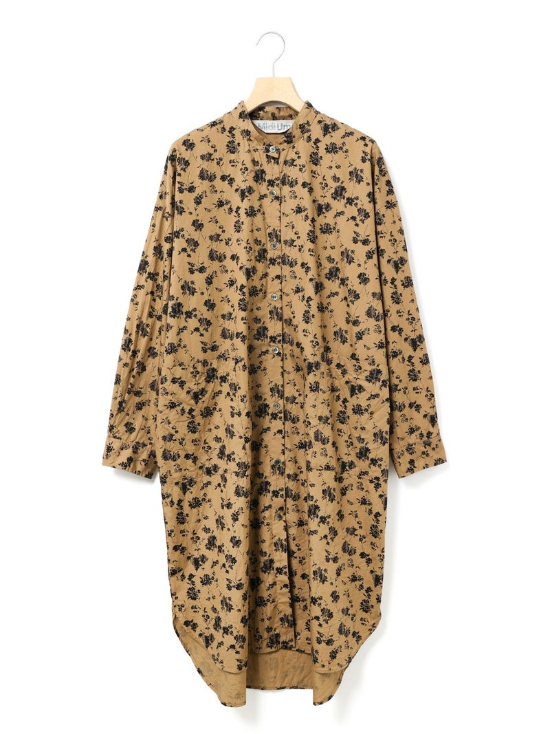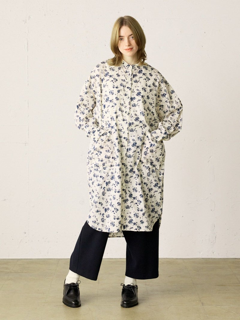 温かみのあるウールの生地にプリントしたような掠れのある花柄をシャツ地に落とし込んだオリジナルプリントシリーズ、プリントワークワンピースです。大きめのポケットがついたワークディティールのシャツワンピース。フロントボタン仕様なので好みでボタンを開けアレンジしてもらえます。タートルネックを入れたりパンツを重ねたりして暖かく着用するのがオススメ。雰囲気の異なる2色展開。 同シリーズ4-739732/プリントスキッパーチュニックも展開。