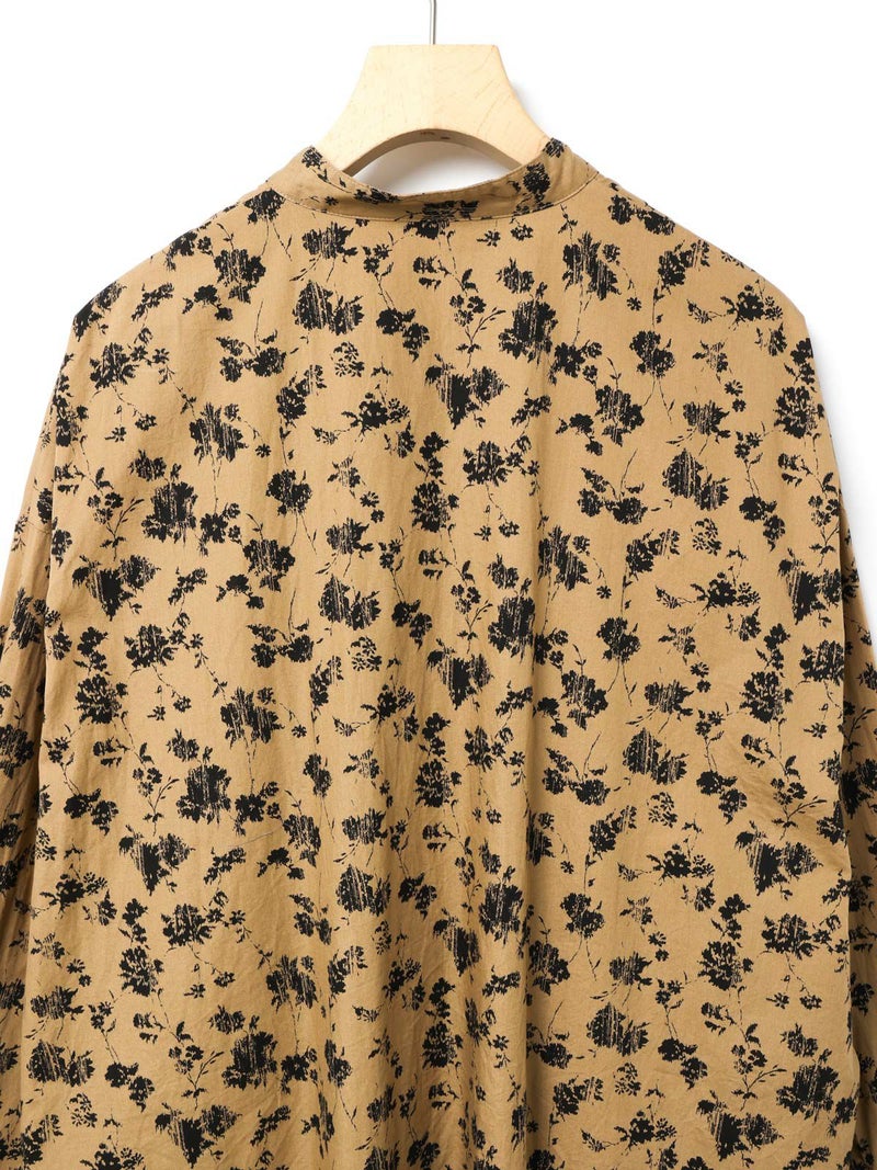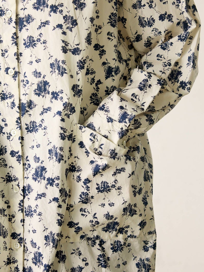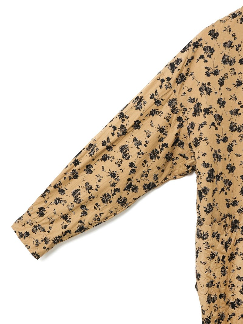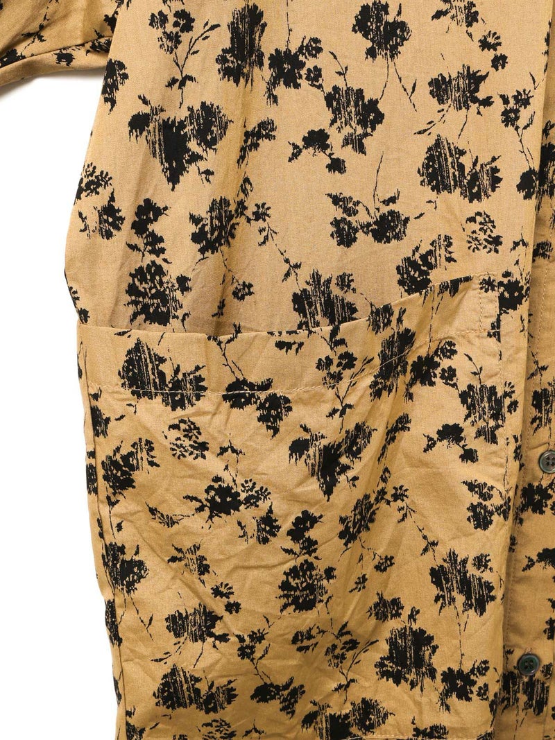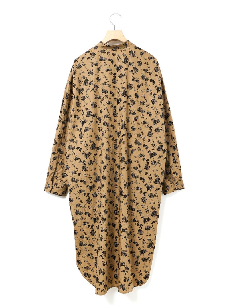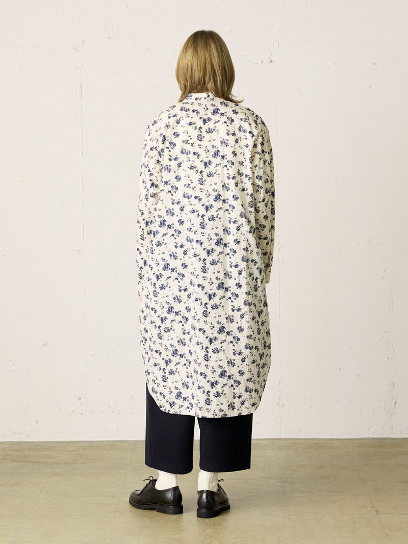 温かみのあるウールの生地にプリントしたような掠れのある花柄をシャツ地に落とし込んだオリジナルプリントシリーズ、プリントワークワンピースです。大きめのポケットがついたワークディティールのシャツワンピース。フロントボタン仕様なので好みでボタンを開けアレンジしてもらえます。タートルネックを入れたりパンツを重ねたりして暖かく着用するのがオススメ。雰囲気の異なる2色展開。 同シリーズ4-739732/プリントスキッパーチュニックも展開。
