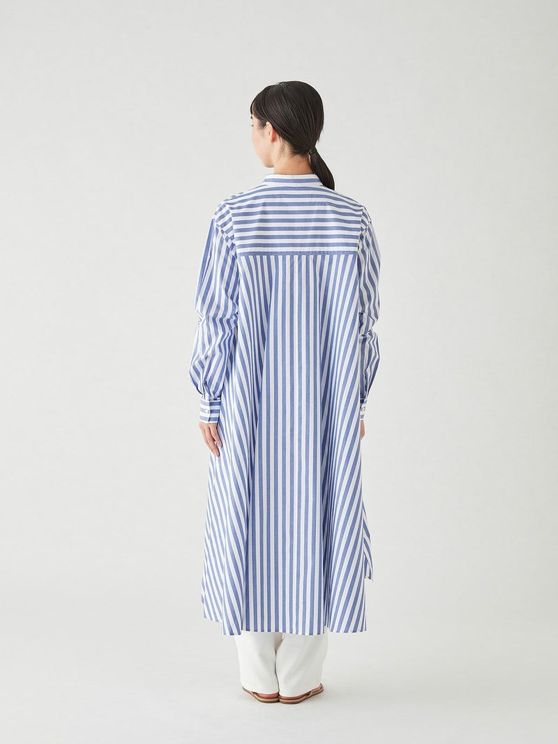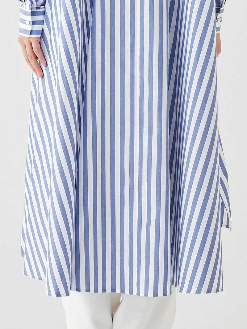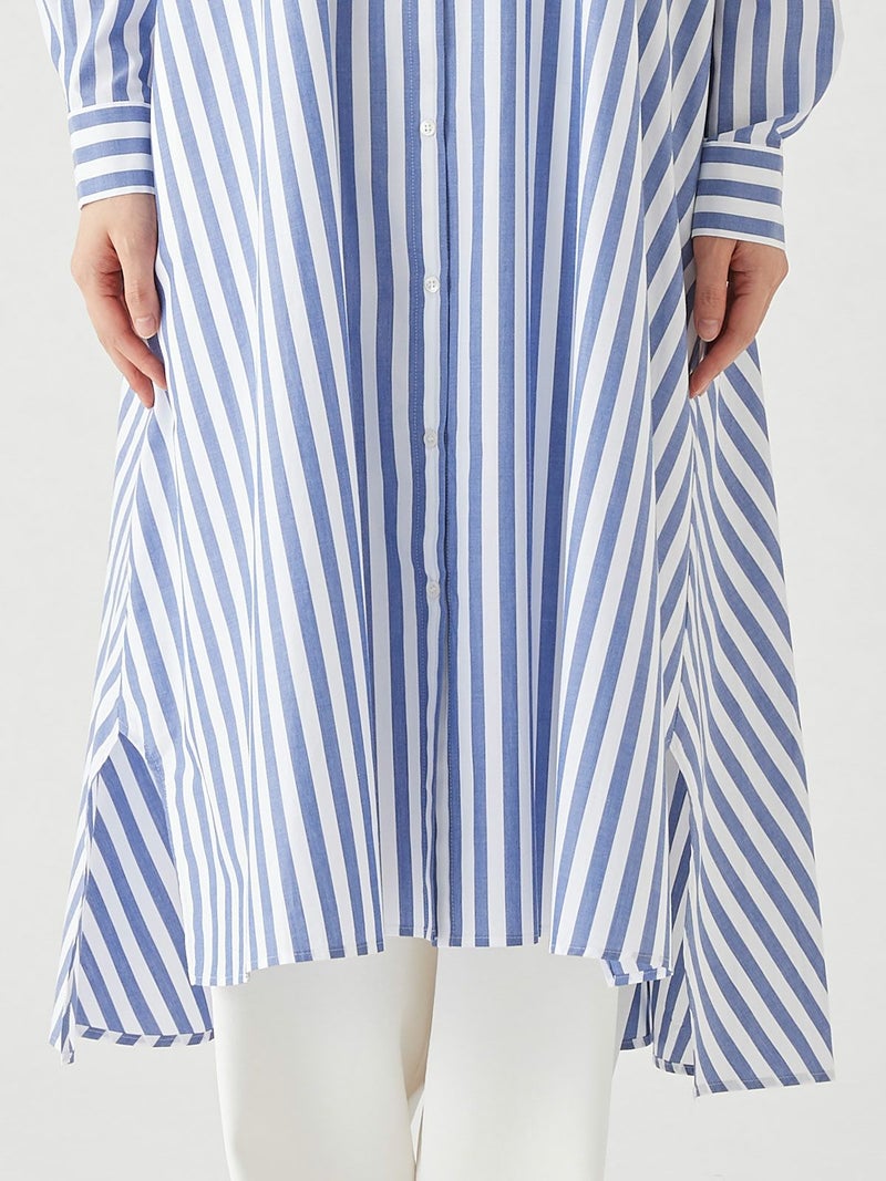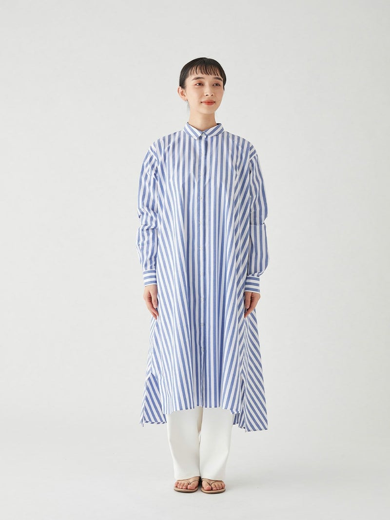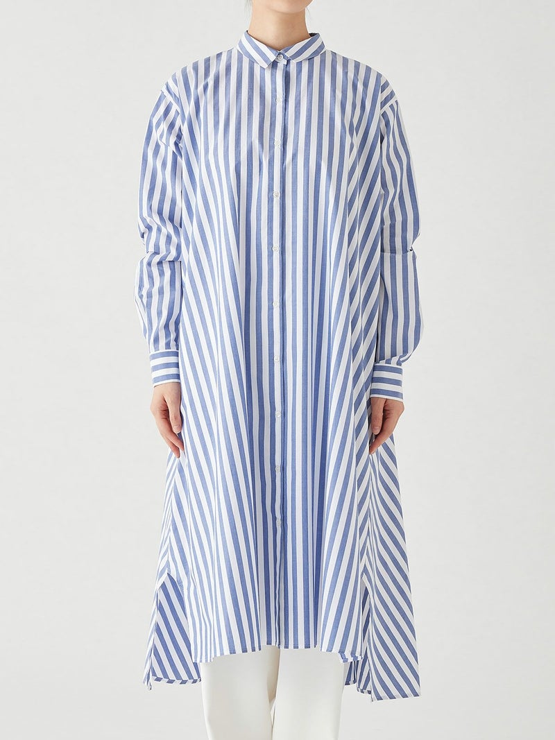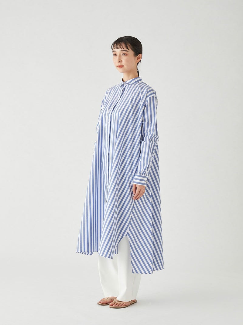 ロング丈のフレアラインがとても上品な着こなしを演出したフレアシャツワンピース。レギュラーカラーの清楚な印象のシンプルな無地と爽やかなストライプで展開しました。ストライプはオーガニックコットンを使用。フロントボタンを裾までデザインしたことで羽織での重ね着も可能。気温の変化によって袖を曲げても素敵です。長く愛用できる魅力的な1枚。