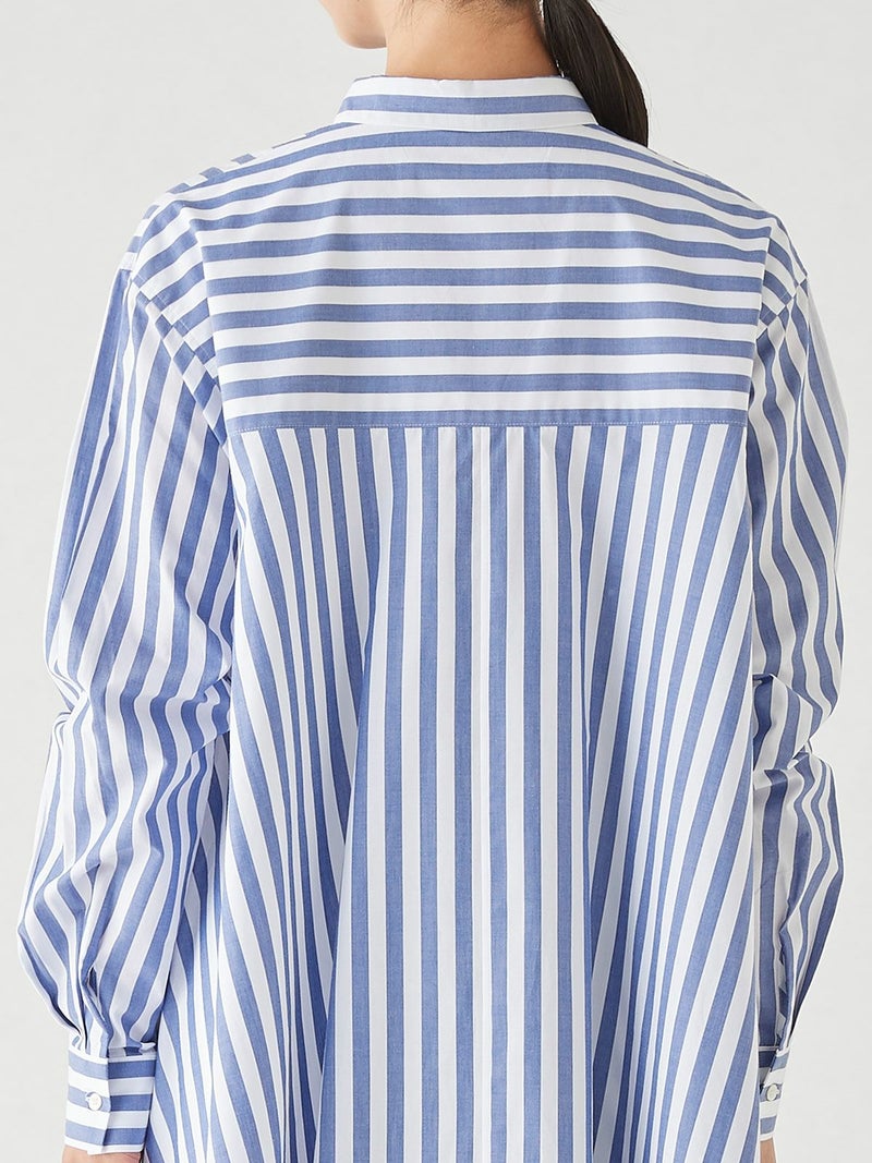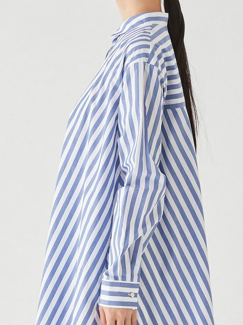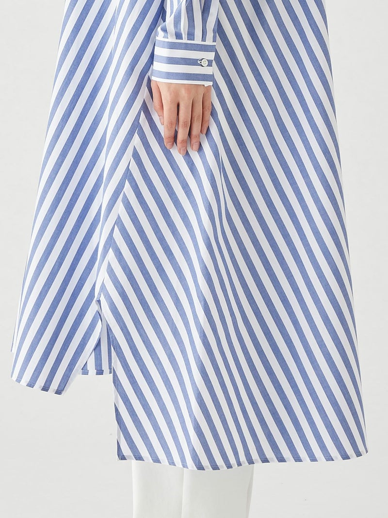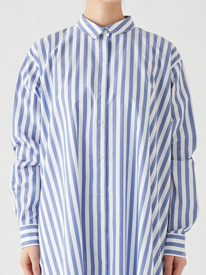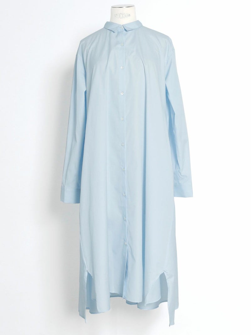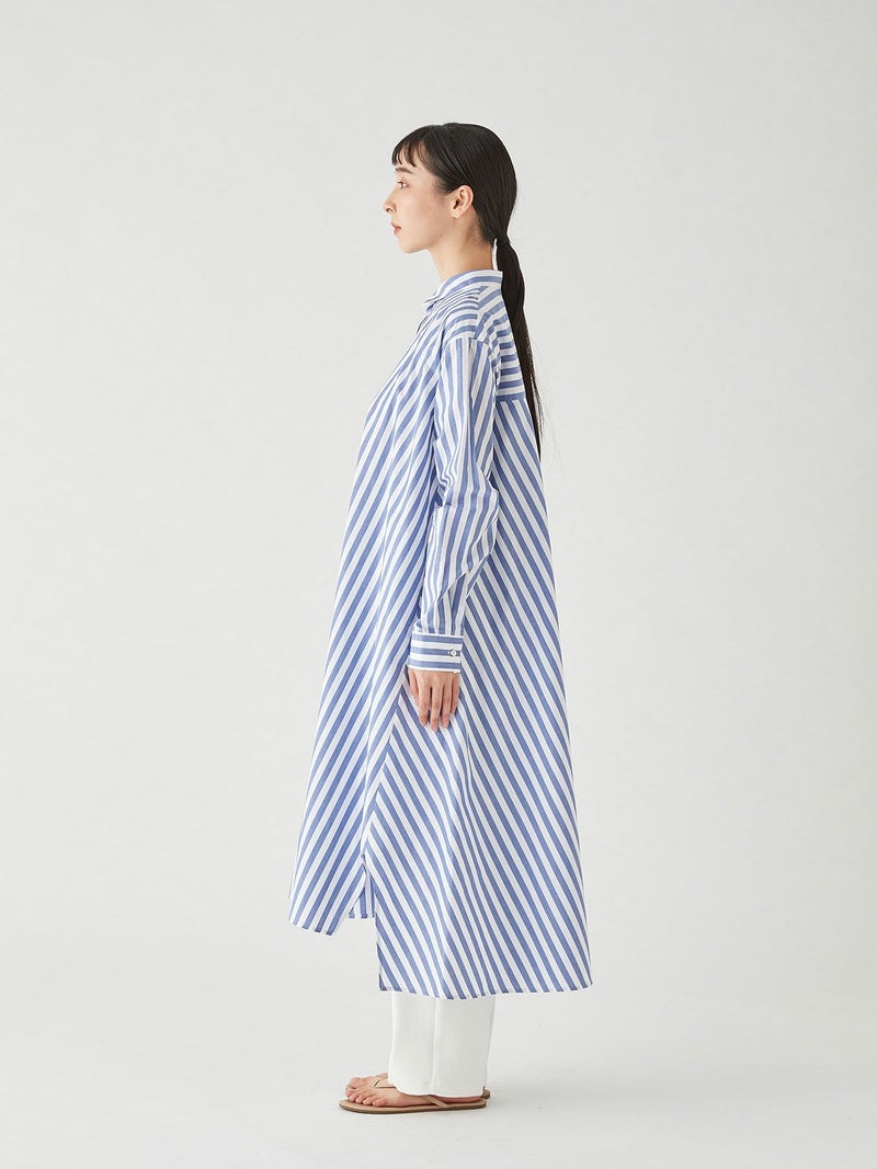 ロング丈のフレアラインがとても上品な着こなしを演出したフレアシャツワンピース。レギュラーカラーの清楚な印象のシンプルな無地と爽やかなストライプで展開しました。ストライプはオーガニックコットンを使用。フロントボタンを裾までデザインしたことで羽織での重ね着も可能。気温の変化によって袖を曲げても素敵です。長く愛用できる魅力的な1枚。