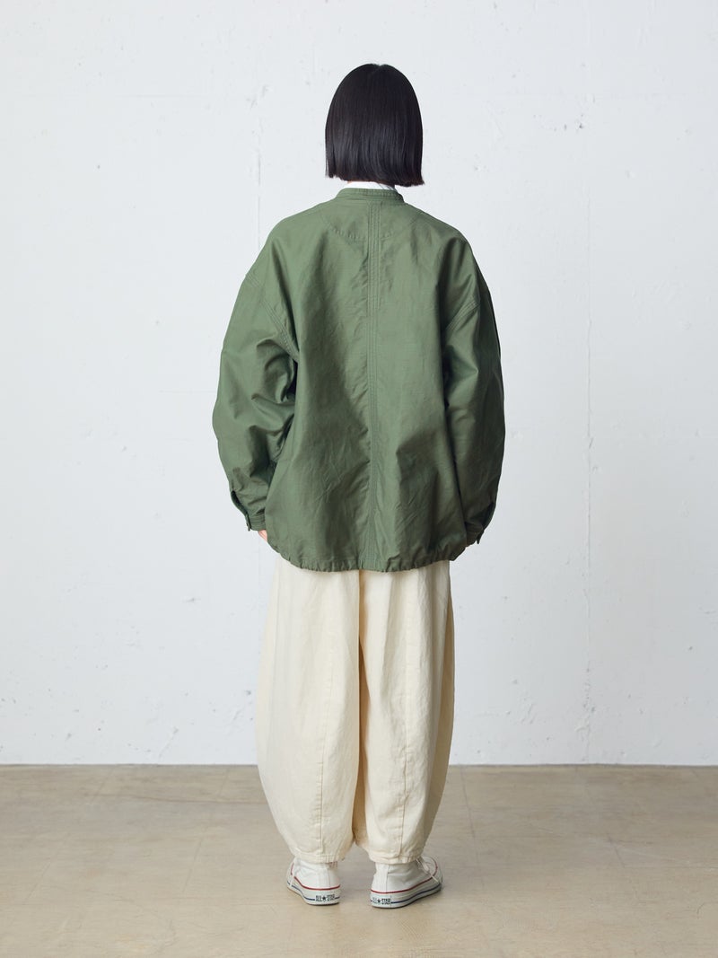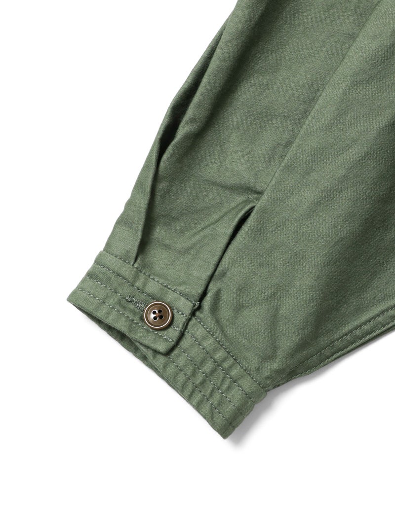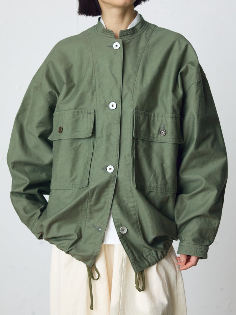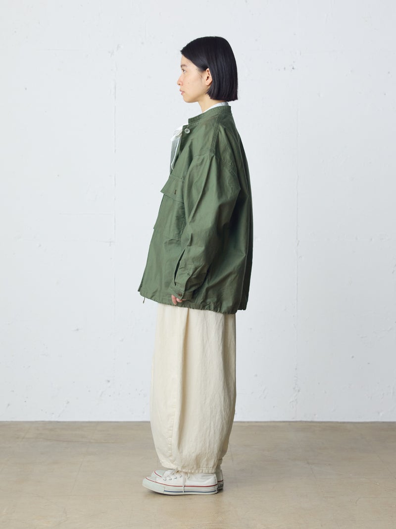 染料染と天然顔料染めのダブル染色加工を施したユーティリティカバーオールです。洗いによるシワ感や粗野感、味のある風合いにバックサテン由来のツヤがミックスされた1枚。大きなポケットとステッチワークが魅力のカバーオール。大きめのボタンや裾に紐を付けたりと、ディティールにメンズっぽい雰囲気を表現。レースアイテムと合わせて、コーデの外しにするのもオススメです。少しハリのあるしっかりとした素材感なので、ジャケット自体のシルエットが崩れにくいのも特徴。ベーシックさもありながら素材の雰囲気を感じさせる1枚です。同シリーズ1-760138/ユーティリティーカーゴパンツも展開。