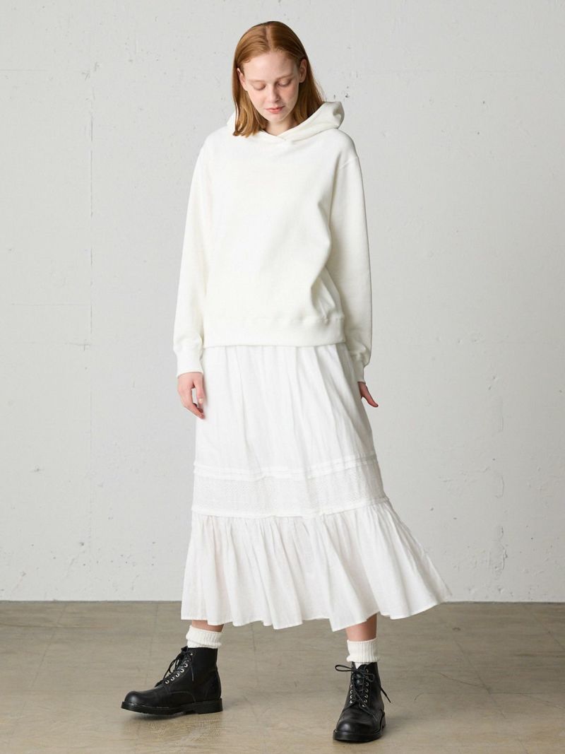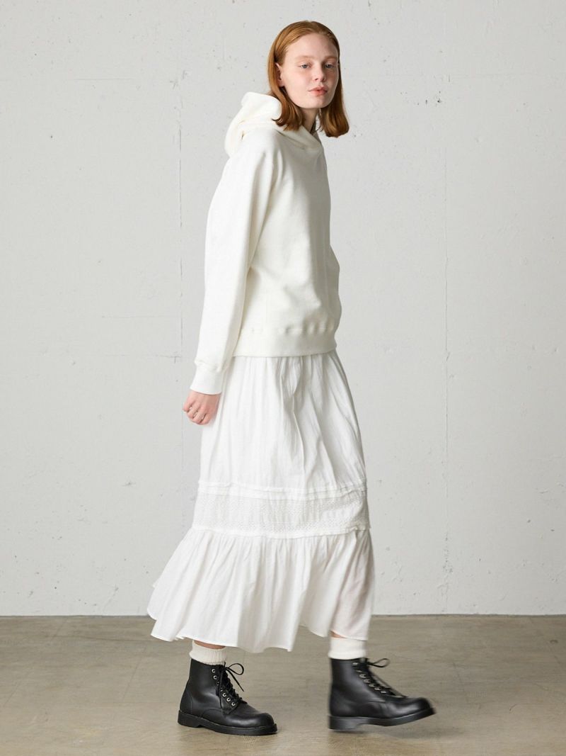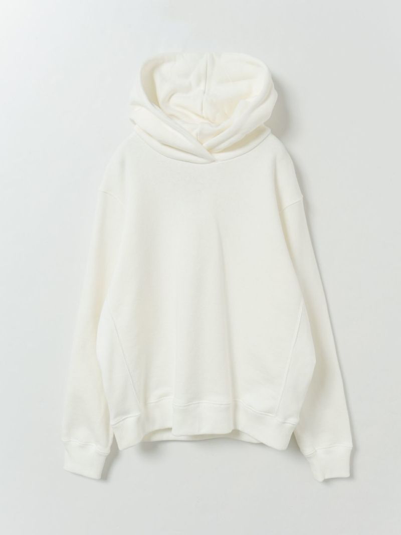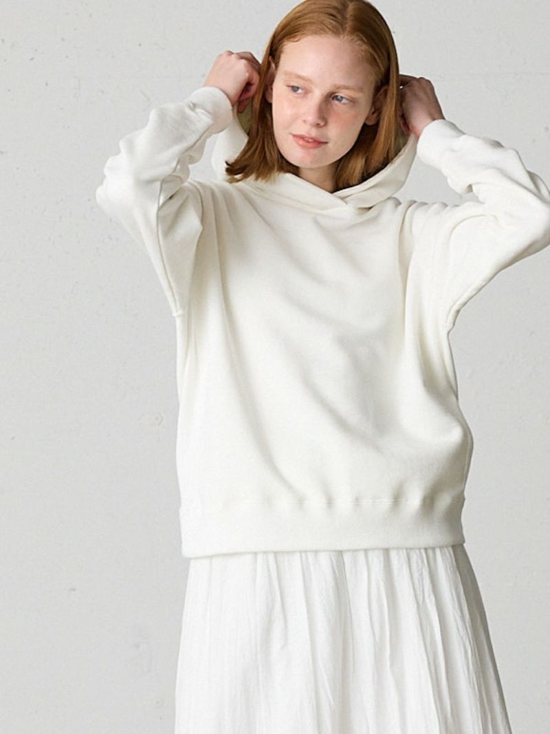 ふっくらとした風合いの吊裏毛を使用したロープウィラージャージふーっど付きプルオーバーです。糸に余計な負荷をかけずに編み立てていくので肉厚ながら固まらず柔らかい風合いが特徴。昨年からのリピート型のデザインでカジュアルな春の着こなしにお勧めの1枚です。ベーシックな3色のカラー展開でスカートにもパンツにもよく合い、着回しアイテムとして重宝します。