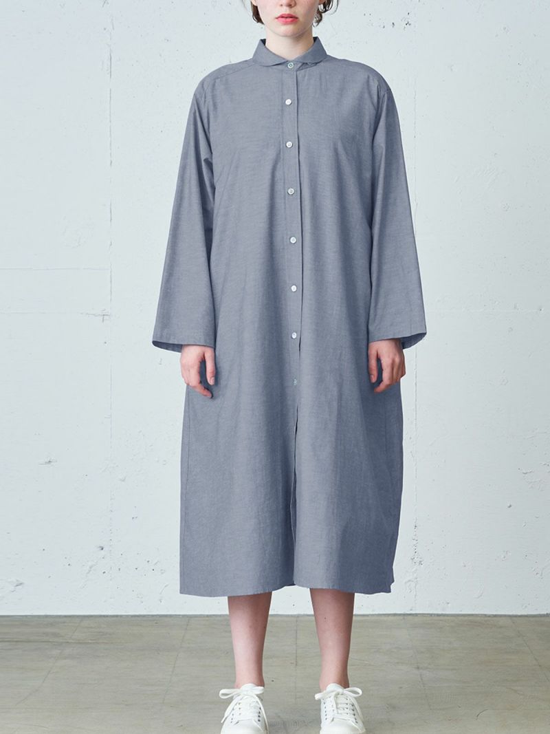 この春のベーシックアイテムとして展開した、ダンガリーシリーズのワークカラーシャツワンピースです。生地のハリは抑えめですが透けにくく、ヴィンテージ感×ワーク感を演出しました。Aラインのシルエットが女性らしさもあり、チンストラップ付でメンズライクなデザインに仕上げたワンピースです。カフス無しで袖周りはゆったり感を表現。フロントボタンの仕様になっているため、春アウターとしても着用できるナチュラルな着こなしにお勧めの1枚。