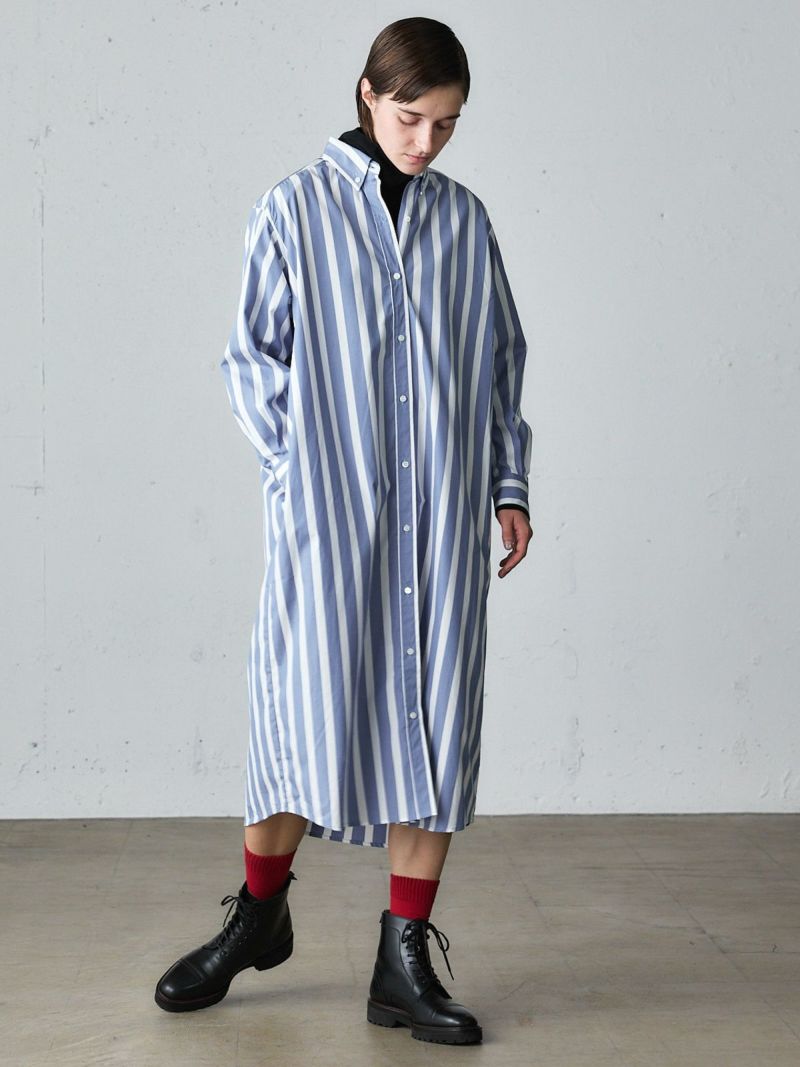 ストンと足元までストレートに落ちるボタンダウンワンピースです。無地はオーガニックコットンを使用。太目のストライプをセレクトした春らしい爽やかな着こなしを表現します。フロントボタンを開けて重ね着にもお勧め。清楚でありながら、カジュアルな着こなしも演出できる1枚。同じシリーズの1-739085(ボタンダウンシャツ)も展開。