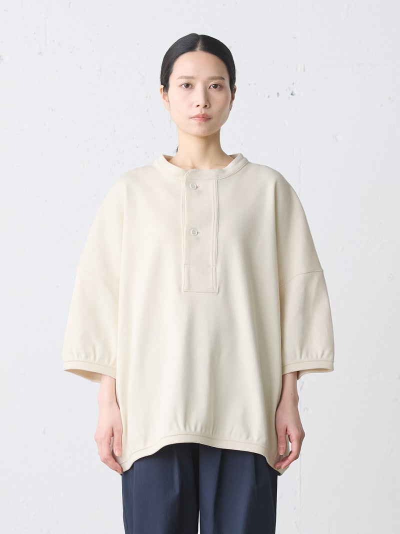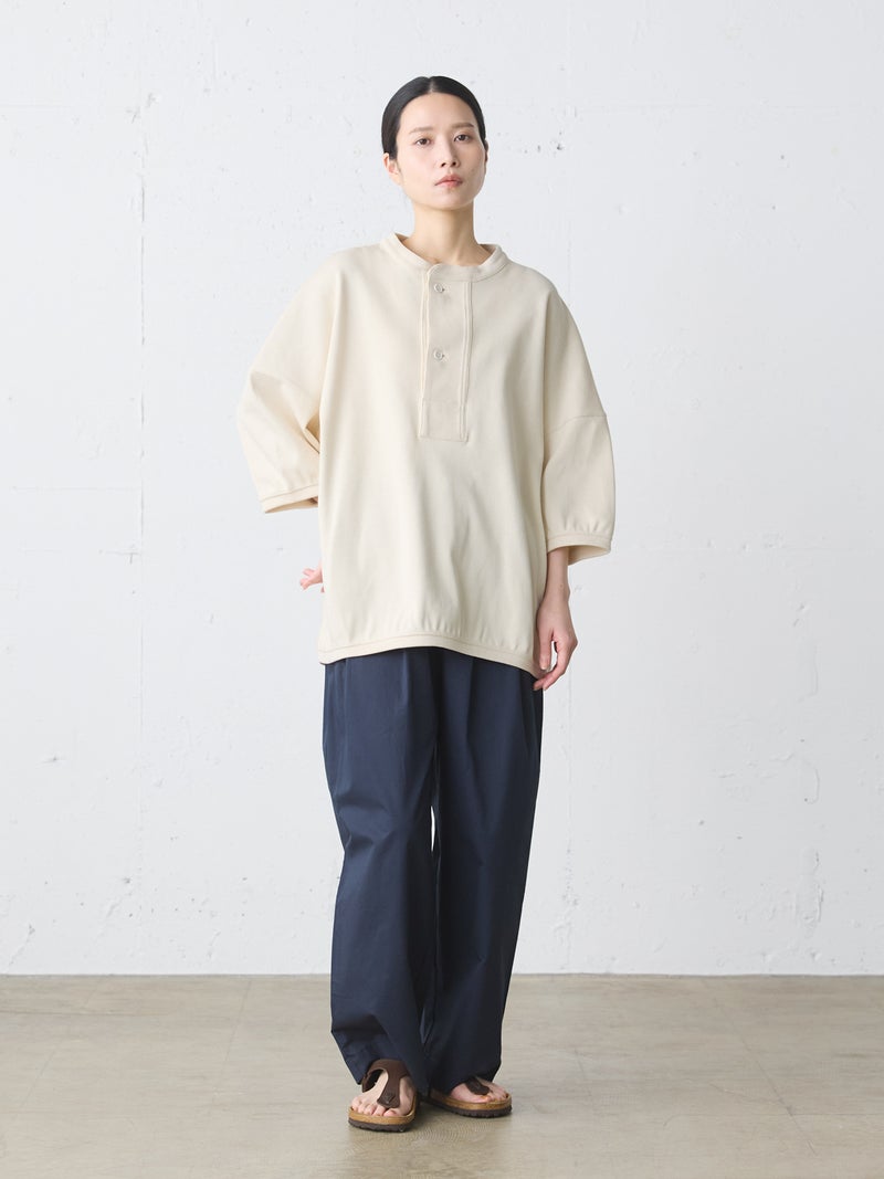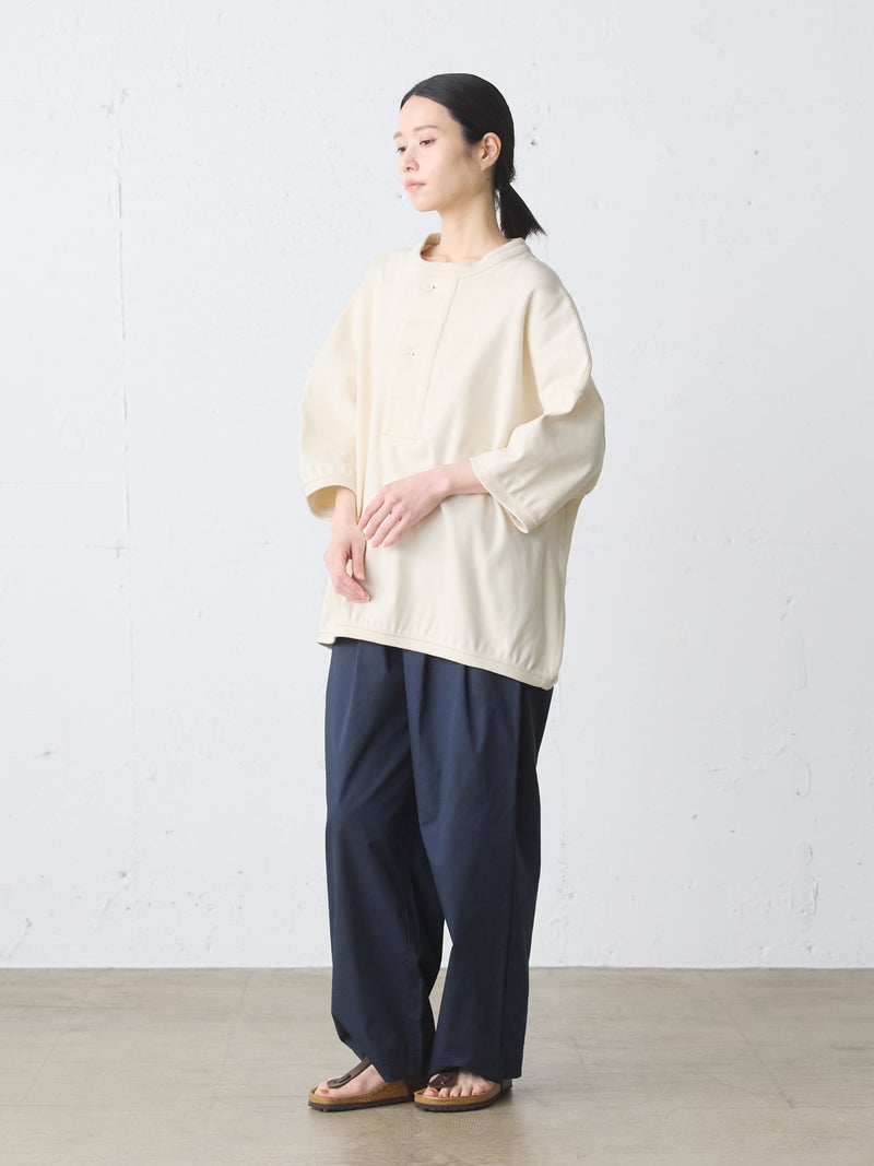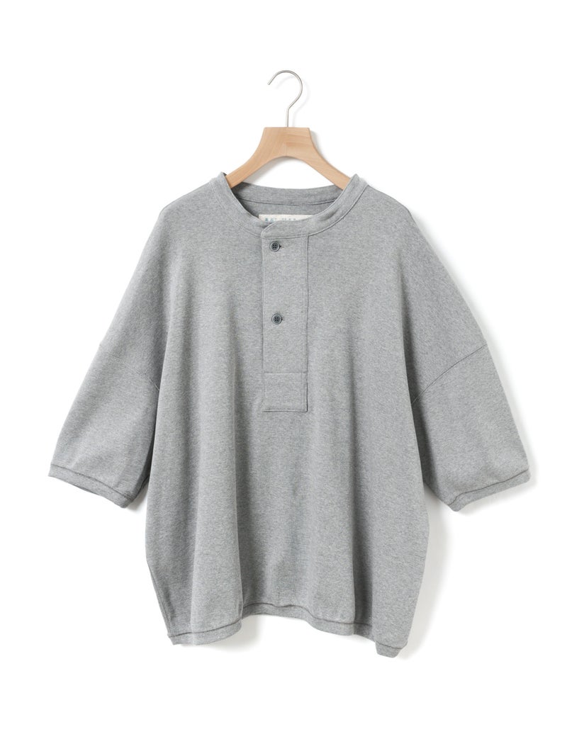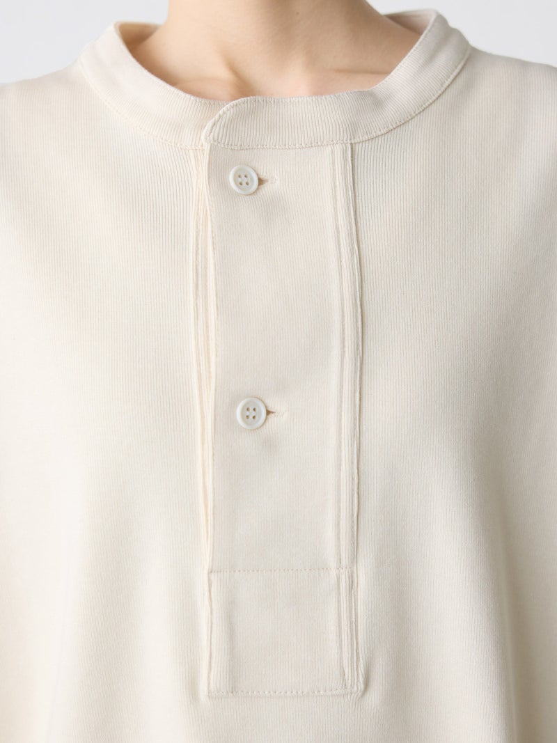 シルケット加工を施したヘンリーネックプルオーバーです。艶のある滑らかな生地にサラッとした肌触りが特徴。毛羽が少なく吸収性が高いのもポイント。カジュアルなデザインですがきれい目な着こなしを印象付けてくれます。ヒップの隠れる少し長めの丈はメンズでも着用できるほど。袖は緩い絞りになっており、ゆったり感もありながら細部に拘りのあるデザインに仕上げています。ヘンリーネックのカジュアルなデザインに、優しい色合いのナチュラルな風合いを兼ね備えた、着回しやすいアイテムです。