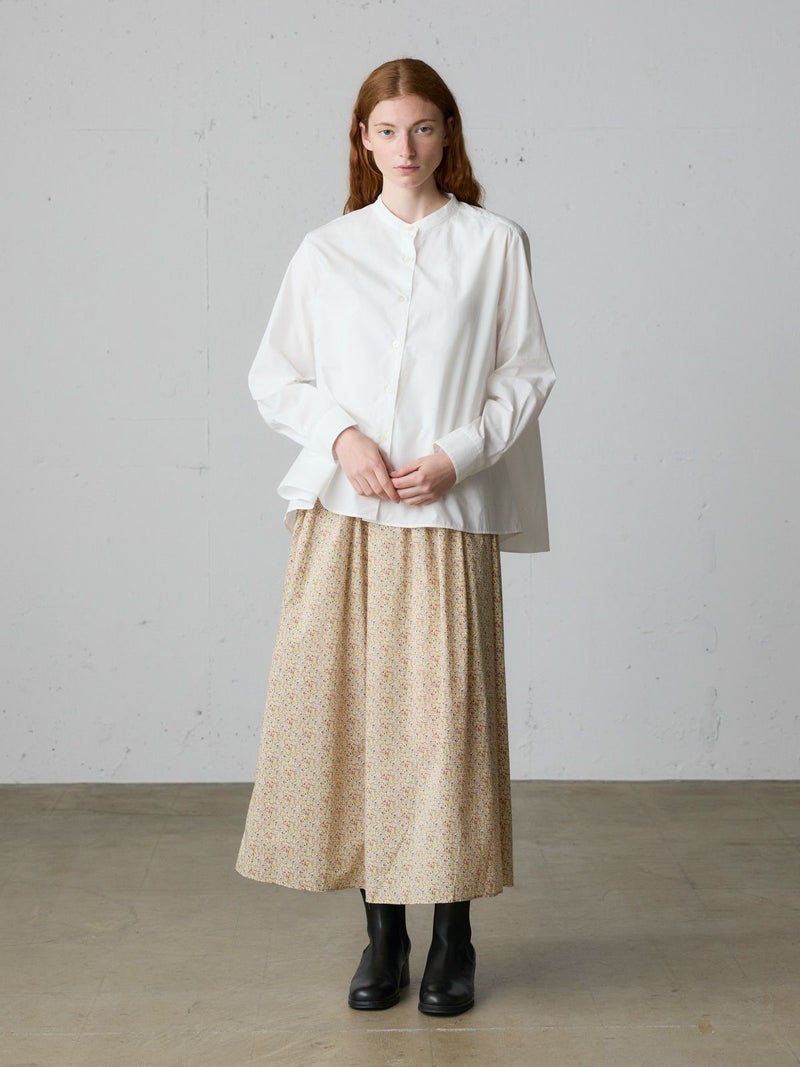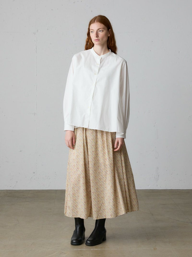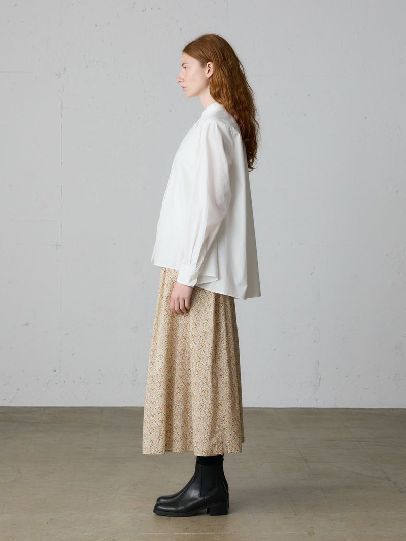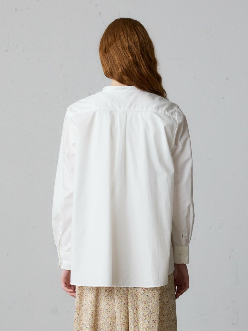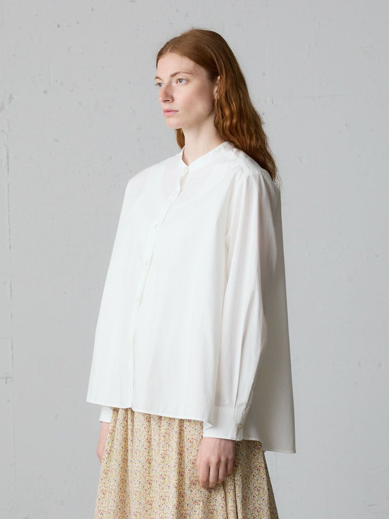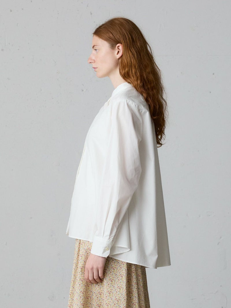 50タイプライターのMidiUmi定番のAラインバンドカラーシャツ。落ち着きのある秋色のピンクを取り入れた女性らしい清楚なシャツに仕上げました。前振りの肩ライン、狭めの細めヨークにすることで肩回りをすっきり見せ、華奢見えします。滑らかな裾ラインは前後差が付いておりしなやかなドレープラインを演出します。ベーシックに着こなせるシャツです。同シリーズの3-739996/Aラインバンドカラーシャツワンピ―スも展開。