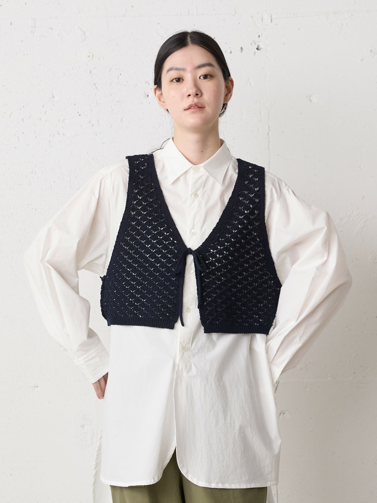 少しシャリ感のあるコットン糸を使用した2WAYショートニットベストです。前後で着用いただけるニットベストで、リボンの可愛さとベーシックなデザインを合わせ持った魅力的なベストです。着こなしによってベストの前後をどちらにするかで雰囲気の変化を楽しんでいただけます。鍵編みの透け感はインナー見えしてくれるので色・柄によって素敵な重ね着を演出してくれます。コンパクトなサイズ感に仕上げており、アクセントとして色々なアイテムにコーディネート可能。通年通して着用いただける素材です。