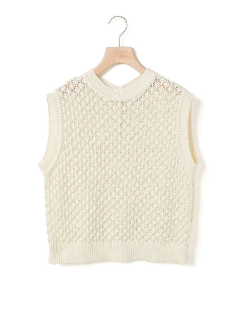 メッシュ編みコットンニットを使用したメッシュニットベストです。ハンドニット風の柄の透け感が魅力のニットアイテムです。重ね着アイテムとしてお勧めでバックの開いた魅力的なデザイン仕上げ。ワンピースやシャツなど多様なアイテムと合わせていただけます。優しい色合いは春の爽やかな着こなしを演出してくれます。ニットの重たい感じはなくベーシックアイテムとして重宝していただける1枚です。
