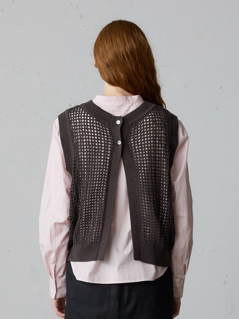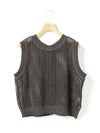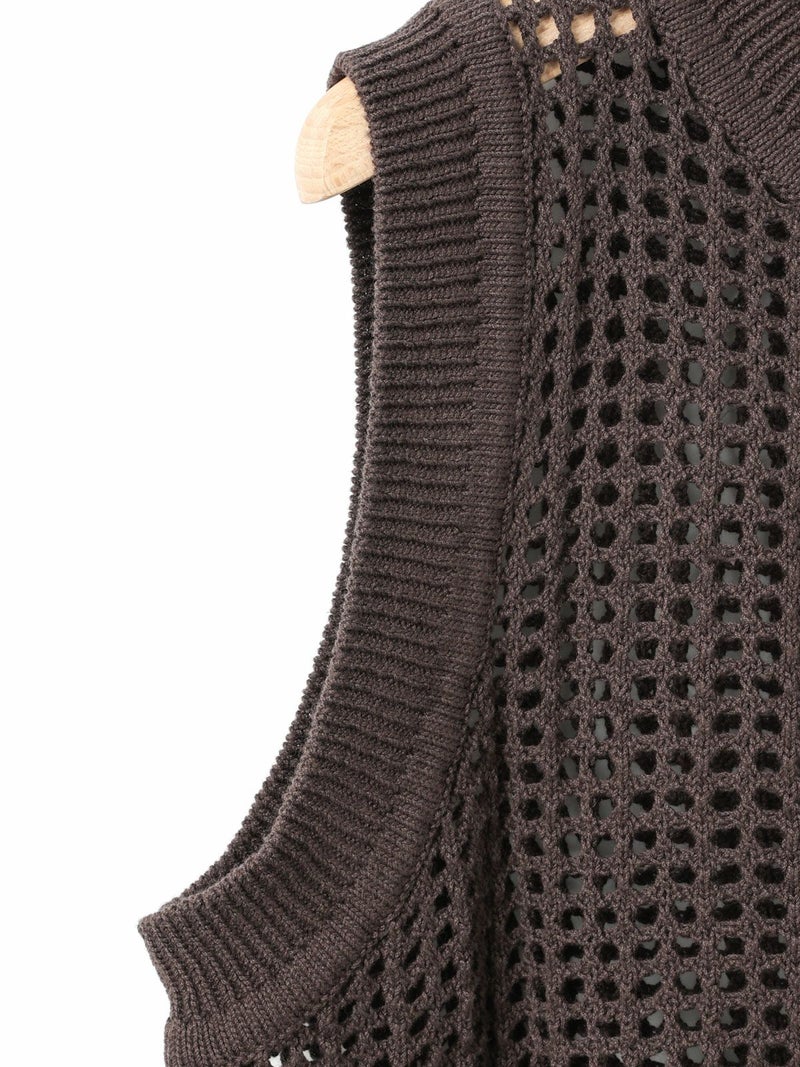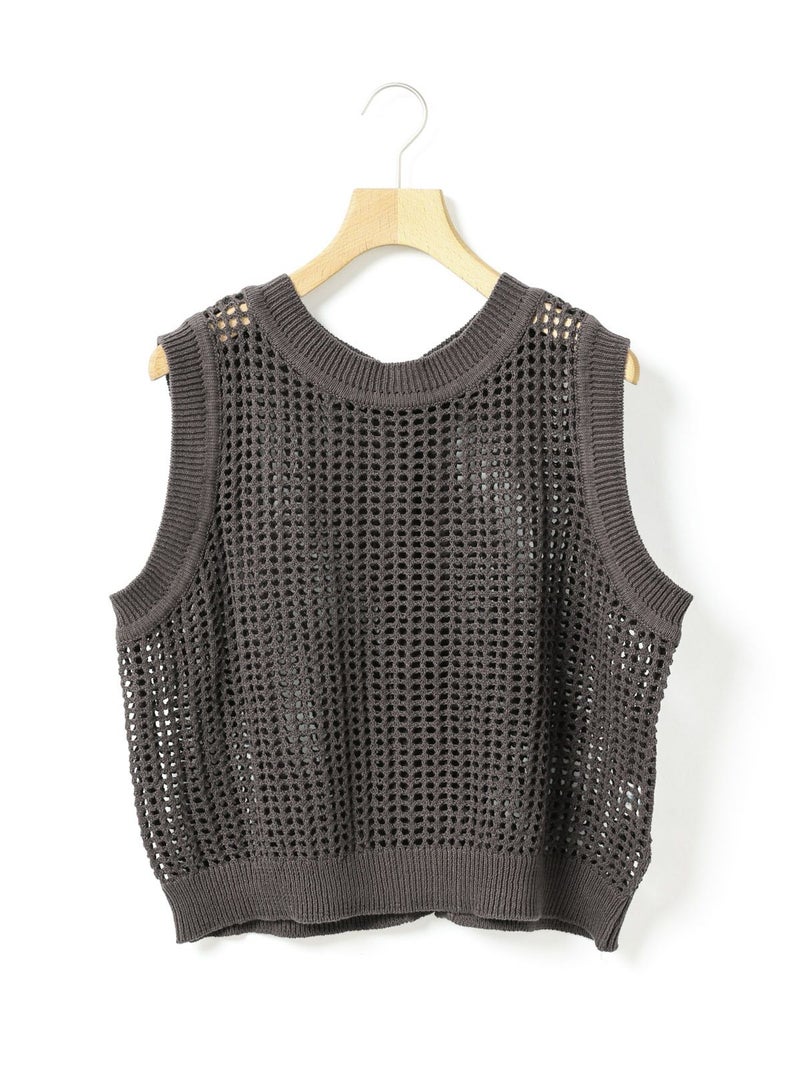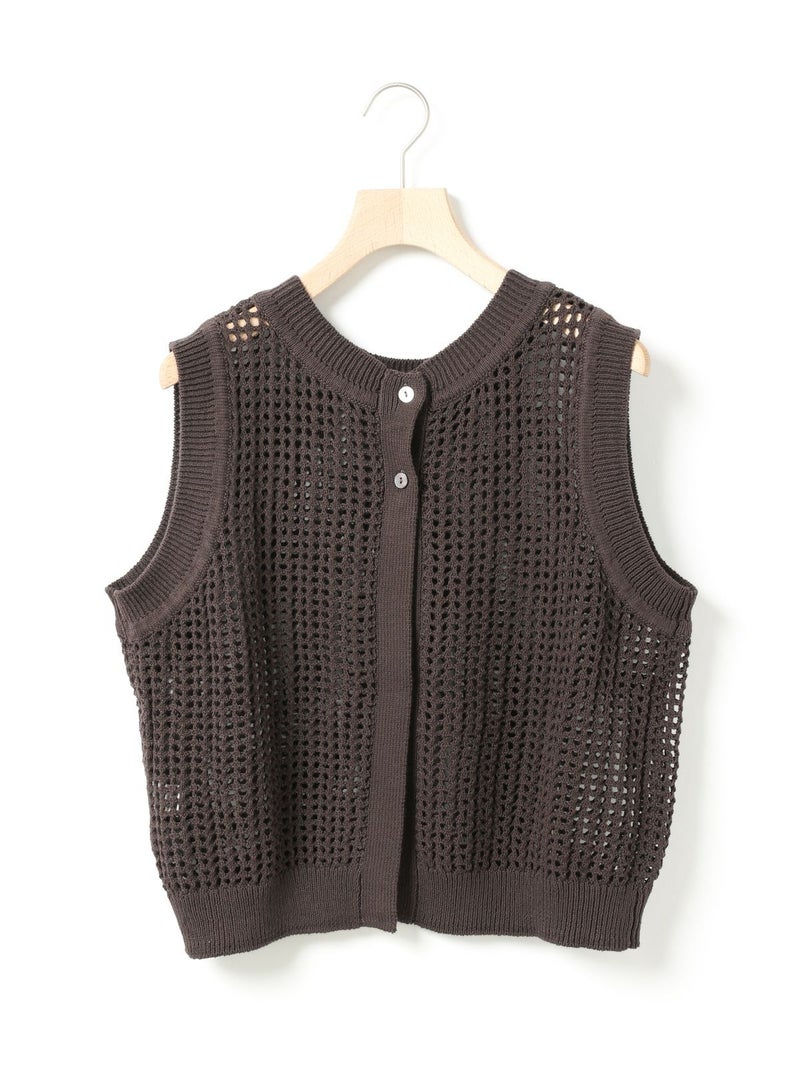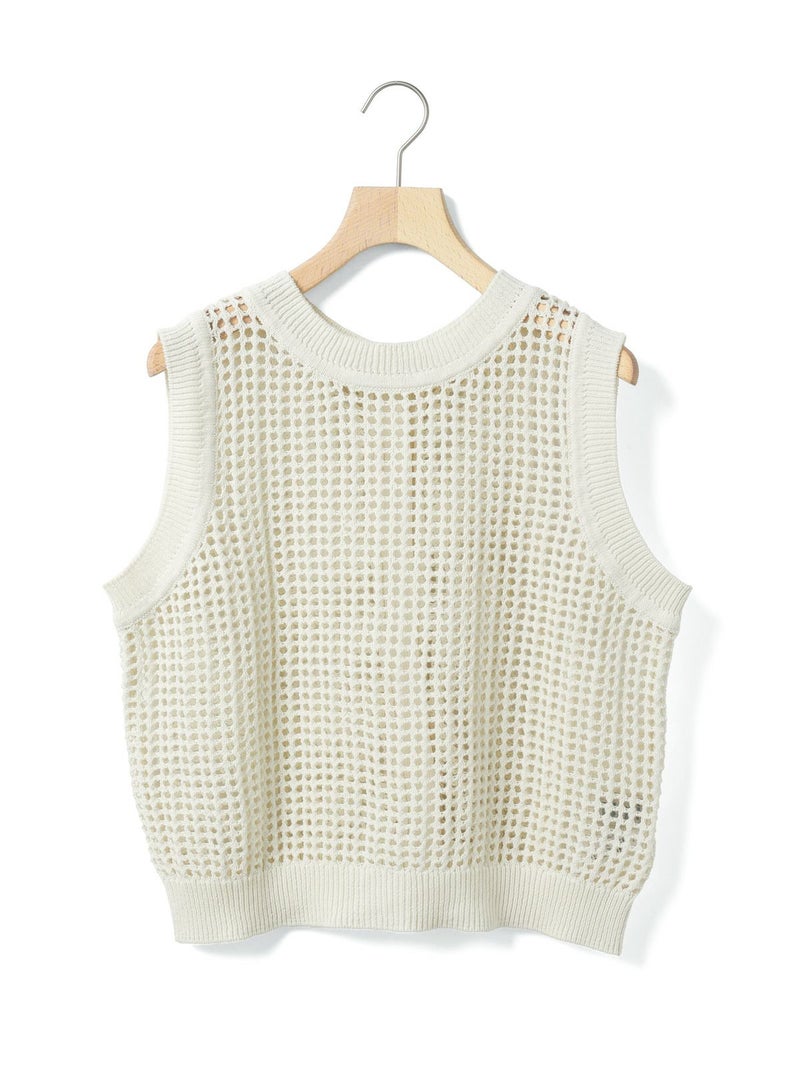 透け感のあるメッシュ素材で編み立てたニットベストです。今春人気だった「1-729797 メッシュニットベスト」をベースに、編み柄を新しくアレンジ。前後どちらでも着用できる2WAYデザインで、気分やコーディネートに合わせて印象を変えられます。Tシャツやノースリーブに重ねれば軽やかに、秋冬にはシャツやタートルネックを合わせて季節を問わず活躍。ワンピースやワイドパンツ、スカートとのレイヤードもおすすめで、1枚でさまざまな着こなしを楽しめます。さらりとしたシャリ感のあるコットン糸を使用しており、通気性がよく暑い日も快適。重ねるアイテム次第でロングシーズンお使いいただける万能な一枚です。 同シリーズ3-729932/メッシュニットジップカーディガンも展開。