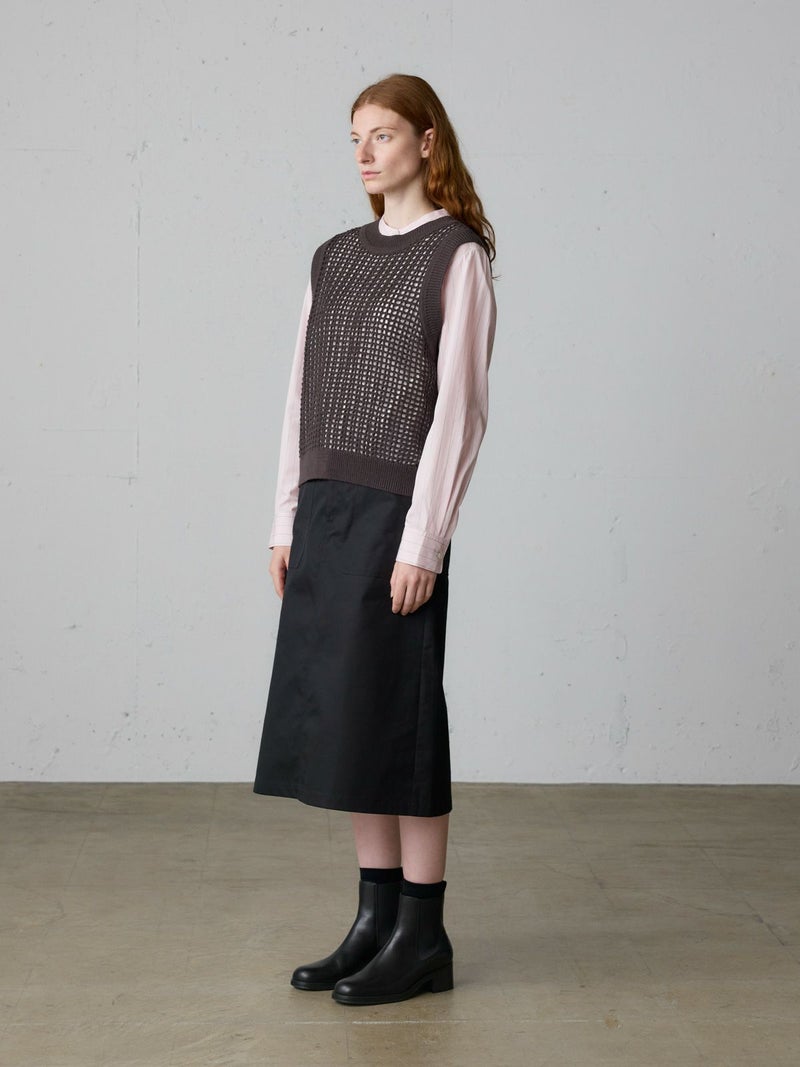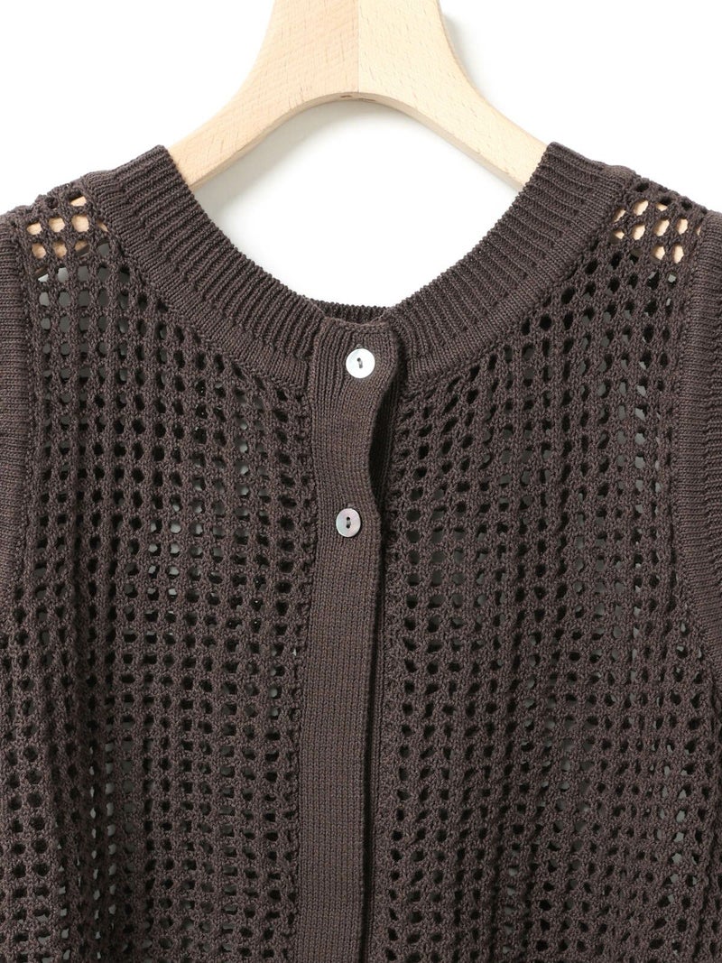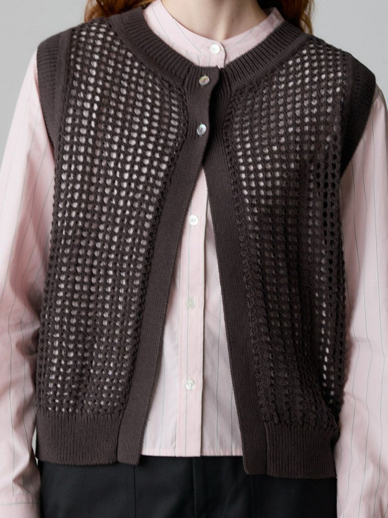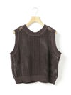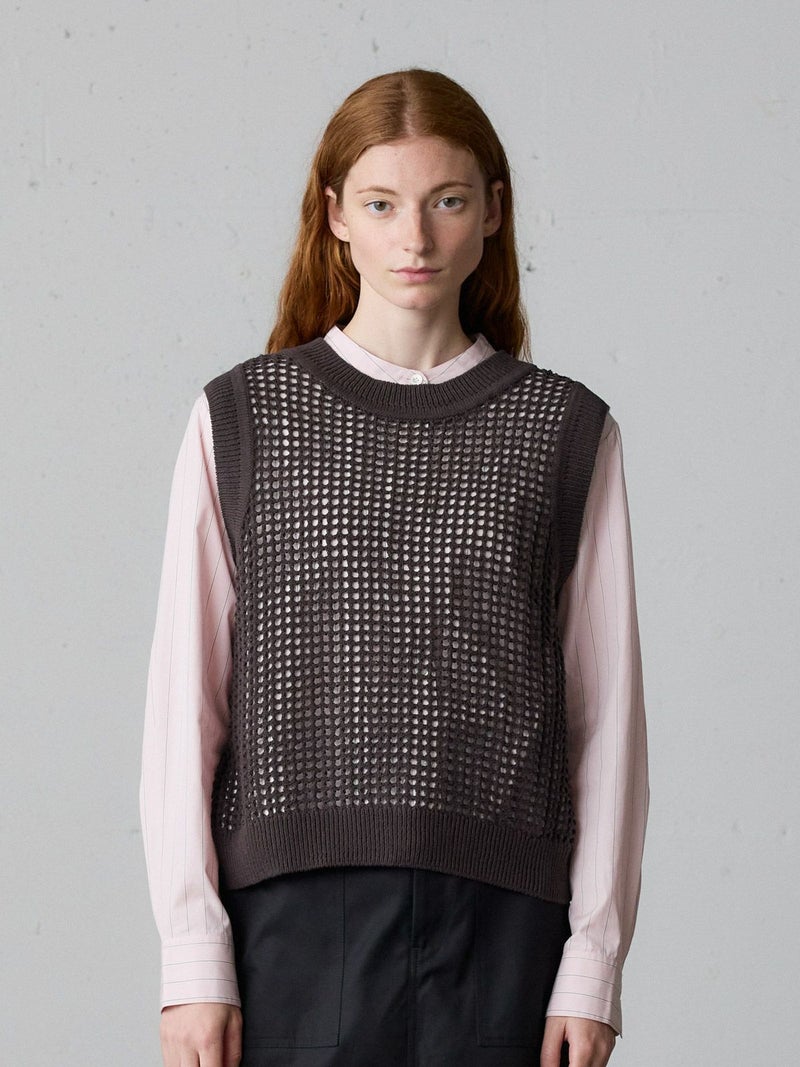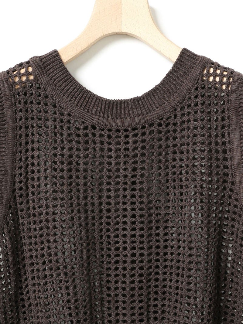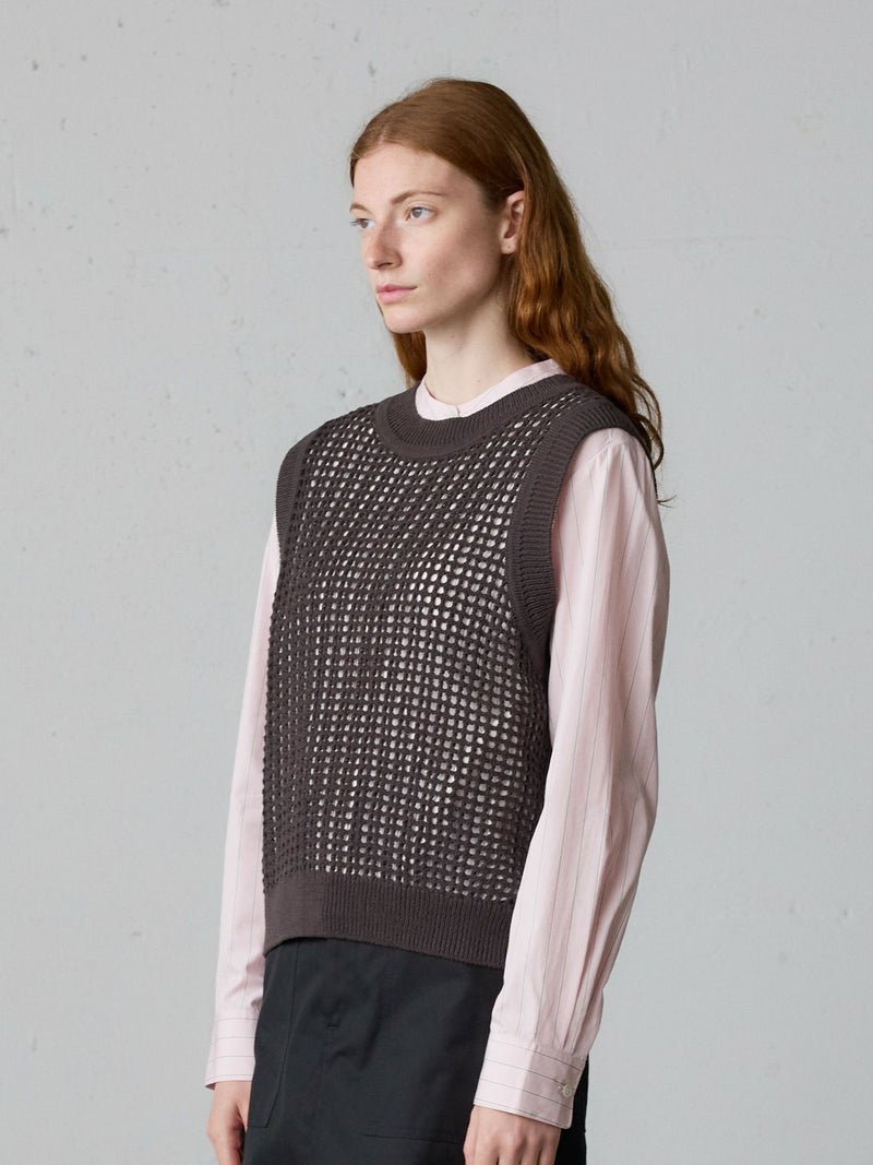 透け感のあるメッシュ素材で編み立てたニットベストです。今春人気だった「1-729797 メッシュニットベスト」をベースに、編み柄を新しくアレンジ。前後どちらでも着用できる2WAYデザインで、気分やコーディネートに合わせて印象を変えられます。Tシャツやノースリーブに重ねれば軽やかに、秋冬にはシャツやタートルネックを合わせて季節を問わず活躍。ワンピースやワイドパンツ、スカートとのレイヤードもおすすめで、1枚でさまざまな着こなしを楽しめます。さらりとしたシャリ感のあるコットン糸を使用しており、通気性がよく暑い日も快適。重ねるアイテム次第でロングシーズンお使いいただける万能な一枚です。 同シリーズ3-729932/メッシュニットジップカーディガンも展開。