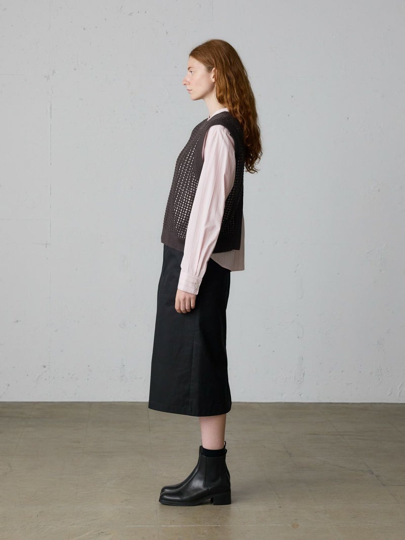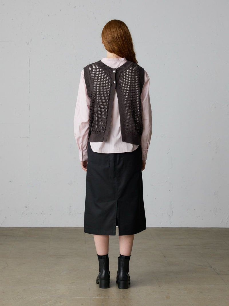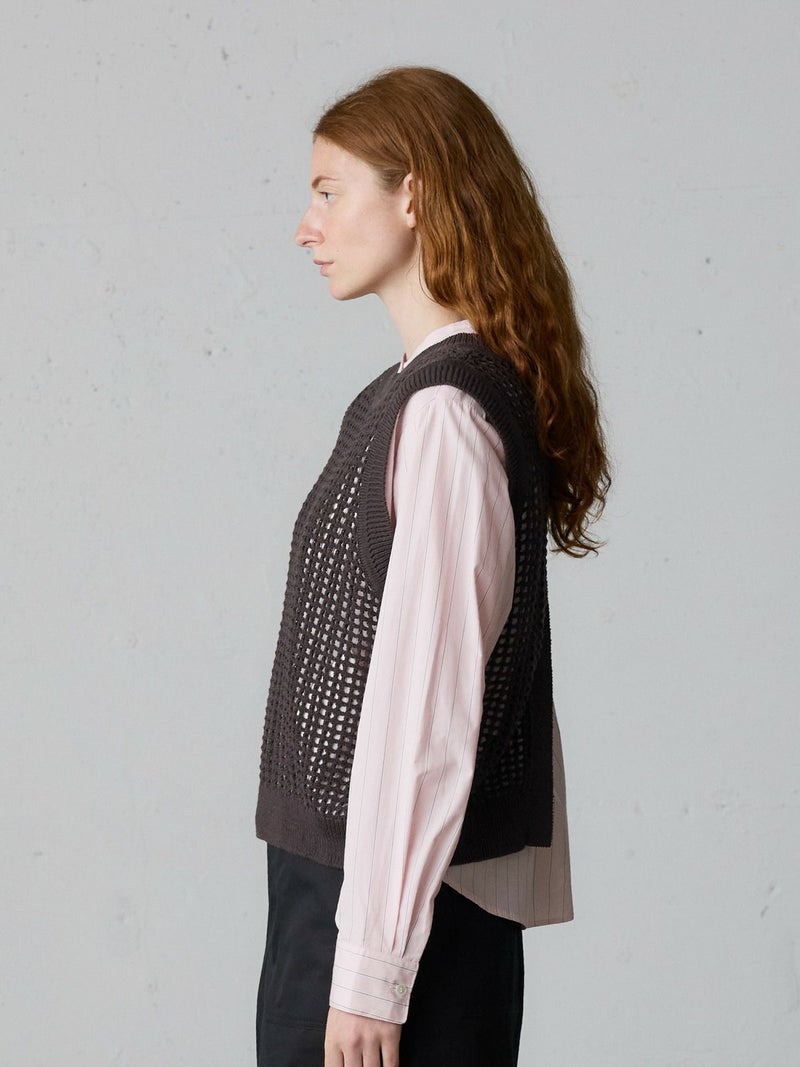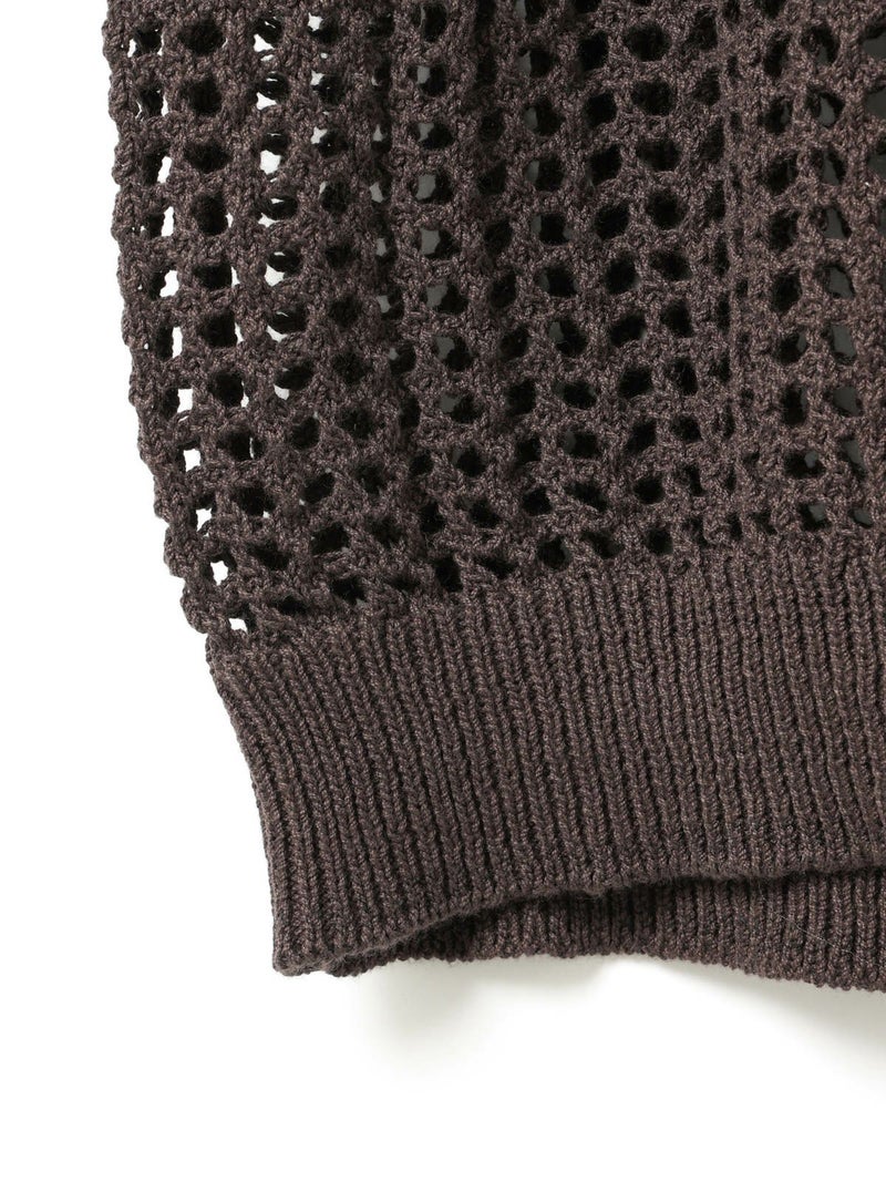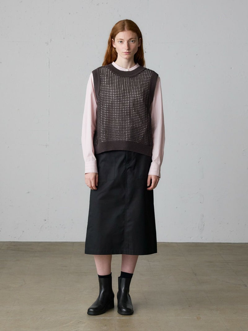 透け感のあるメッシュ素材で編み立てたニットベストです。今春人気だった「1-729797 メッシュニットベスト」をベースに、編み柄を新しくアレンジ。前後どちらでも着用できる2WAYデザインで、気分やコーディネートに合わせて印象を変えられます。Tシャツやノースリーブに重ねれば軽やかに、秋冬にはシャツやタートルネックを合わせて季節を問わず活躍。ワンピースやワイドパンツ、スカートとのレイヤードもおすすめで、1枚でさまざまな着こなしを楽しめます。さらりとしたシャリ感のあるコットン糸を使用しており、通気性がよく暑い日も快適。重ねるアイテム次第でロングシーズンお使いいただける万能な一枚です。 同シリーズ3-729932/メッシュニットジップカーディガンも展開。
