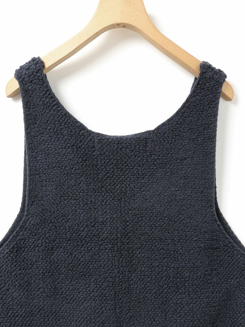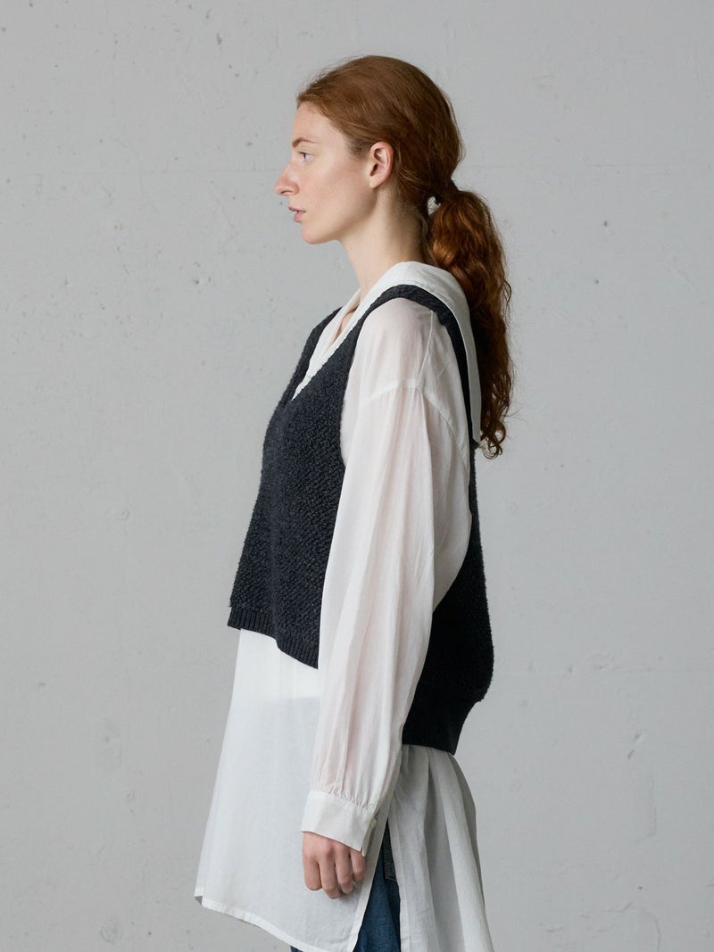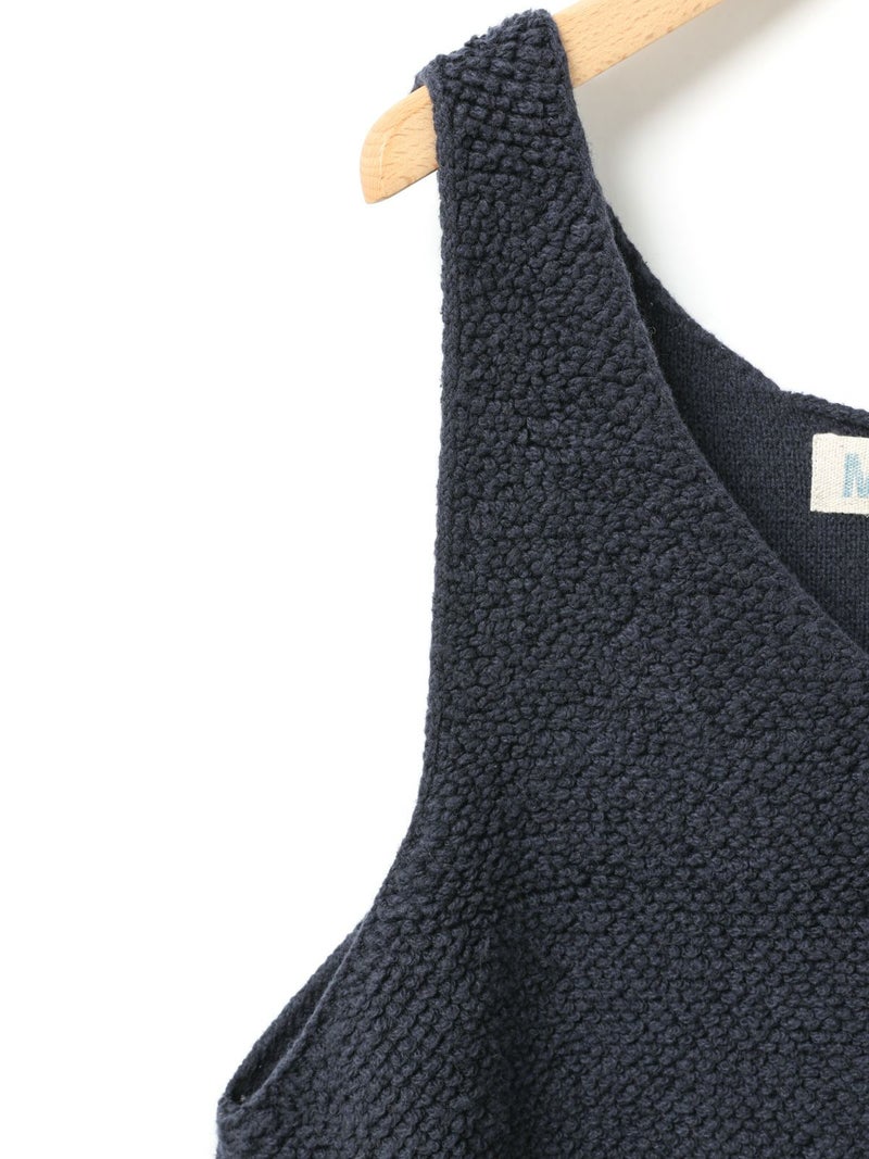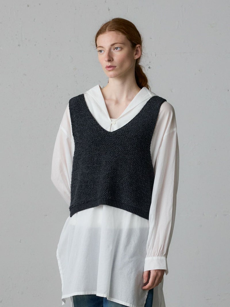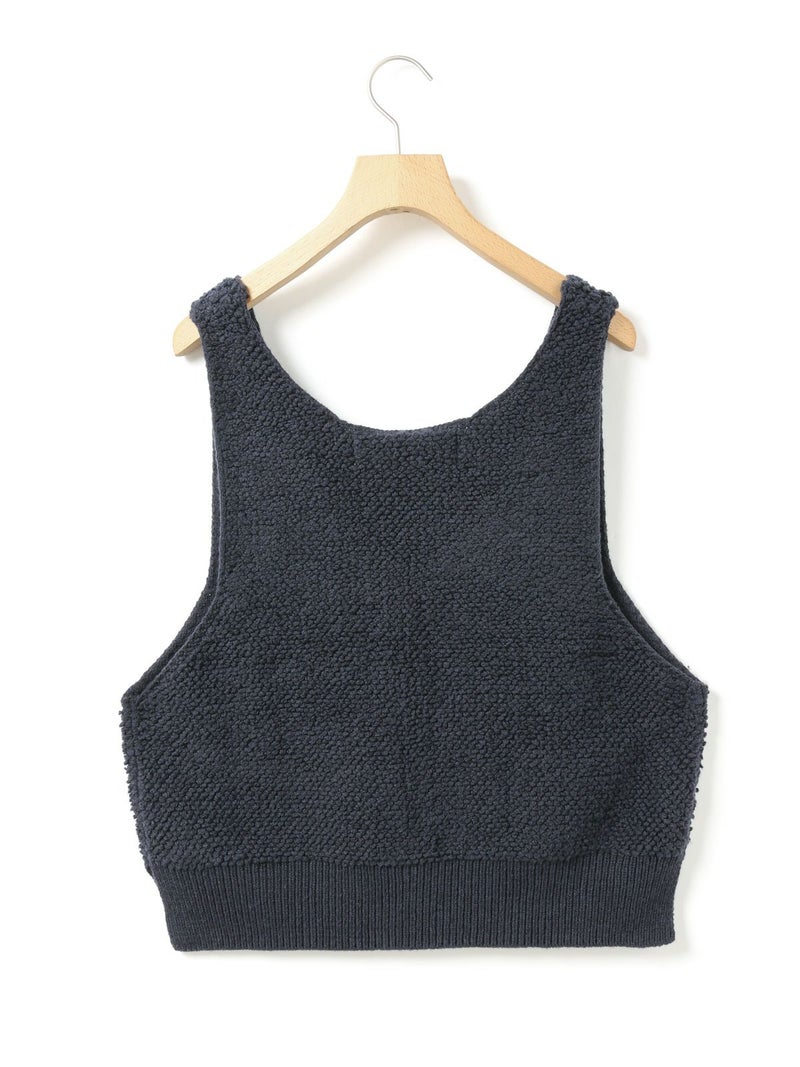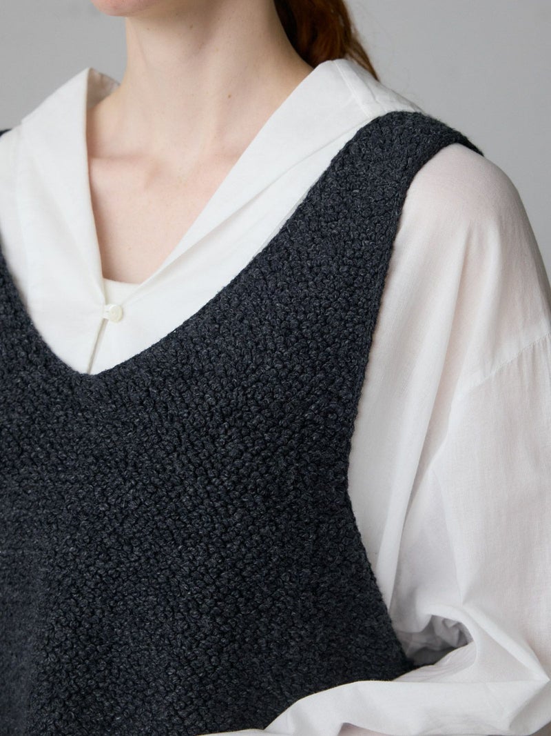 もっちり感と膨らみのあるニットを使用したパイルボアニットベストです。パイル風編みニットのキャミソール風のデザインが女性らしく、今年らしいV型のショートベストを表現しました。すっきりとしたショート丈で若干の前後差を付けています。アームが広くシャツやワンピースにも重ね着がしやすいのもポイント。インナー見えするので重ね着を楽しんでいただける1枚です。同シリーズ 3-729946/パイルボアニットプルオーバーも展開。