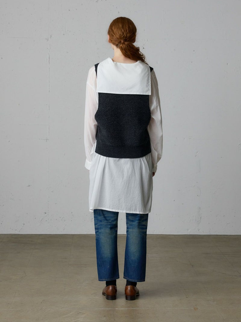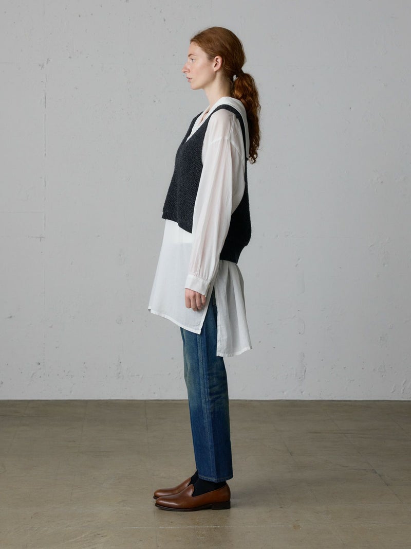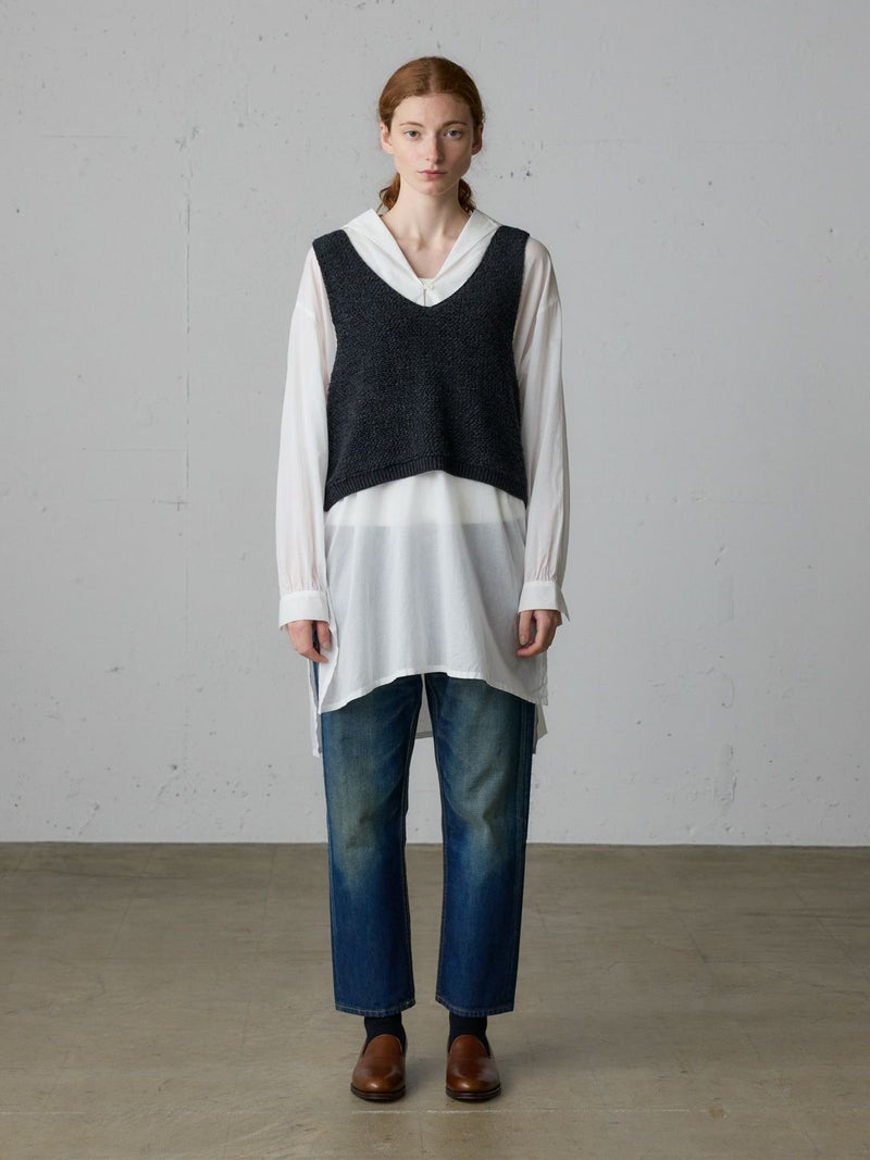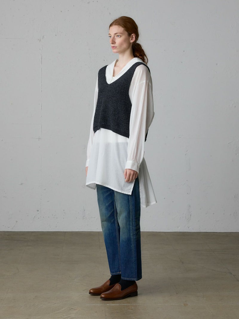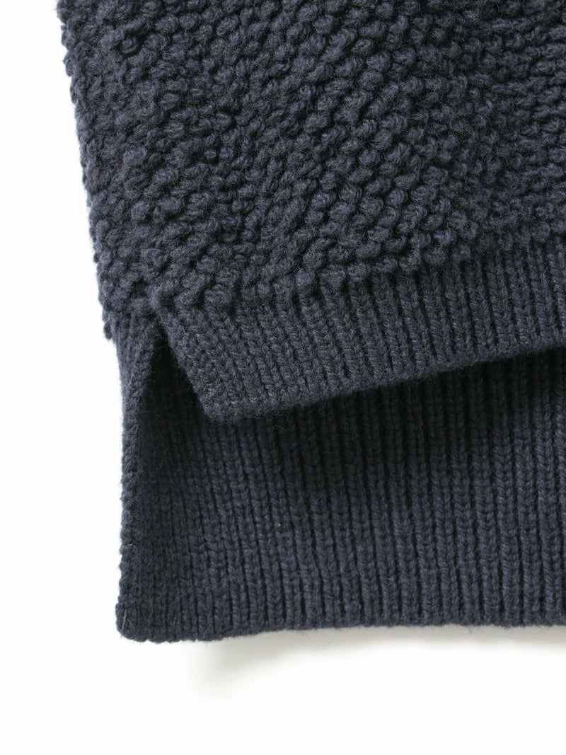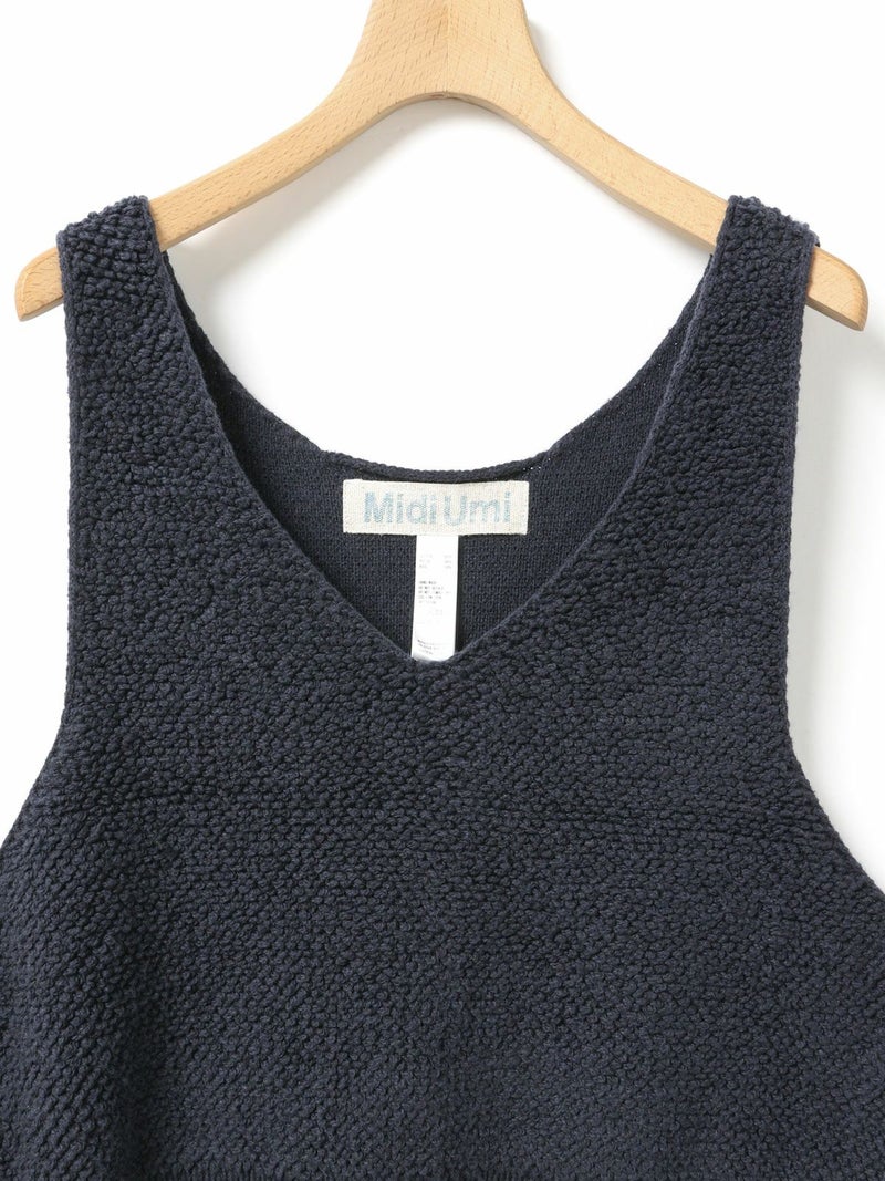 もっちり感と膨らみのあるニットを使用したパイルボアニットベストです。パイル風編みニットのキャミソール風のデザインが女性らしく、今年らしいV型のショートベストを表現しました。すっきりとしたショート丈で若干の前後差を付けています。アームが広くシャツやワンピースにも重ね着がしやすいのもポイント。インナー見えするので重ね着を楽しんでいただける1枚です。同シリーズ 3-729946/パイルボアニットプルオーバーも展開。