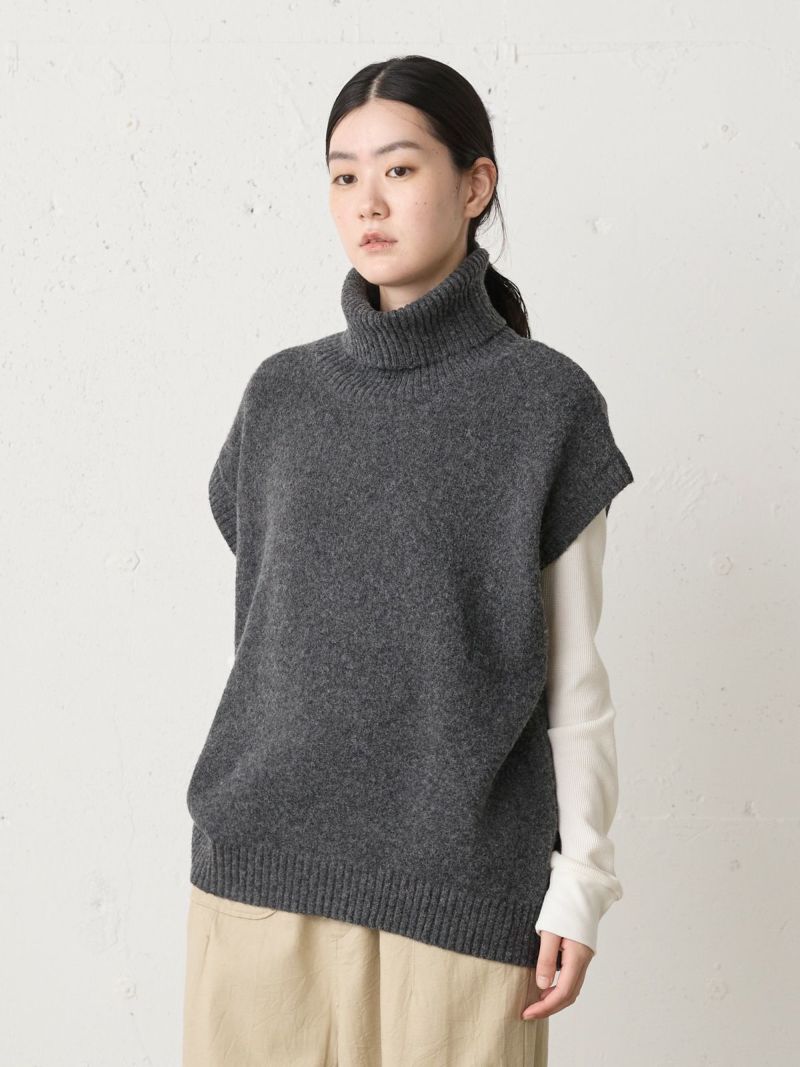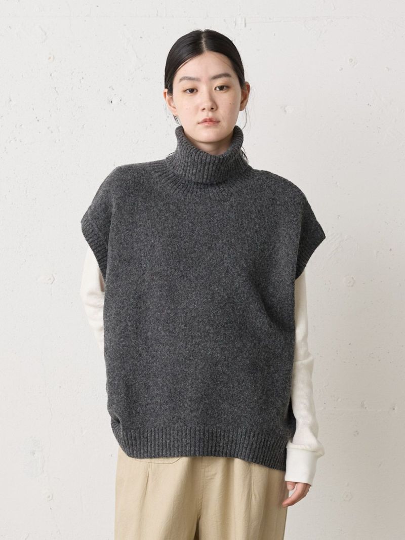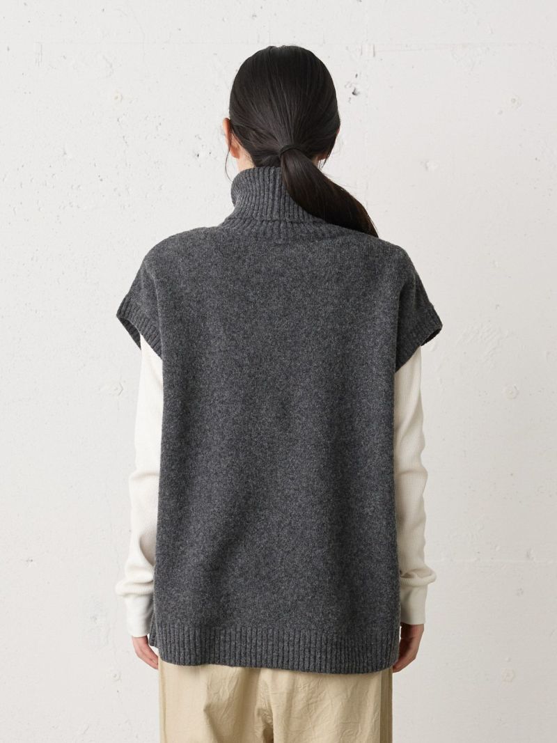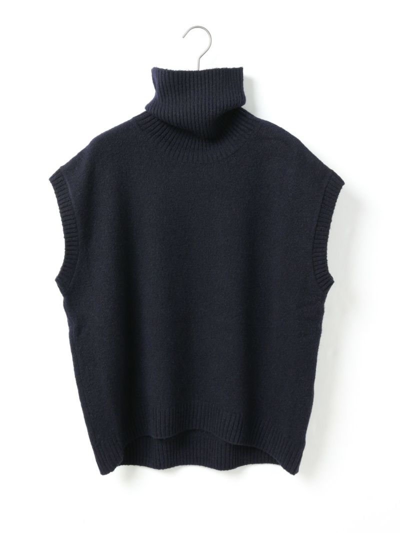 ふくらみのある優しい見た目がポイントのハイネックニットベストです。リサイクルポリエステルを使用したMidiUmi定番の素材で仕上げています。今回ネイビーが新色で新登場。コクーン型よりこぶりのハイネックタイプのベストで、ハイネック具合も緩すぎず、コートとの合わせもしやすいのが特徴。チクチクしにくいニットに仕上がっているので、着心地の良さも魅力的。肩を包んでくれる女性らしいシルエットを表現したレイヤードアにお勧めの1枚です。