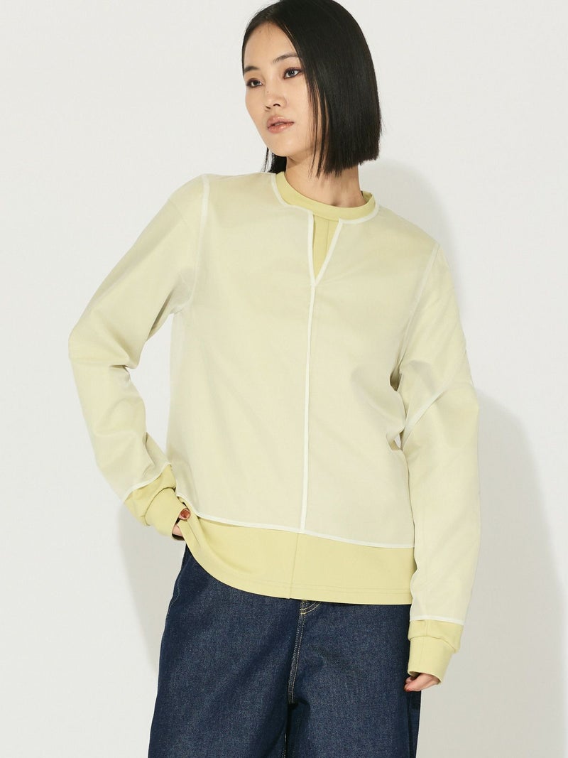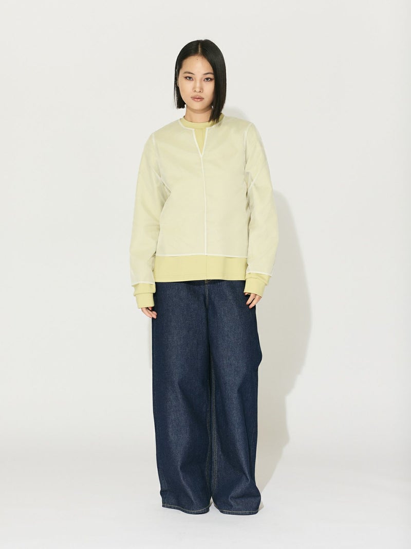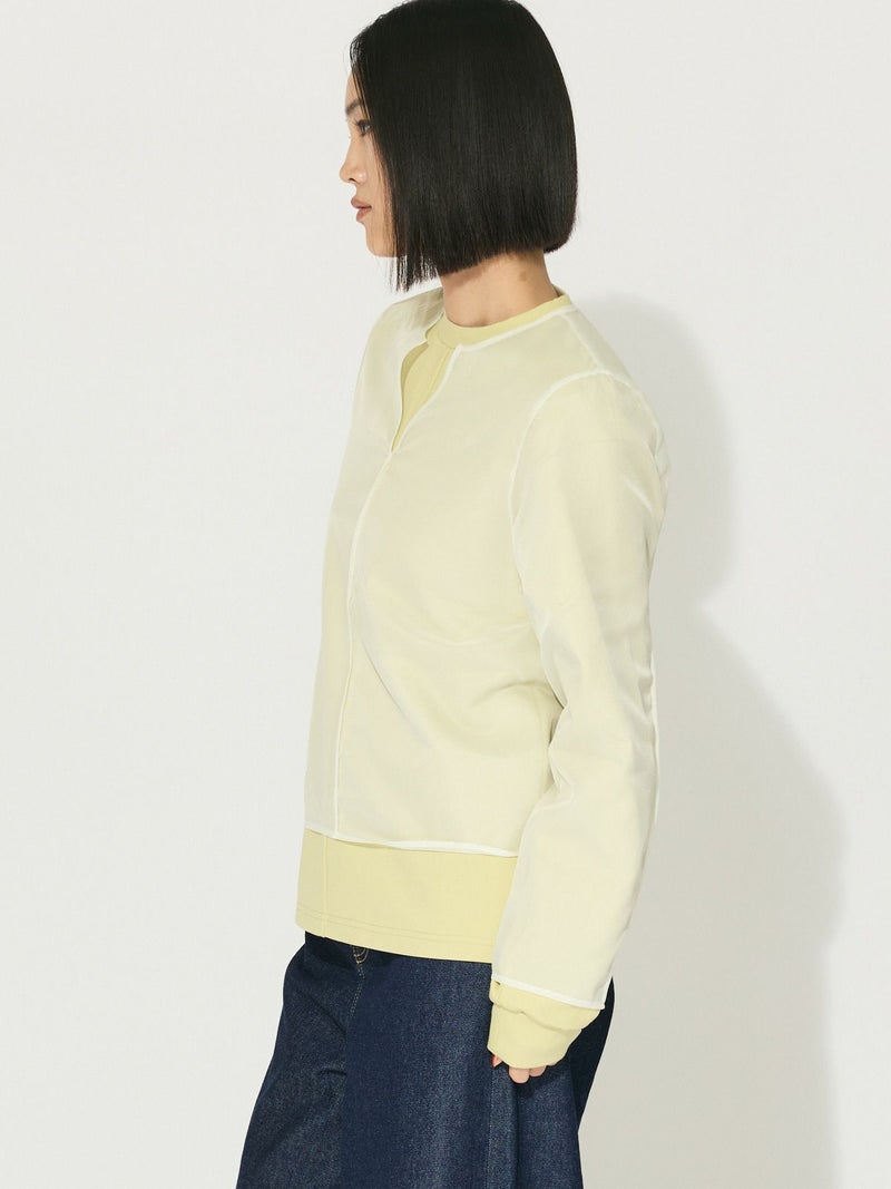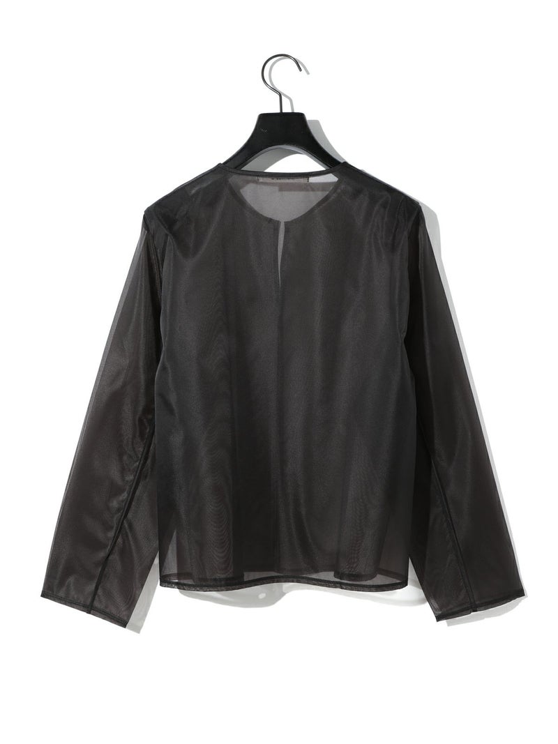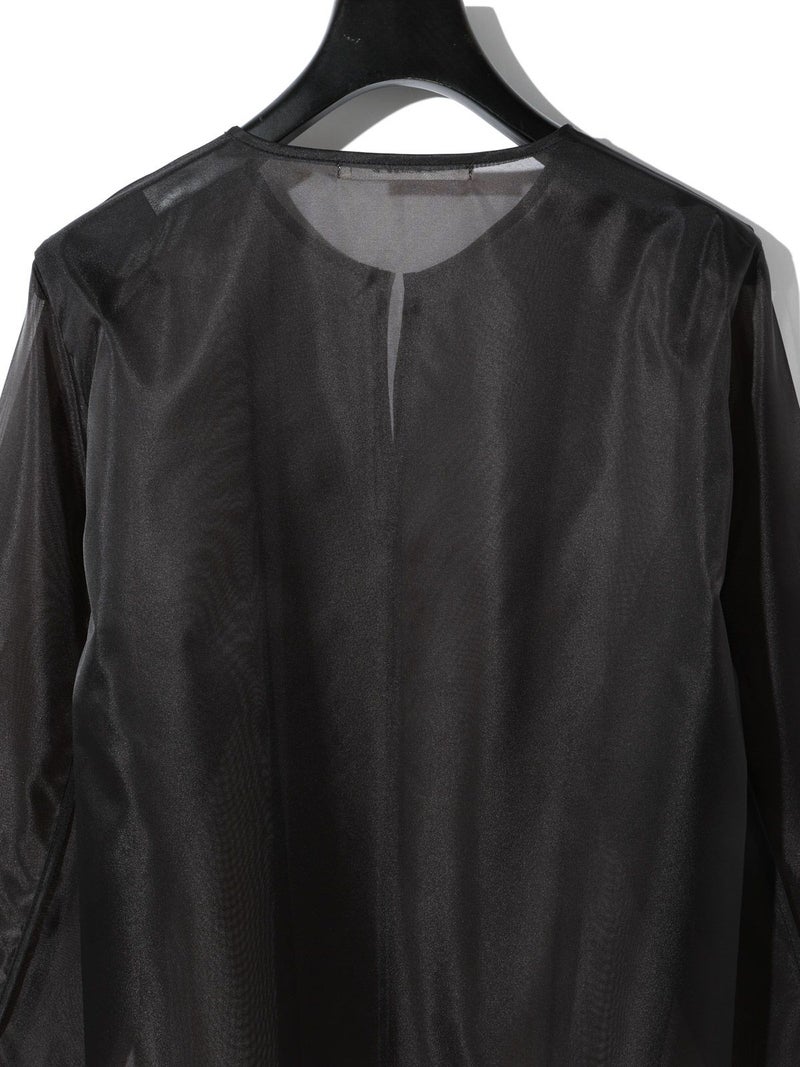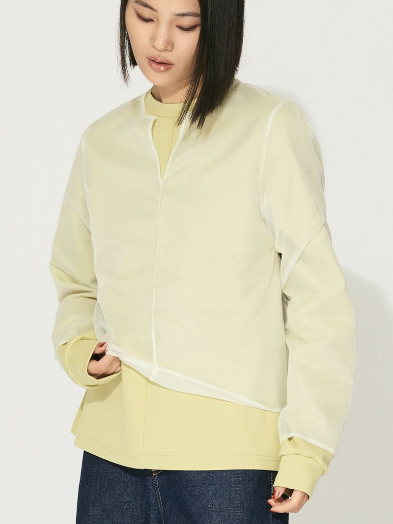 オーガンジーの上品な透け感、少しワイドに設計したシアースキッパープルオーバーです。インナーにシャツを合わせても着やすいサイズ感に仕上げました。パイピングを施した接続部分もインナーがきれいに透けるよう工夫されています。シンプルで着やすいカットソーです。