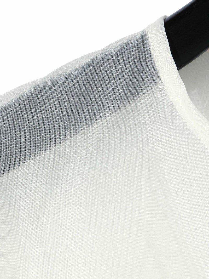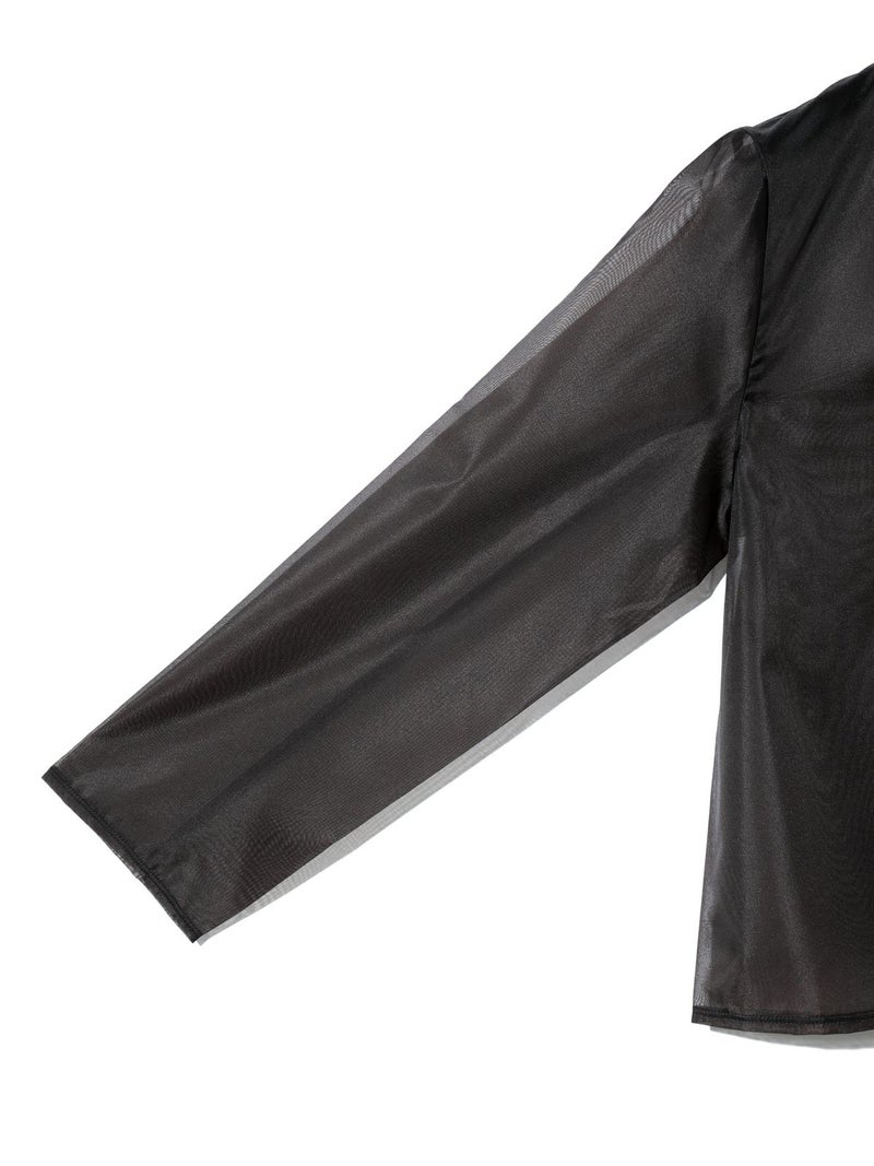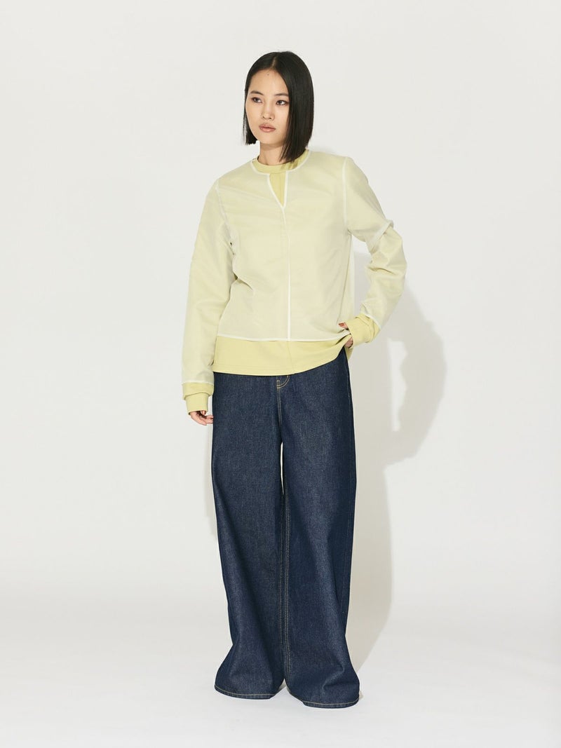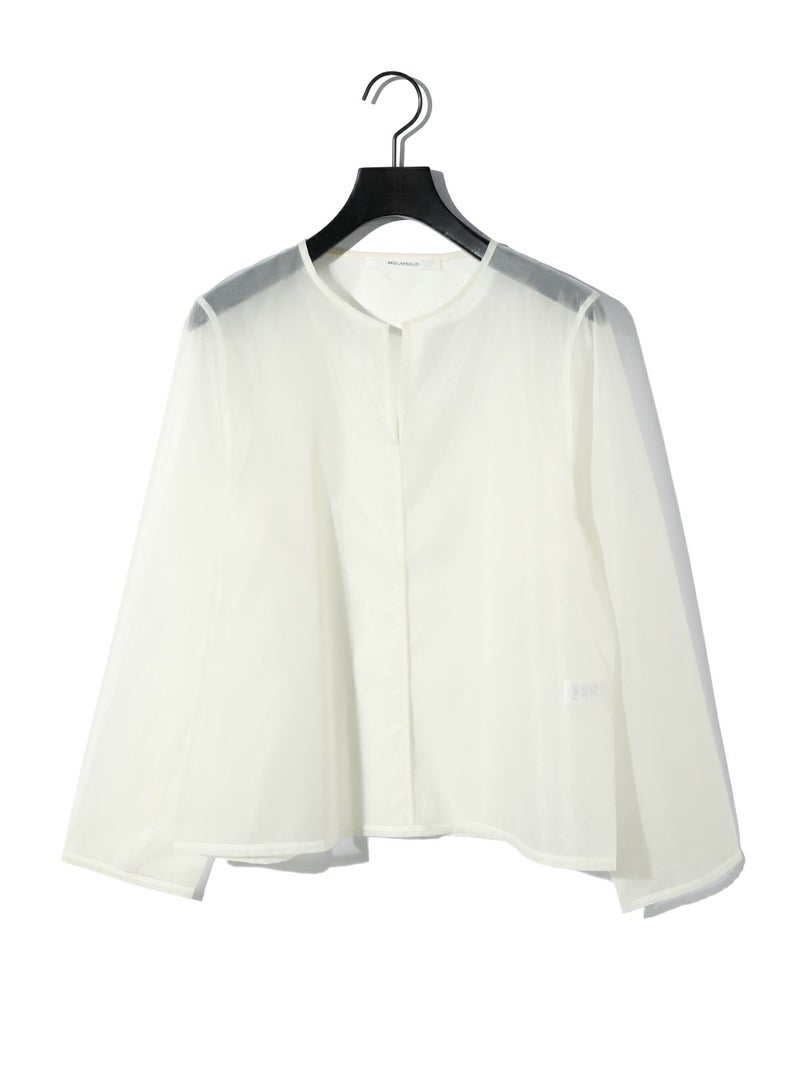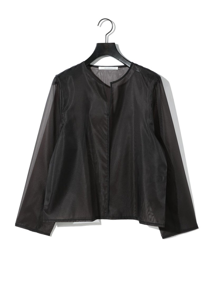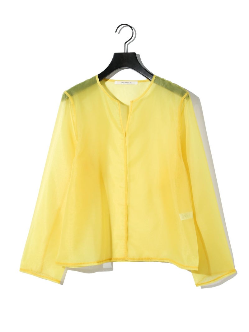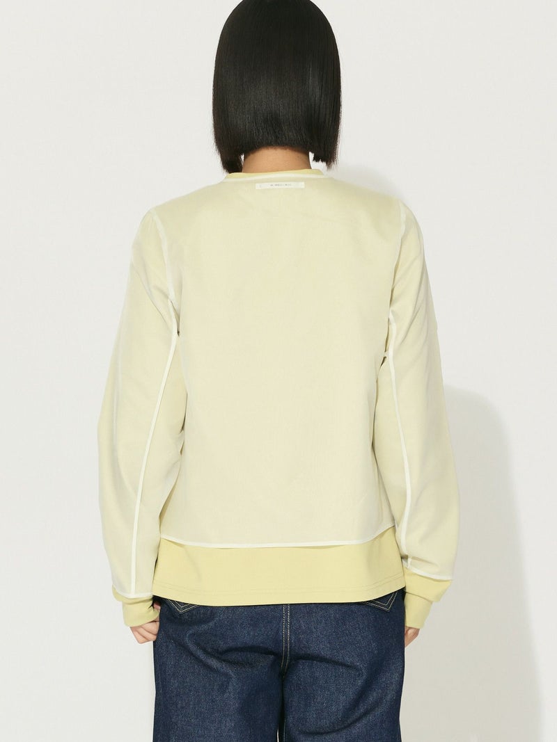 オーガンジーの上品な透け感、少しワイドに設計したシアースキッパープルオーバーです。インナーにシャツを合わせても着やすいサイズ感に仕上げました。パイピングを施した接続部分もインナーがきれいに透けるよう工夫されています。シンプルで着やすいカットソーです。