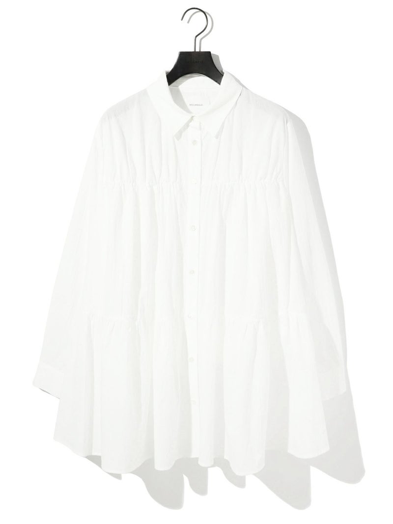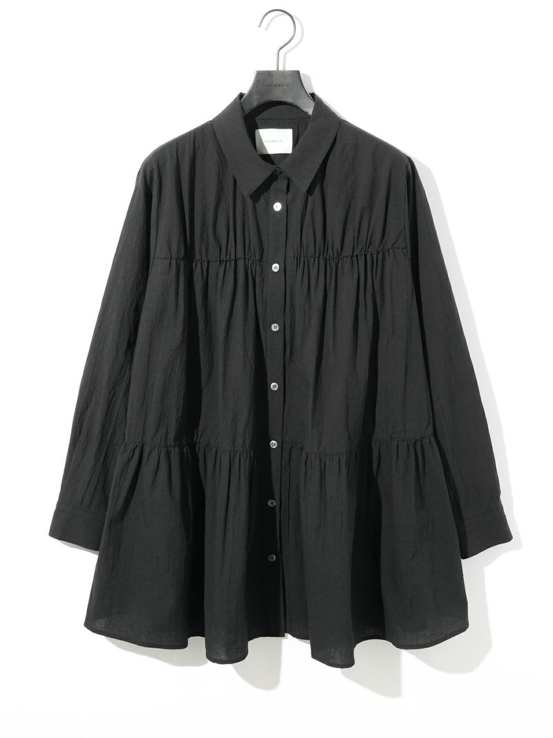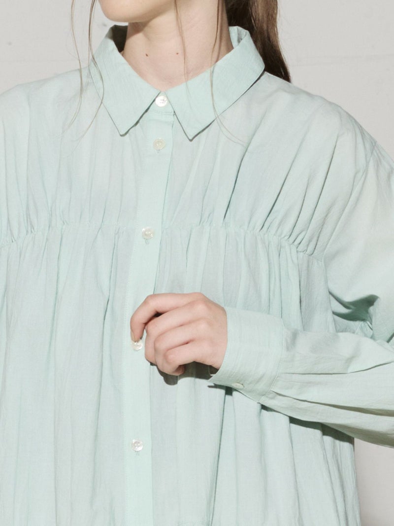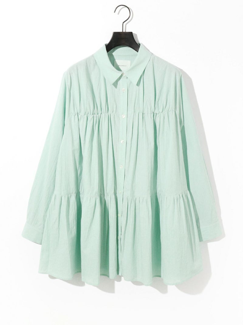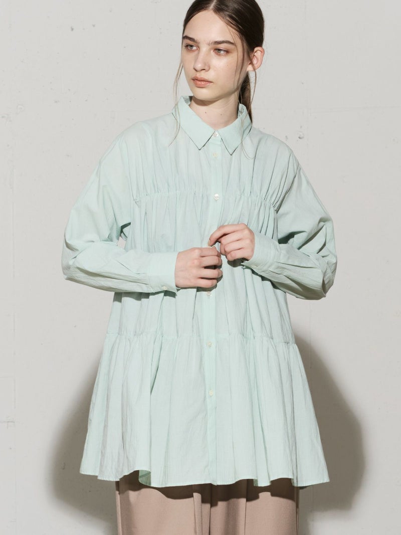 フロントギャザーを施したティアードボリュームシャツです。甘くなりすぎないようにレギュラーカラーのベーシックなデザインに仕上げました。ヒップの隠れる少し長めの丈感で裾広がりの上品なシルエットを表現。ニットとの合わせも良く長い時期コーディネートしていただけます。しわ感のあるコットン生地で雰囲気があるのもポイント。淡いグリーンは春を先取りした魅力のカラーです。定番の白と黒を含んだ3色展開となっています。