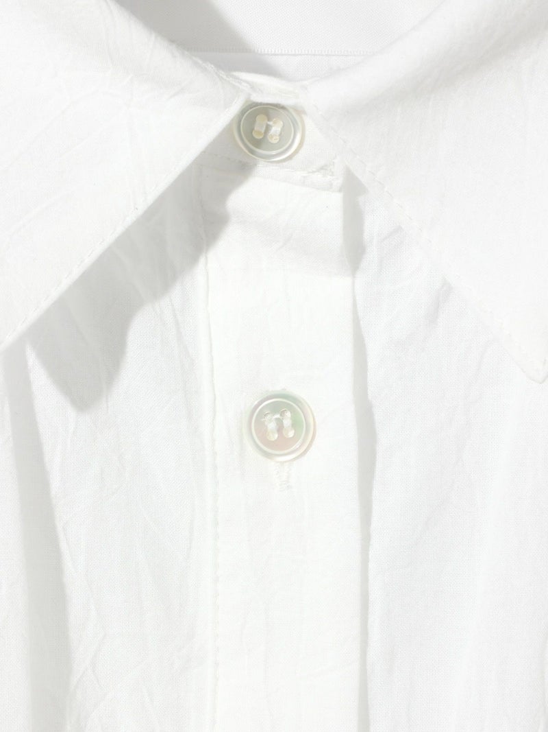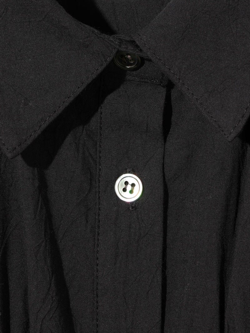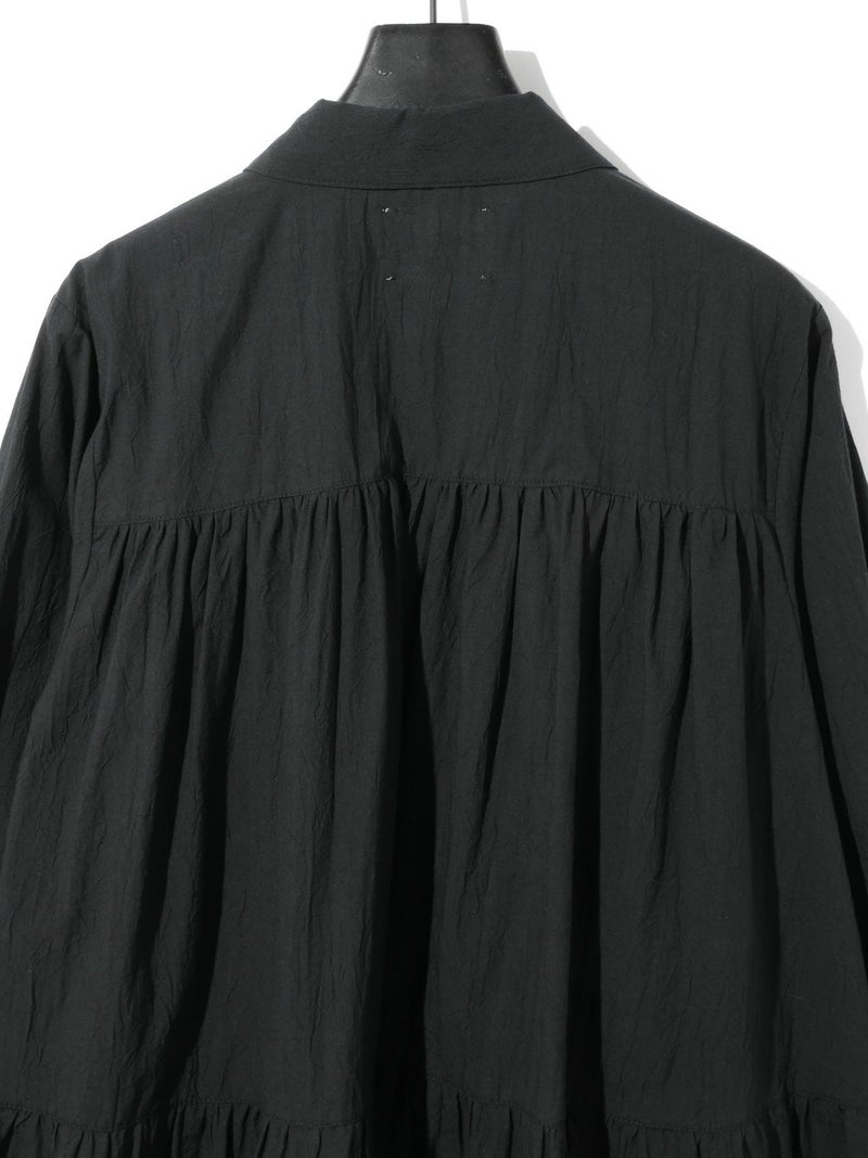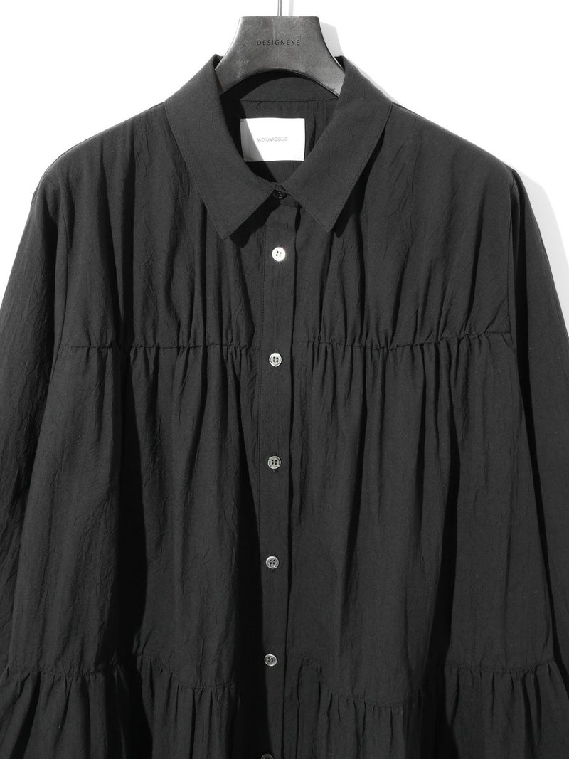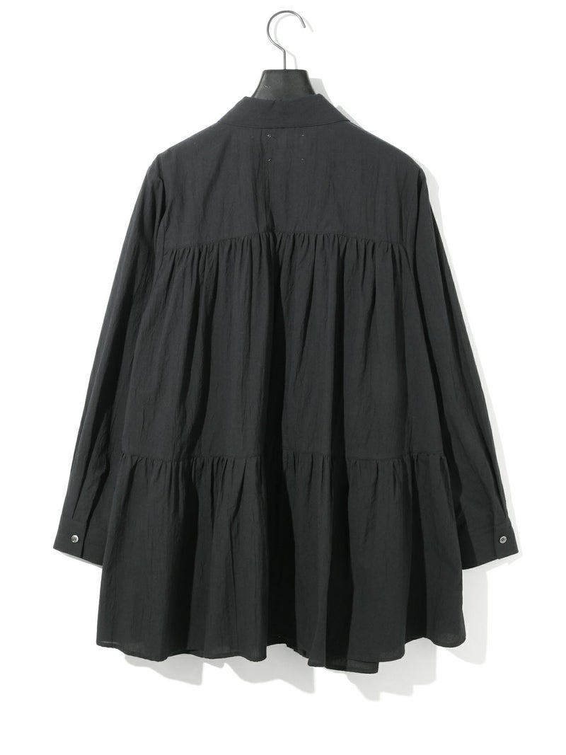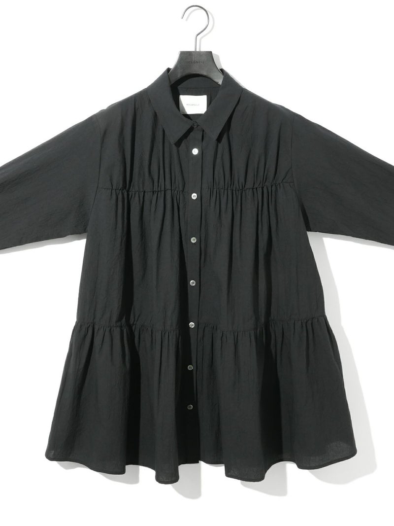 フロントギャザーを施したティアードボリュームシャツです。甘くなりすぎないようにレギュラーカラーのベーシックなデザインに仕上げました。ヒップの隠れる少し長めの丈感で裾広がりの上品なシルエットを表現。ニットとの合わせも良く長い時期コーディネートしていただけます。しわ感のあるコットン生地で雰囲気があるのもポイント。淡いグリーンは春を先取りした魅力のカラーです。定番の白と黒を含んだ3色展開となっています。