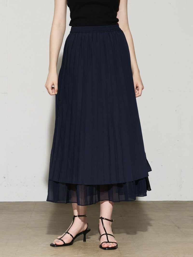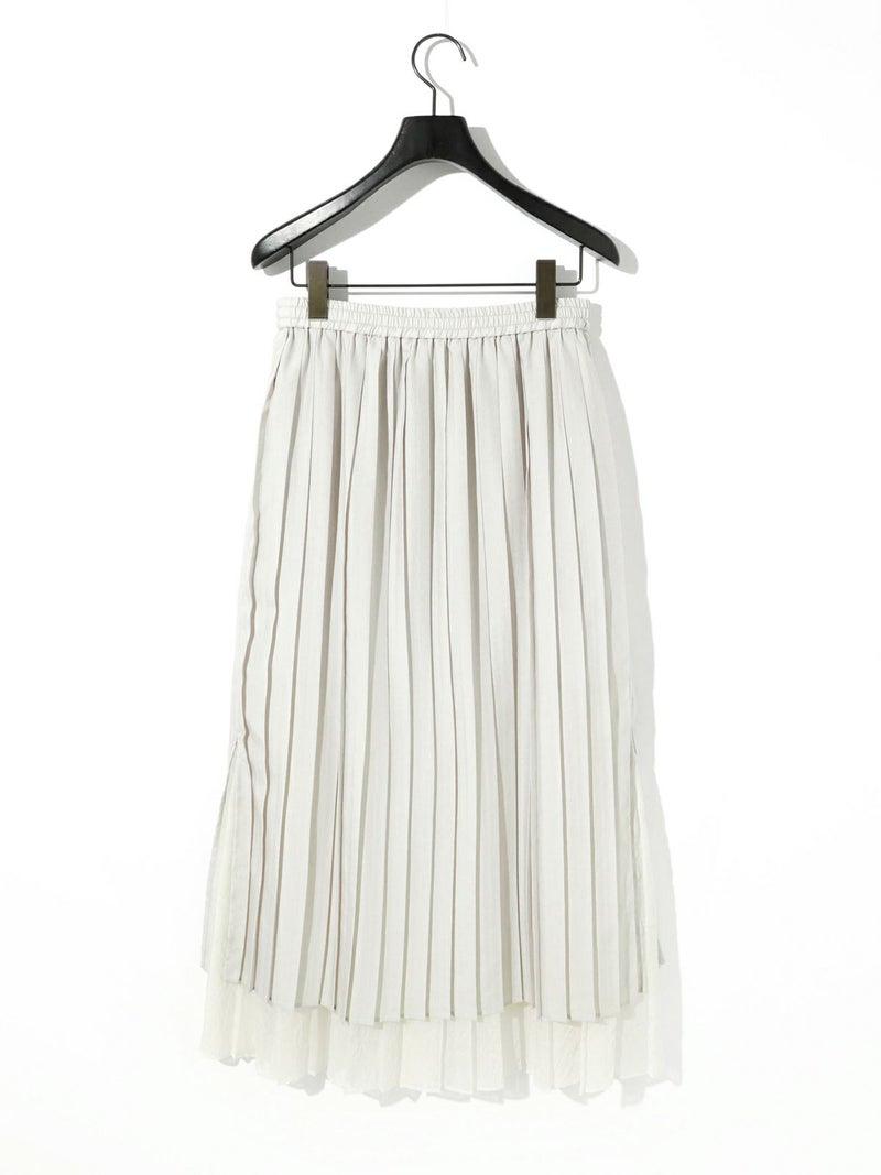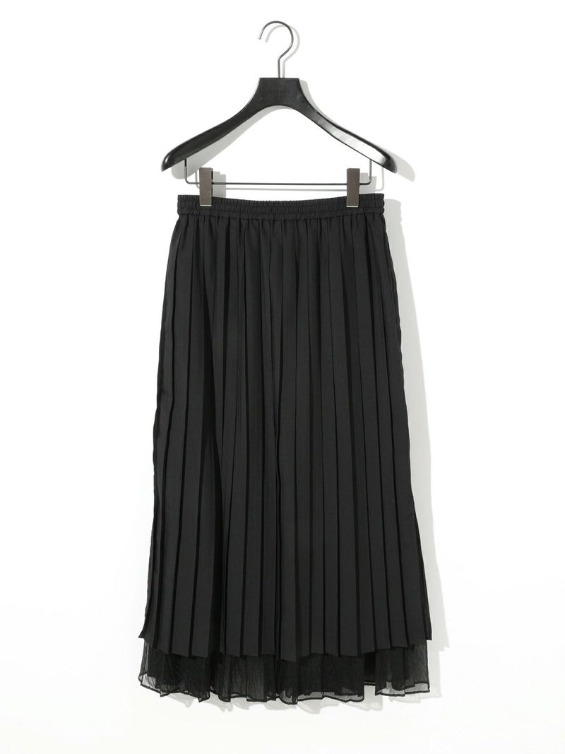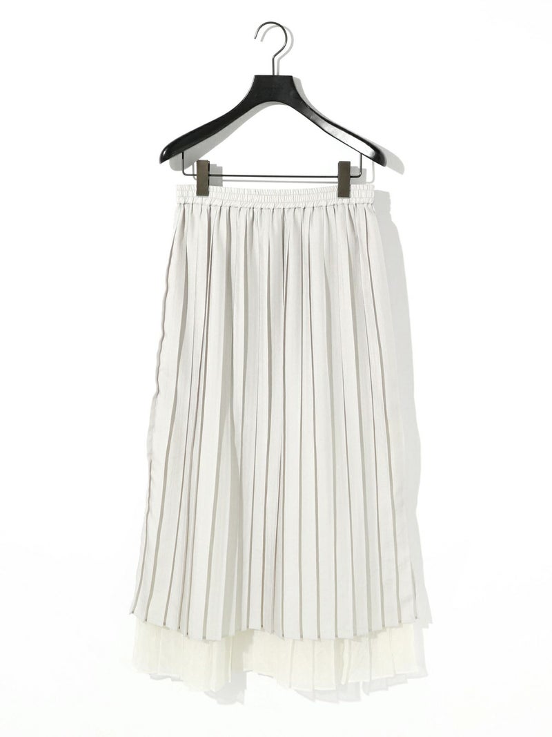 ストレートプリーツスカート×フレアオーガンジープリーツのデザインが魅力のチュールレイヤードプリーツスカートです。二重に重なった裾のデザインは透け感のある上品な大人の雰囲気を印象付けた清楚な1枚。歩いた時の揺れ感がきれいで女性らしい着こなしを演出します。ウエストはリラックス感のあるゴム使用。裏地付なので透け感を気にすることなく安心してコーディネートしていただけます。着回しのしやすい3色の落ち着きのある3色で展開。
