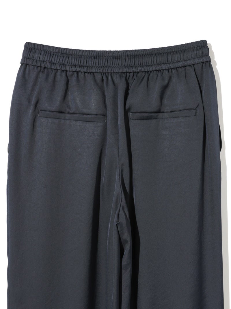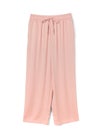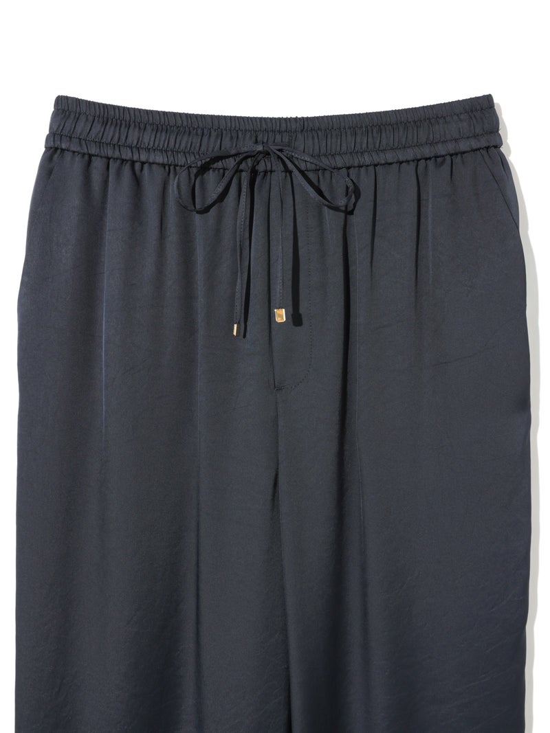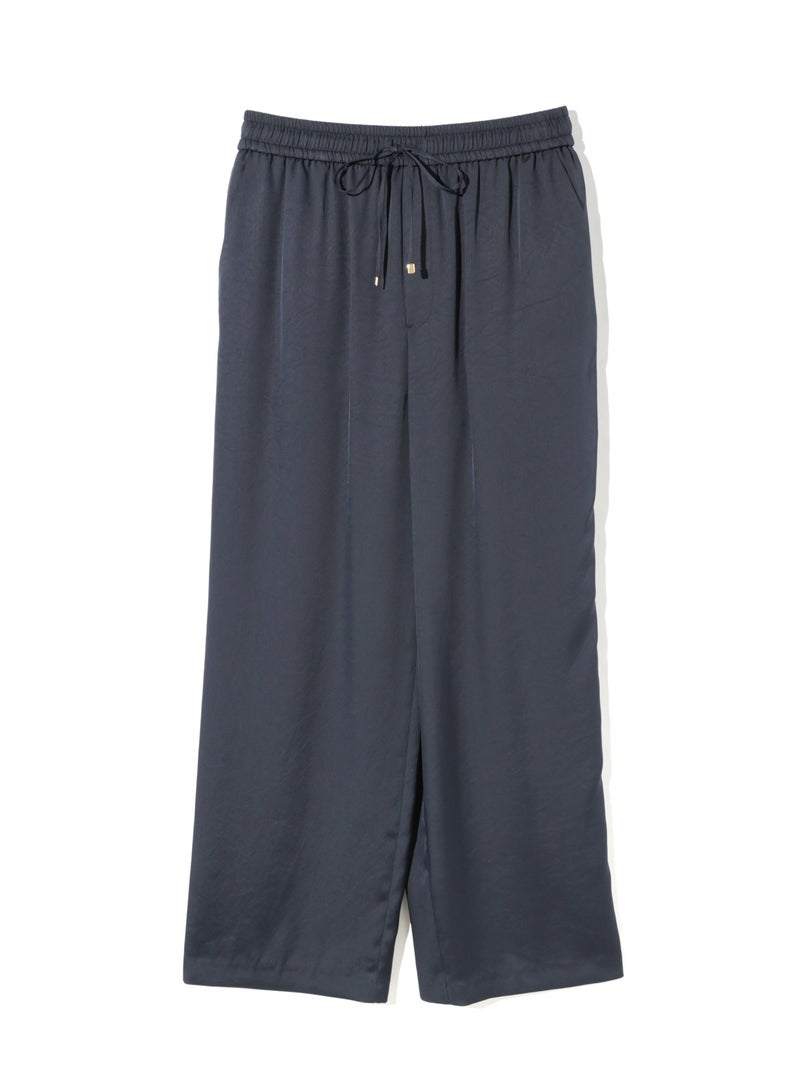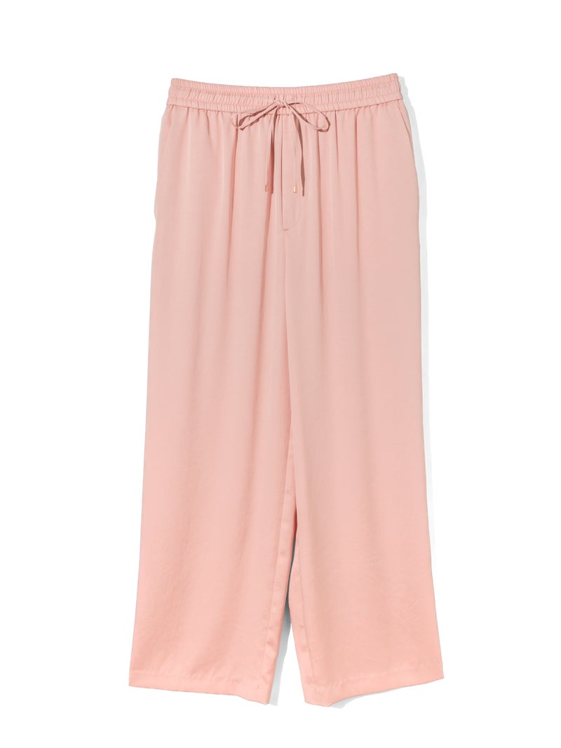 しなやかで上品な生地感が特徴のイージーパンツです。サラッとした艶のある生地感は軽くて着心地がよく、暑い時期でも快適に着用していただけます。着用感は広がりはなく足元まで程よいワイドシルエットを表現しており足長効果のある1枚。透け感はなく安心して着用できます。ウエストゴムに加え調整紐が付いたデザインなのでキープしやすく、リラックス感のあるところもポイント。今季人気のピンクを差し色にしており、落ち着きのある女性らしいパンツスタイルを印象付けたボトムアイテムです。