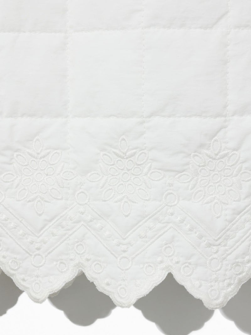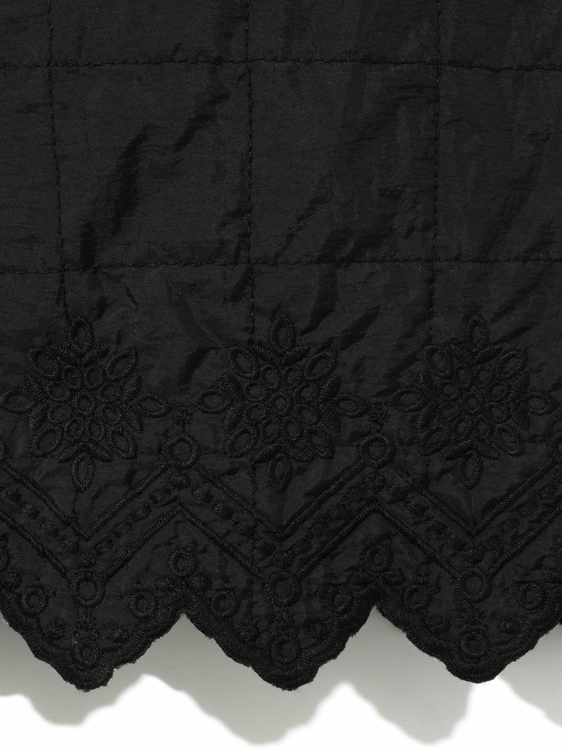 薄手の中綿キルト×オリジナル刺繍レースを使用した刺繍キルティングベストです。スポーティ素材に甘さをプラスした1枚。アウターのライナーのような、ミニワンピースのようにも着こなせるアイテムです。春先から活躍していただけるベストアイテムで女性らしいベストです。オフホワイトとブラックの2色展開です。同シリーズ1-152134/レイヤードワンピースと1-162160/スカートも展開。