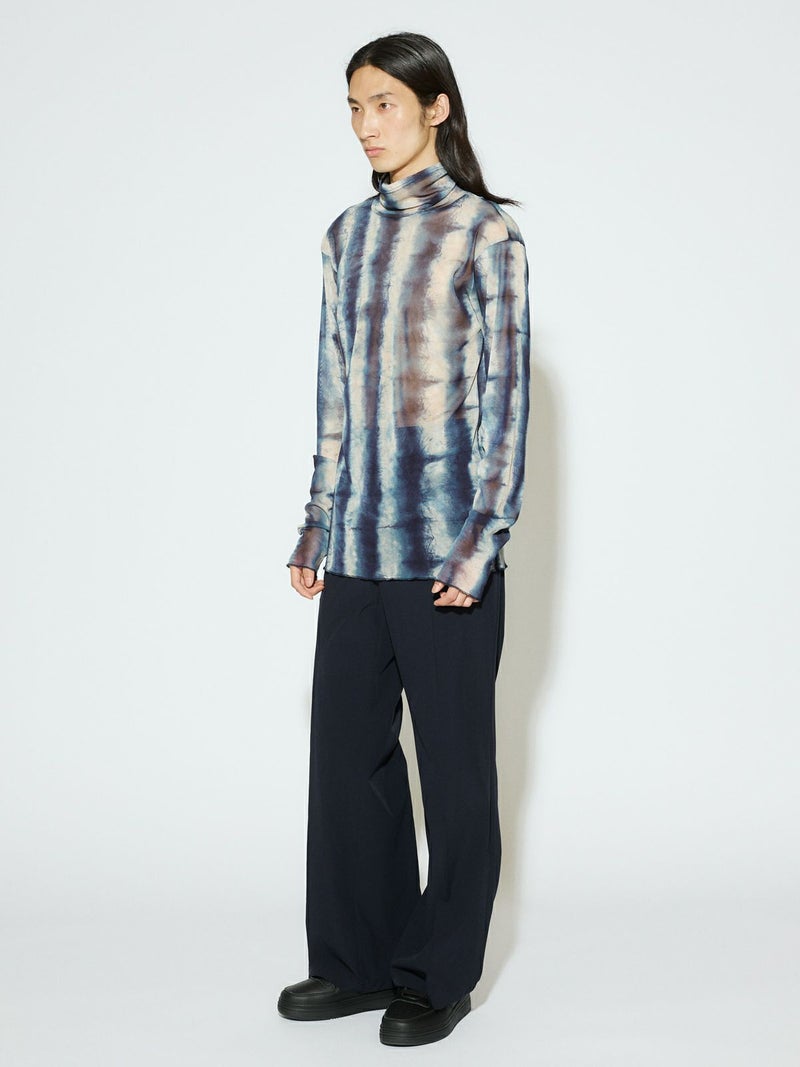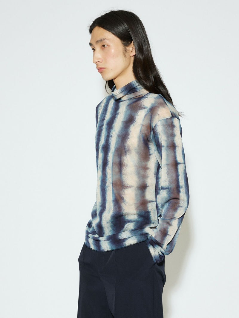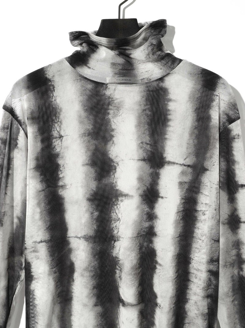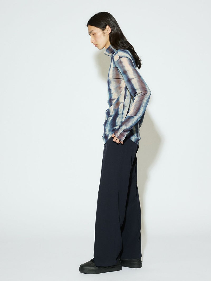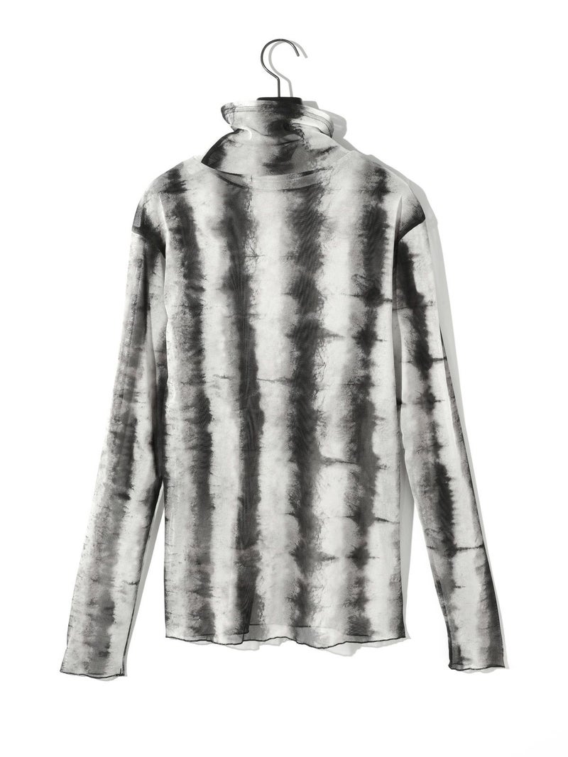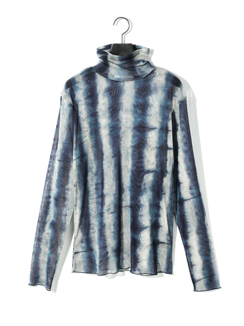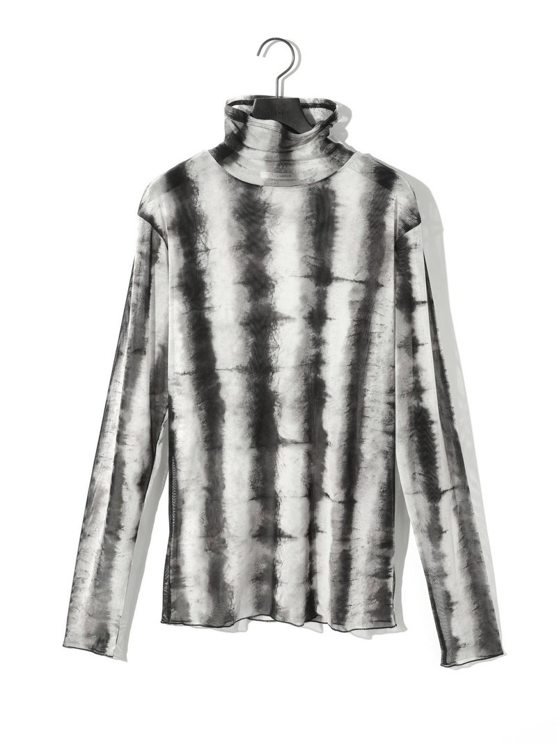 タイダイ柄をストライプにデザインしたハイネックチュールプルオーバーです。高めのハイネックと透け感のあるチュールシアーが特徴のカットソーです。袖を長めにデザインしました。重ね着にも使っていただけます。ブラックとブルーの2色展開でどちらもシックな色合いが魅力的です。シアーの透け感が大人の着こなしを演出した1枚です。