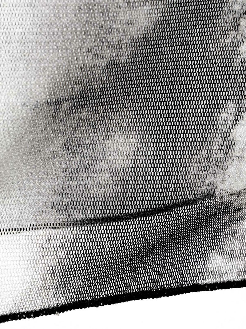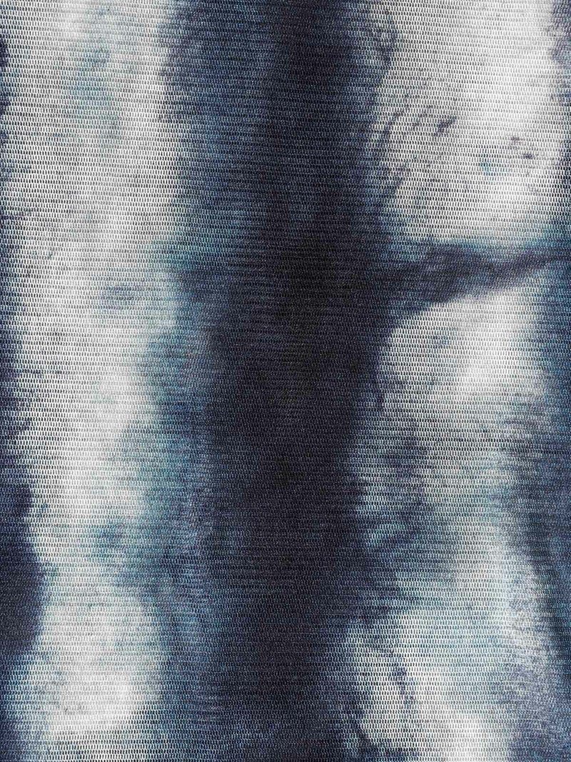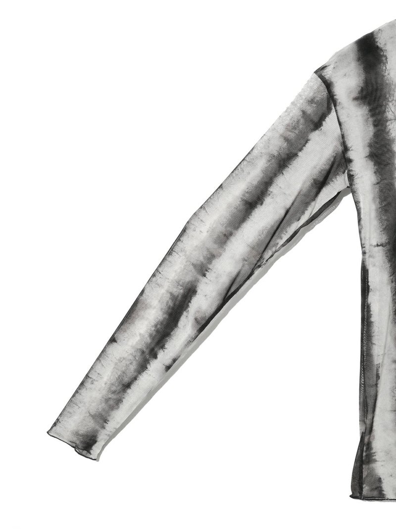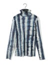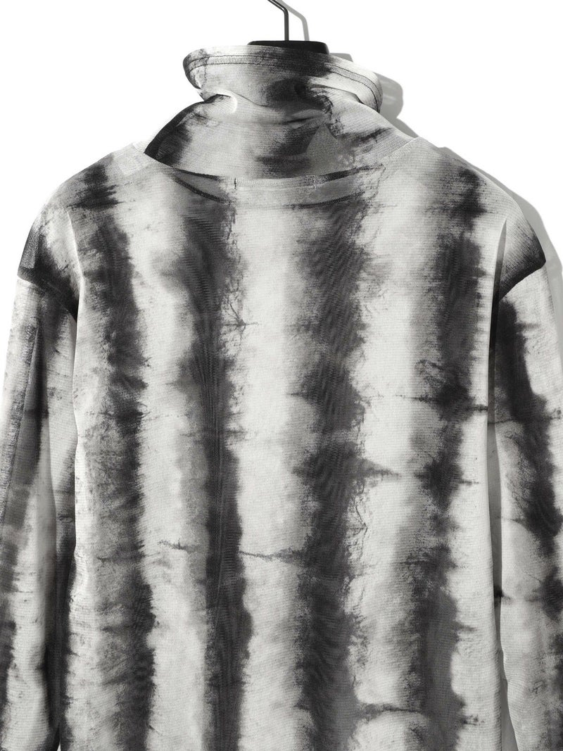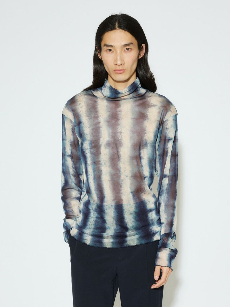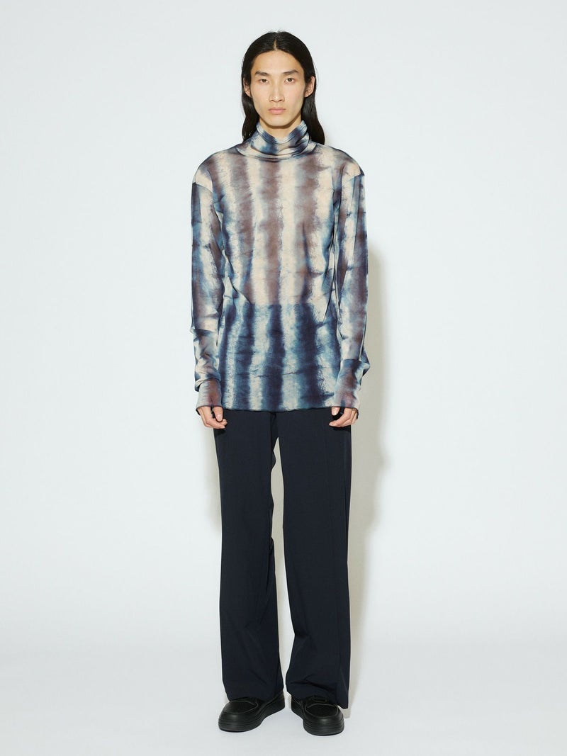 タイダイ柄をストライプにデザインしたハイネックチュールプルオーバーです。高めのハイネックと透け感のあるチュールシアーが特徴のカットソーです。袖を長めにデザインしました。重ね着にも使っていただけます。ブラックとブルーの2色展開でどちらもシックな色合いが魅力的です。シアーの透け感が大人の着こなしを演出した1枚です。