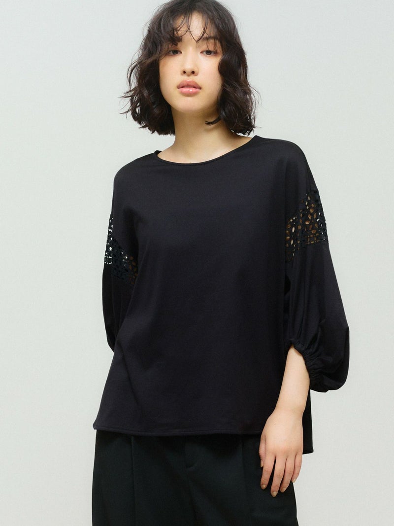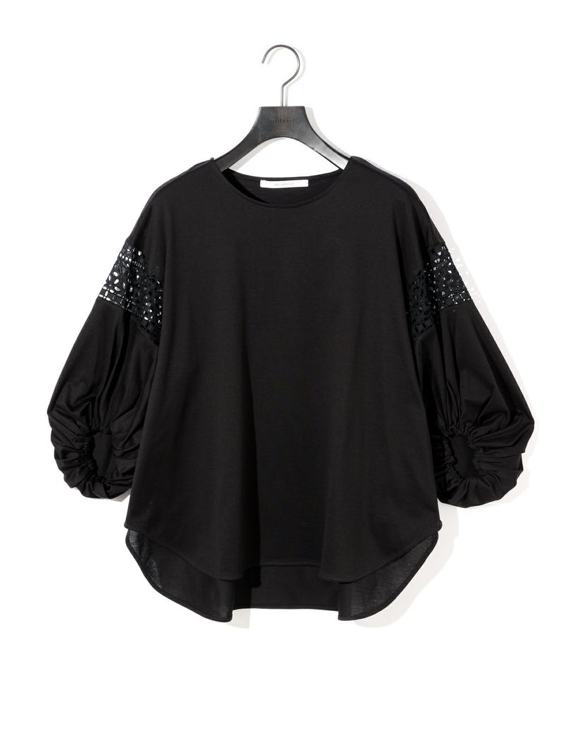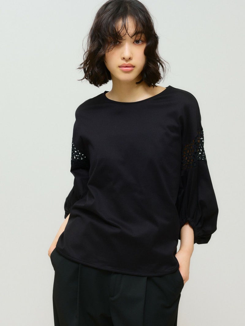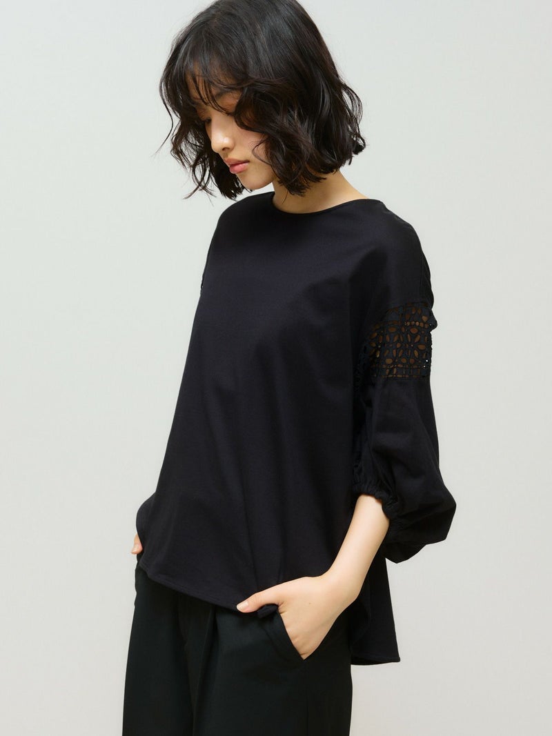 パフスリーブと袖レースをデザインしたレーススイッチングパフスリーブプルオーバーが再入荷しました。カットソー生地に落とし込んだ上品で女性らしい雰囲気を印象付けた1枚。少し長めの着丈は丸みのある優しいシルエット表現。若干の前後差をつけておりしなやかに動きのあるデザインに仕上げました。ふんわり感のある袖丈の途中にレースを施したことで軽やかな印象と清涼感を演出しました。袖口はしっかりとしたゴムを使用しているので夏場も半袖を維持でき、季節の変わり目にも袖丈を自由にできるのもポイント。着回しのきくオフホワイトとブラックの2色展開です。