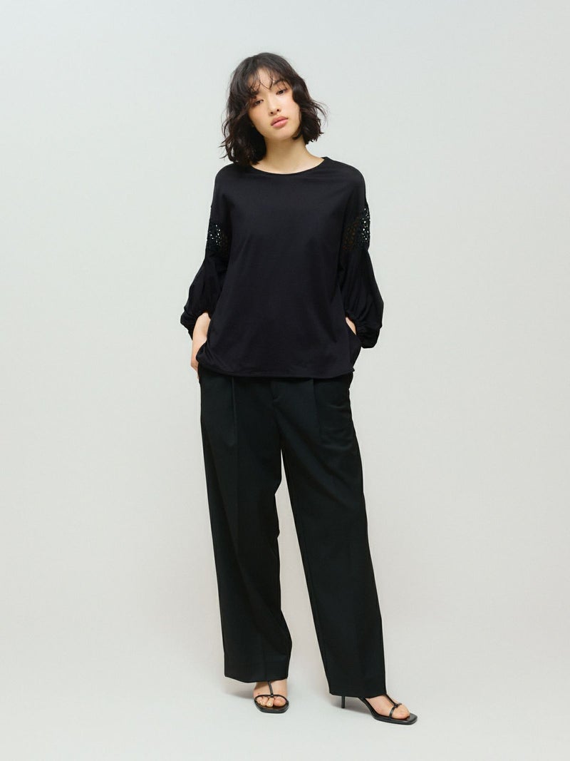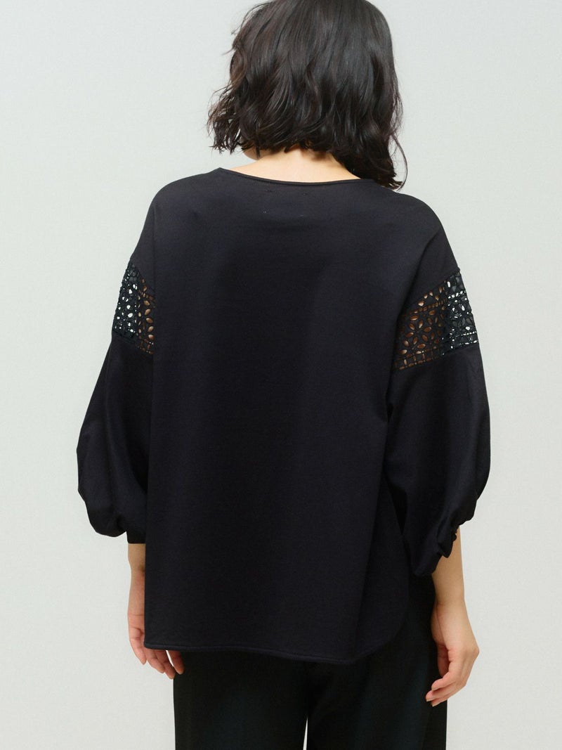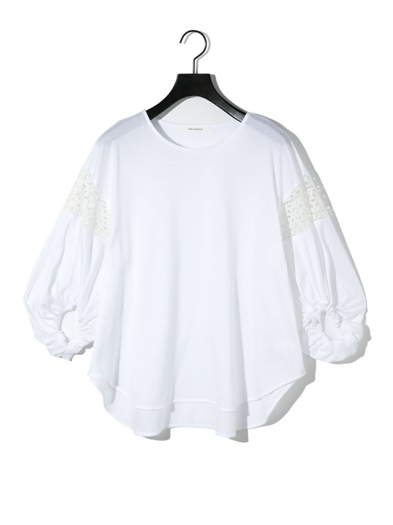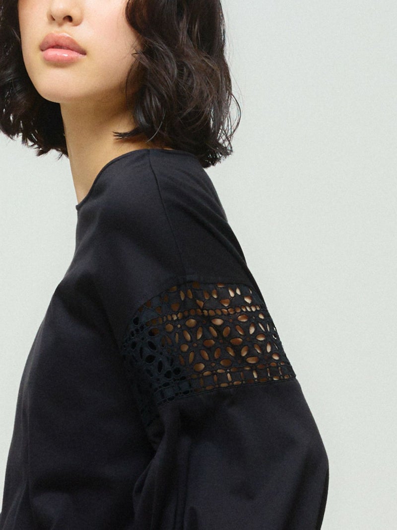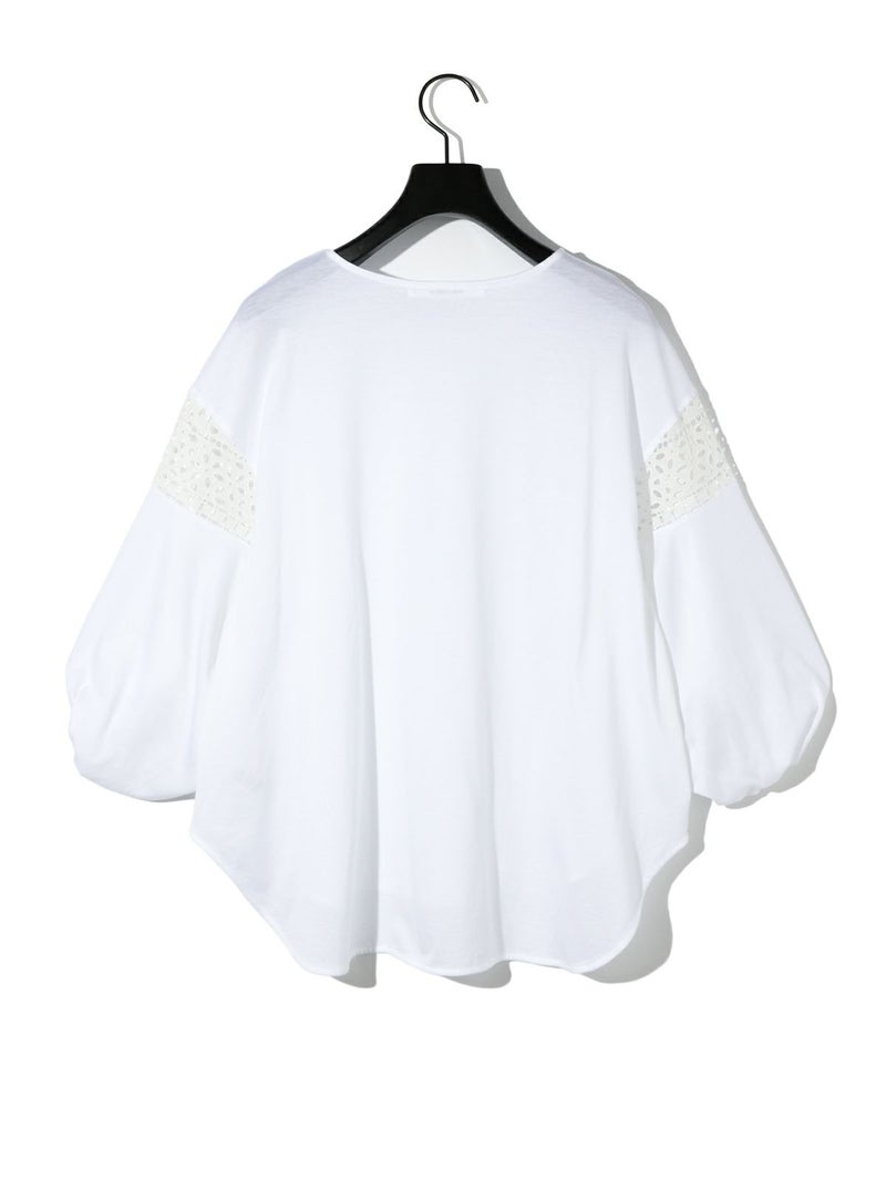 パフスリーブと袖レースをデザインしたレーススイッチングパフスリーブプルオーバーが再入荷しました。カットソー生地に落とし込んだ上品で女性らしい雰囲気を印象付けた1枚。少し長めの着丈は丸みのある優しいシルエット表現。若干の前後差をつけておりしなやかに動きのあるデザインに仕上げました。ふんわり感のある袖丈の途中にレースを施したことで軽やかな印象と清涼感を演出しました。袖口はしっかりとしたゴムを使用しているので夏場も半袖を維持でき、季節の変わり目にも袖丈を自由にできるのもポイント。着回しのきくオフホワイトとブラックの2色展開です。