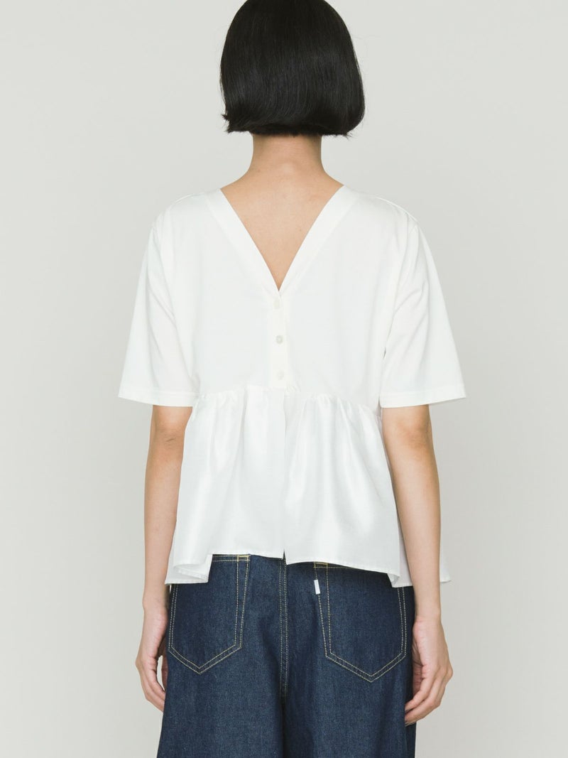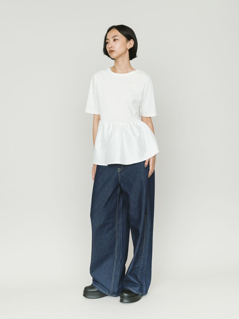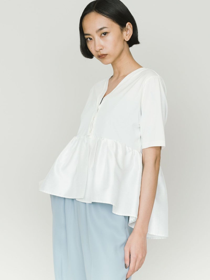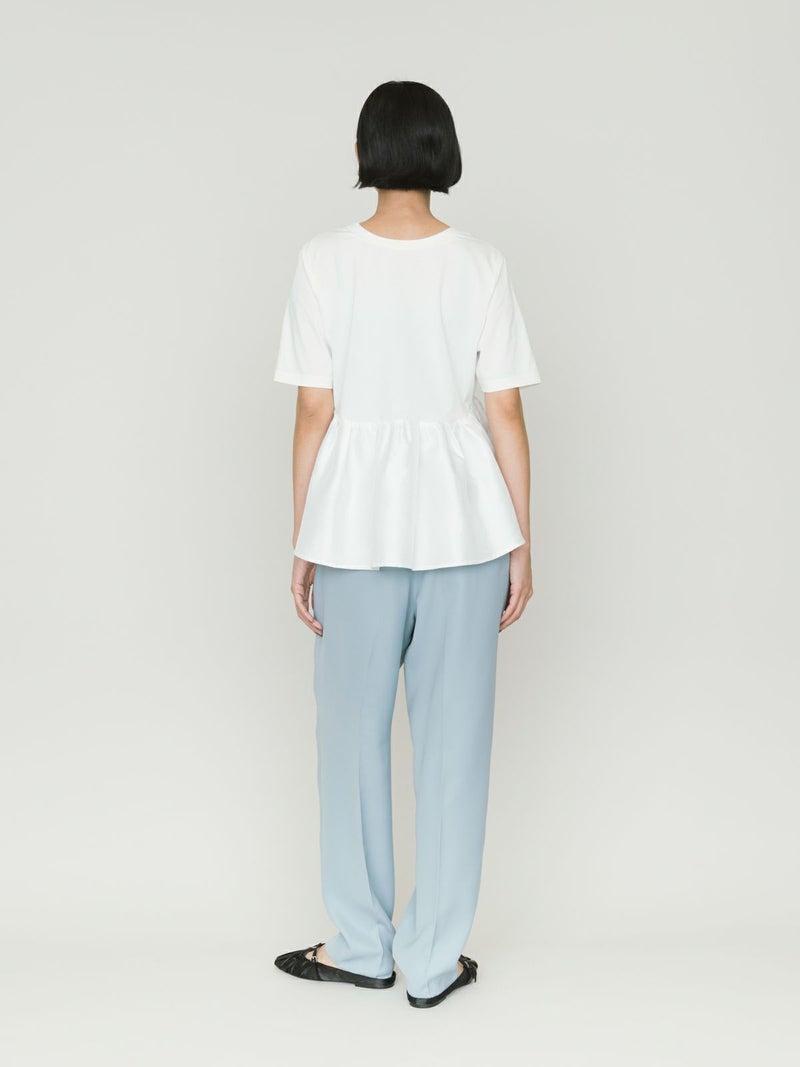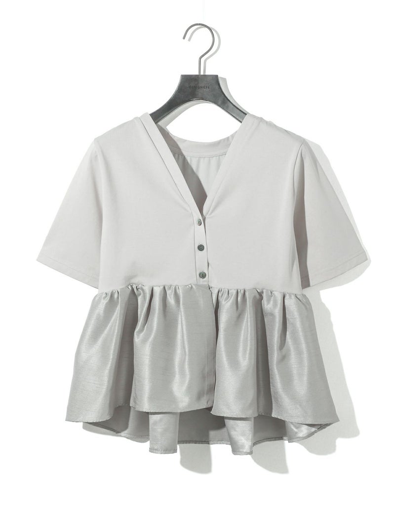 2WAYの着こなしが可能なウーブン切り替え2WAYペプラムが再入荷しました。トップはキレイ目カットソーと胸下からサテン生地に切り替えを施したモード感のあるギャザーをフレア風に工夫した女性らしいデザインを演出。前開きでカーディガン使用にできる着こなしとプルオーバーシルエットを表現しており、オシャレの幅が広いアイテムになっています。着回しのきく3色展開です。