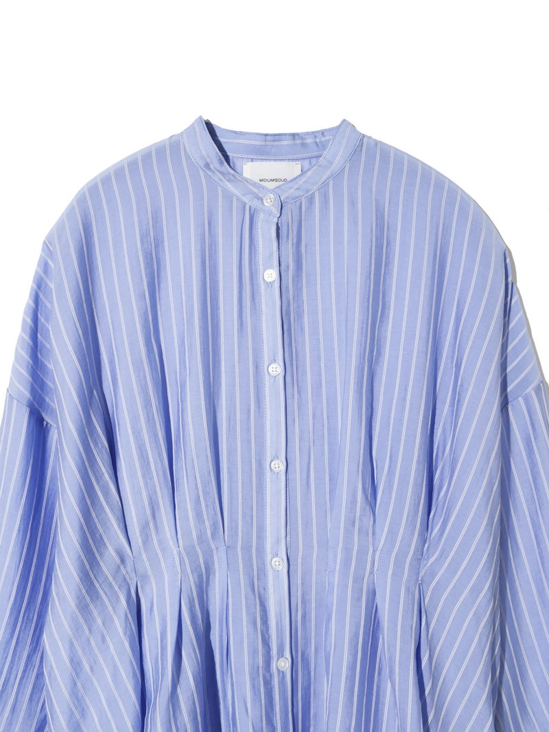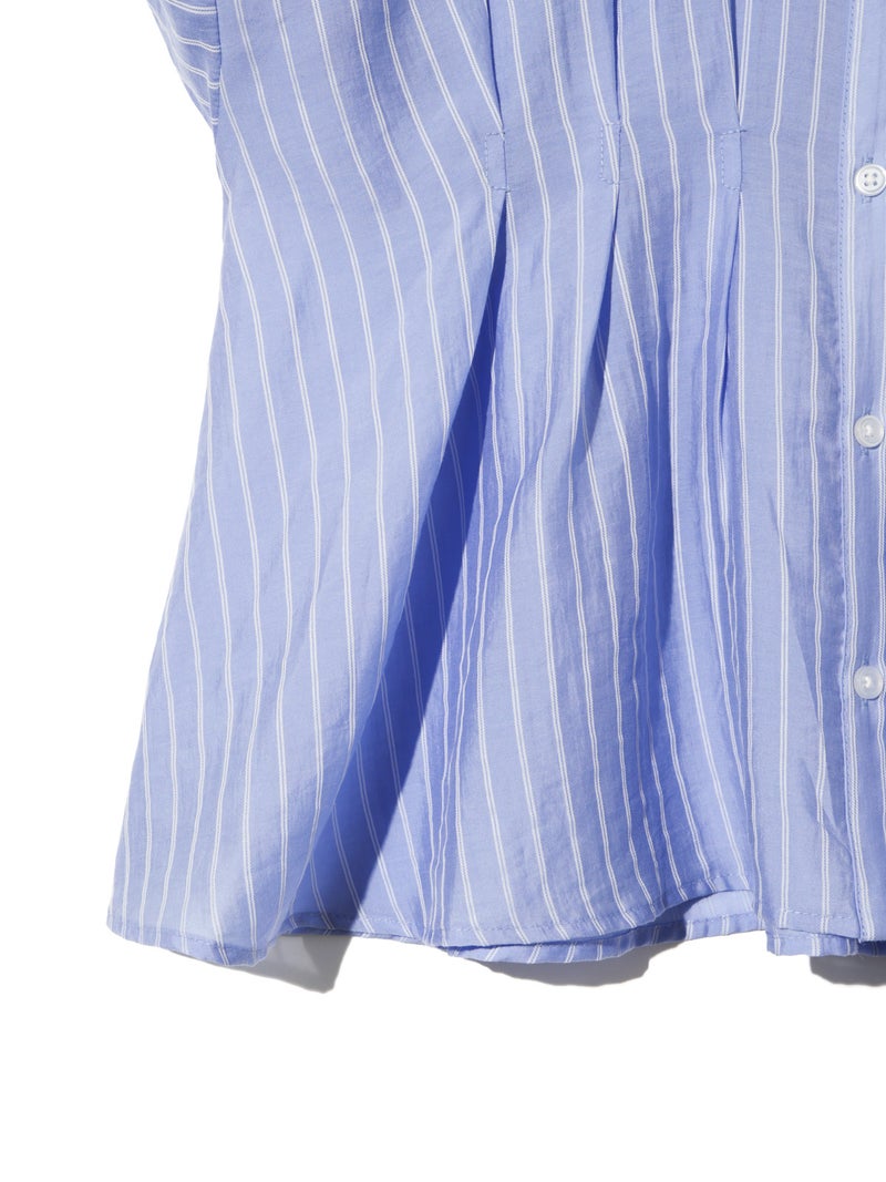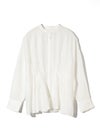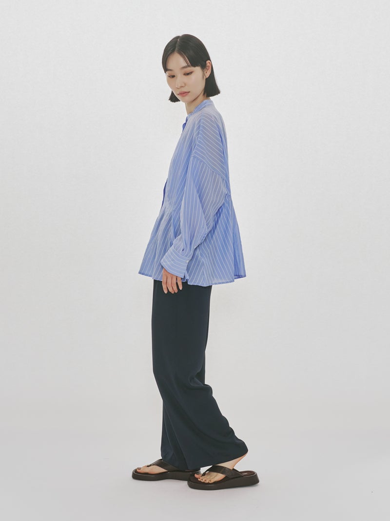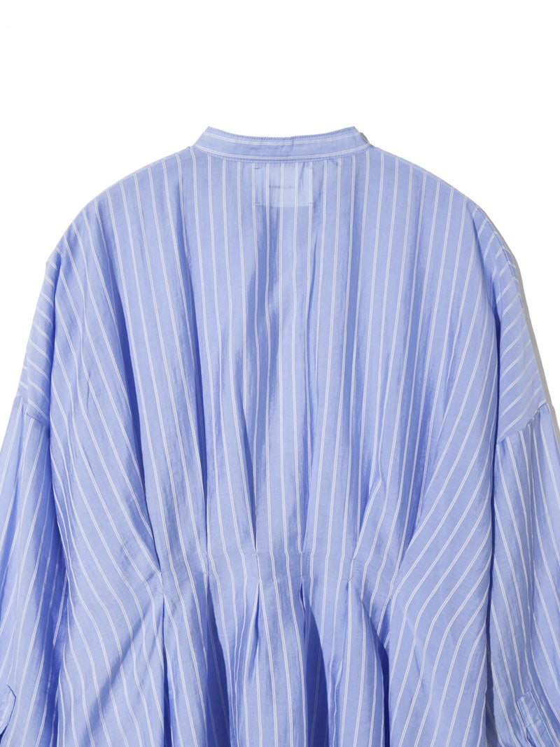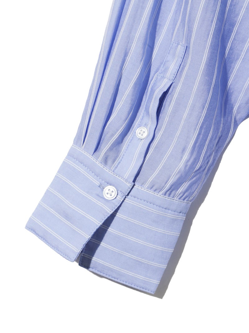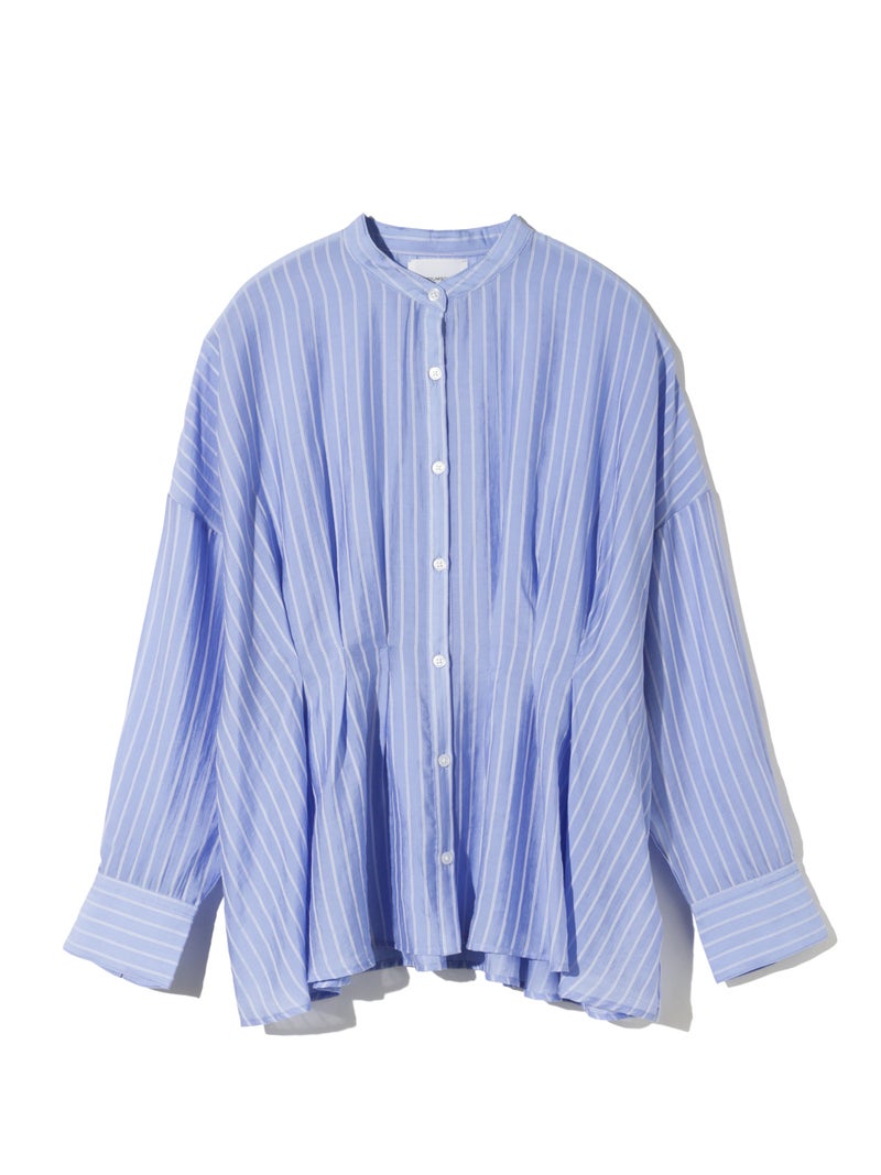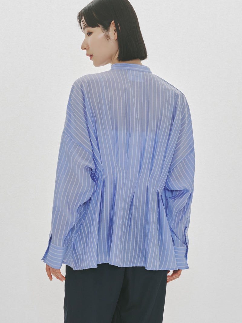 リラックス感と拘りのシルエットを兼ね備えたタックブラウス。ウエストタックがアクセントのオーバーサイズシャツです。腰回りをスッキリ見せ、メリハリのあるシルエットを表現しました。ドロップショルダーと長めの袖丈が抜け感を演出。シンプルながらも立体感のあるデザインで、着るだけでこなれた雰囲気になります。透け感のあるベース生地にドビー織りで立体的なストライプ模様を施したニュアンスのある素材が上品かつクリーンな印象も。さらっとした素材感でロングシーズン快適に着用していただけます。一枚着としてはもちろん、前を開けて軽い羽織としても活躍します。ワイドパンツを合わせたモードな着こなしや、デニムとも好相性。デイリーコーデに程よい大人の抜け感とスタイルアップを叶えます。カジュアルからきれいめまで幅広いスタイリングに対応可能な一枚です。