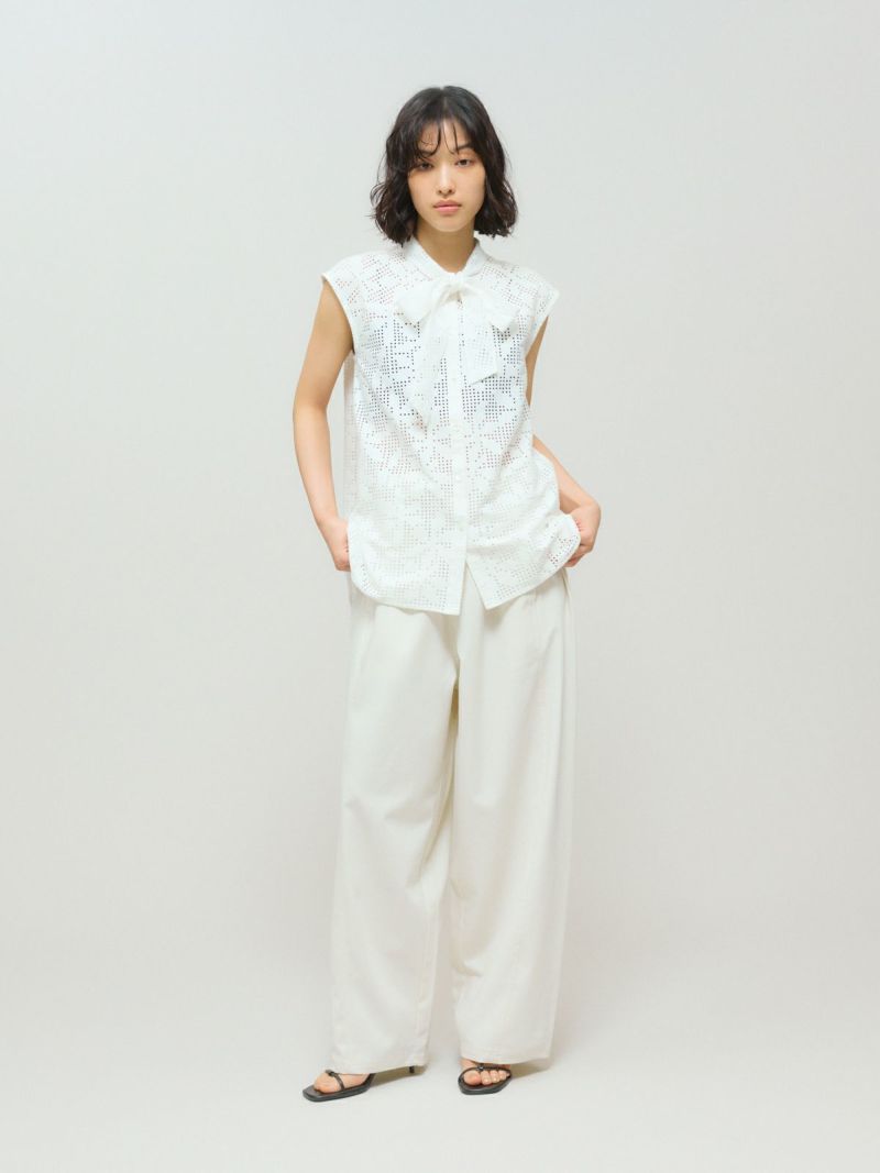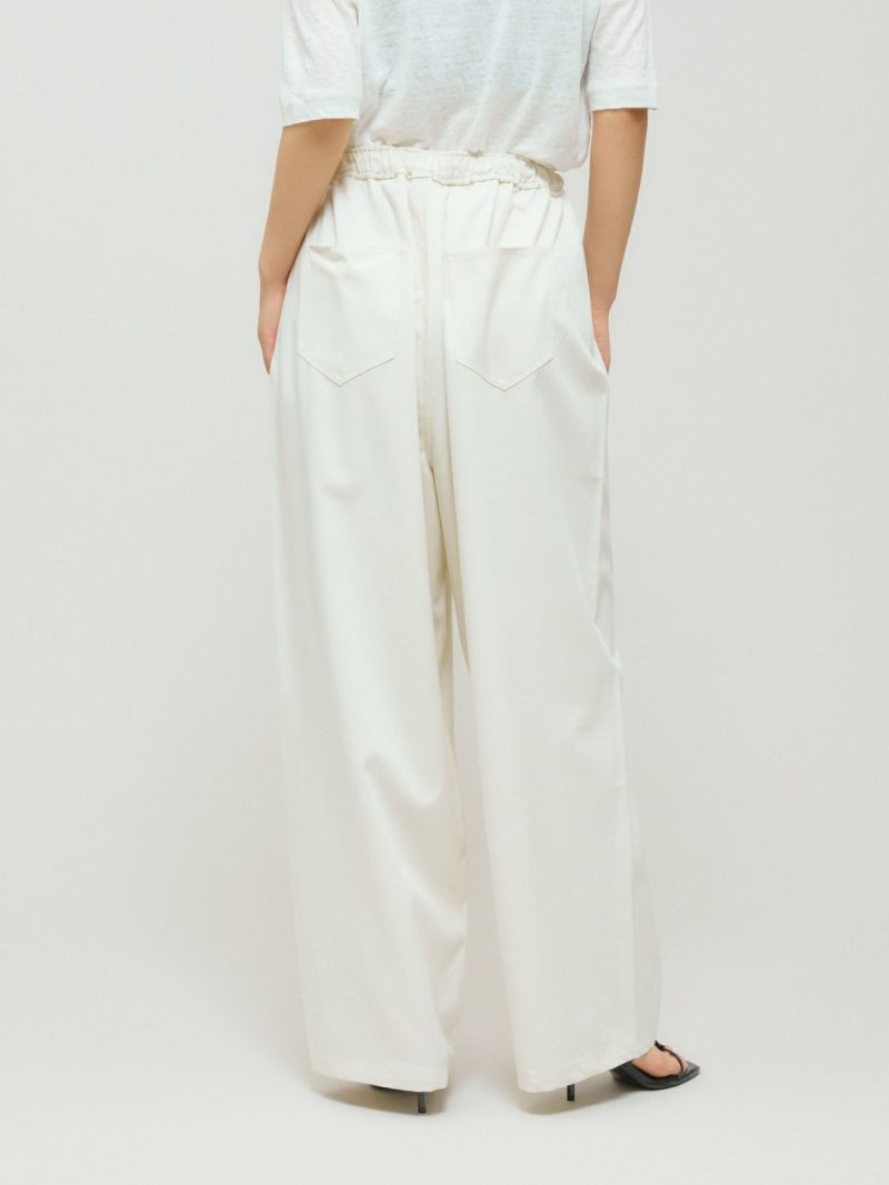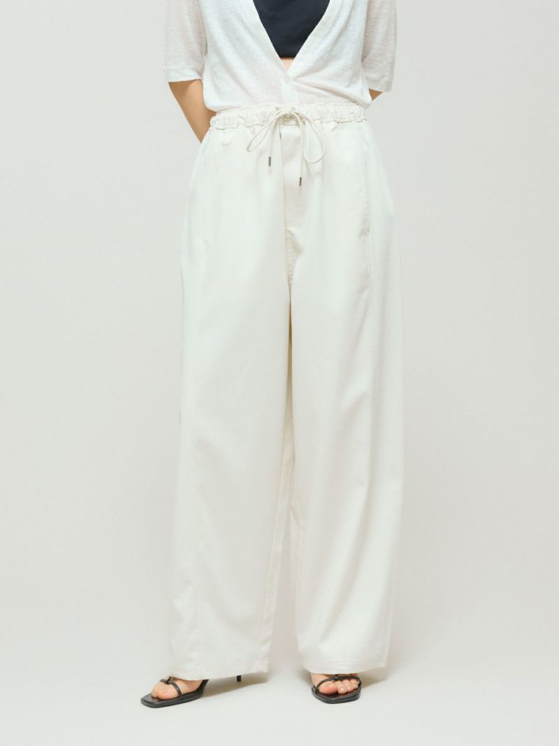 メンズライクでワークテイストなデザインに仕上げたリラックスイージーパンツです。カーブしたコクーンシルエットが特徴的。毛羽立ちの少ないツイル素材を使用。コットン生地ですが合繊ぽく上品な質感を感じていただける1枚です。ウエストはリラックス感のあるゴム使用に加え中紐調整付き。アイボリーも透けにくく着用しやすい色合いです。