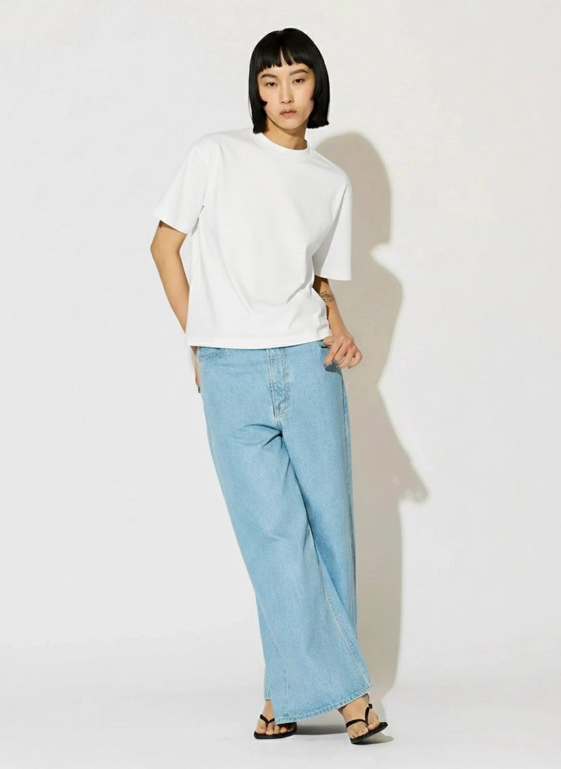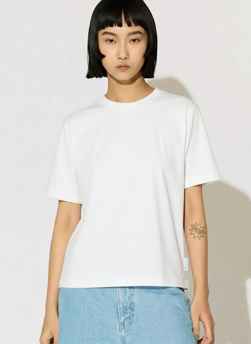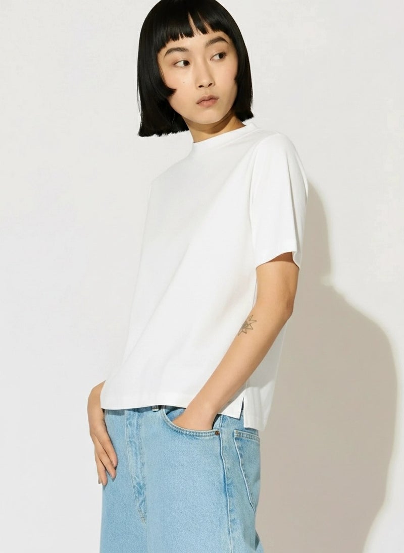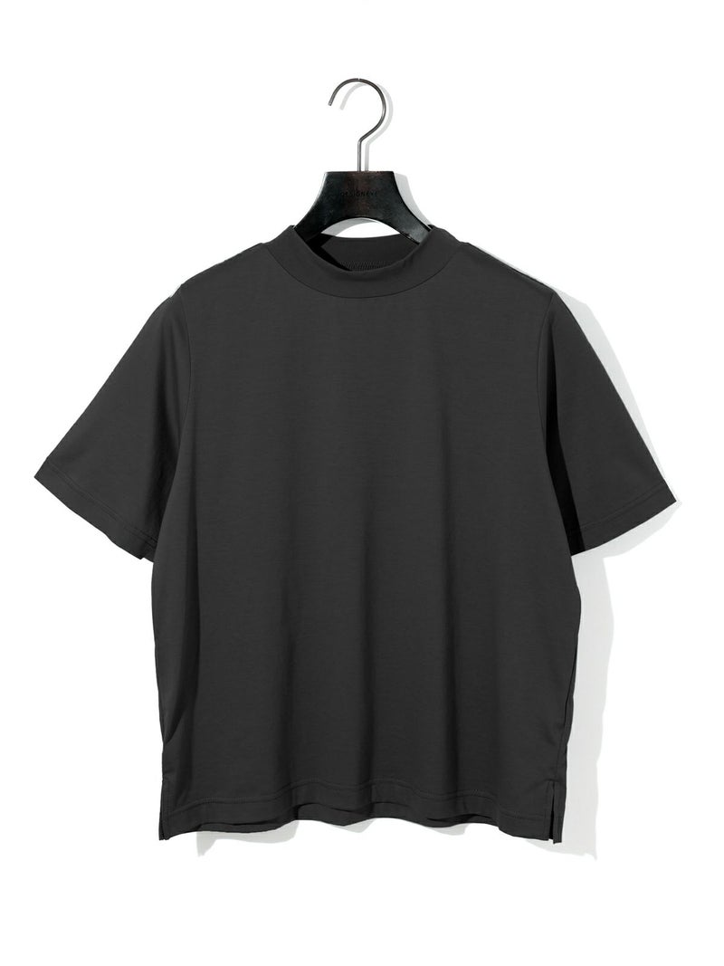 MIDIUMISOLID実績のあるコンパクトTシャツが今季も新色と取り入れ再入荷しました。高級綿である超長綿のコンパクトヤーンを使用。毛羽が少ないシルクのような光沢の天竺で、洗濯耐久性に優れたイージーケア素材です。接触冷感性も有るので夏の暑い時期にお勧めの1枚。伸びっぱなしにならないよう、襟にはキックバックのあるPU混のリブを使用。素材の特性を活かしたボトルネックのシンプルで着やすいTシャツです。
